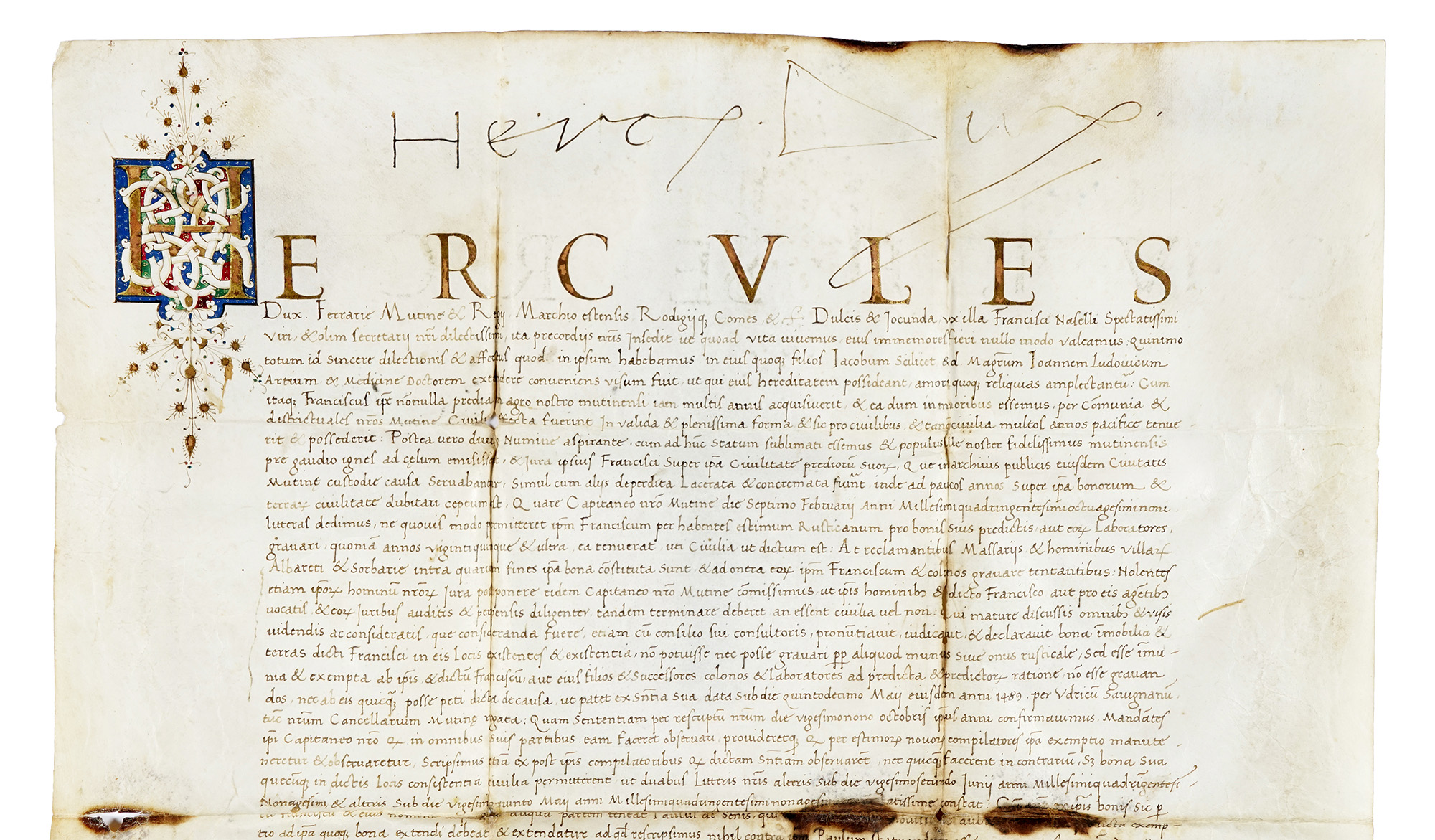 Privilegio pergamenaceo con firma autografa di Ercole I d'Este con capolettera miniato. Datato Ferrara 1494.