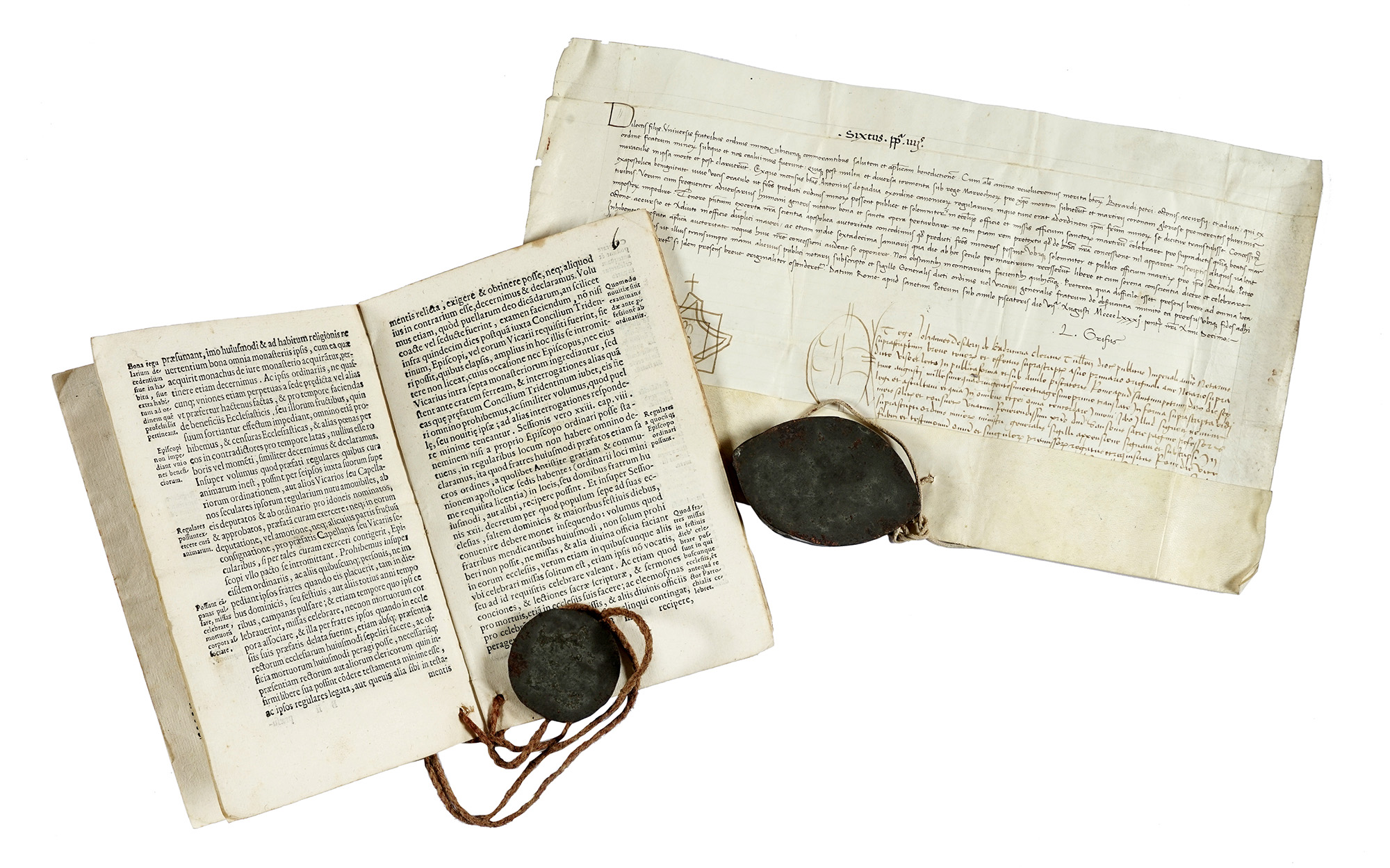 Manoscritti pergamenacei e cartacei a inchiostro bruno. 2 documenti a stampa con annotazioni manoscritte (scritture cancelleresche). Alcuni spaghi e sigilli conservati. Dimensioni varie. (9) La raccolta comprende: 1 copia pergamenacea di breve di papa Sisto IV, autenticata dal notaio Luca Raimenti, relativa ai frati e le suore del Terzo Ordine Francescano e il fisco (pagamento di gabelle). Spago conservato. Datata 1473 - 1 copia pergamenacea di breve di papa Sisto IV, autenticata dal notaio Paolo Albertini di Ferrara, diretta al Vicario Generale dell'Ordine dei Minori Osservanti relativa a privilegi e indulgenze. Sigillo ovale in ceralacca con base di cera e spago parzialmente conservato. Datata 19 dicembre 1480 – Breve pergamenacea di papa Sisto IV (copia autenticata dal notaio Giovanni Desiderio) diretta ai Frati dell'Ordine dei Minori. Conservato il sigillo ovale in teca di zinco e spago originale. Datata 22 febbraio 1482 - Raccolta a stampa di lettere pastorali di Clemente VII e Leone X relative alla Fabbrica di San Pietro (dal 1514 al 1531) con legatura in vacchetta - 1 bolla a stampa di papa Leone X che contiene la concessione dell'indulgenza plenaria per la Fabbrica di S. Pietro che doveva essere riedificata e ampliata (per cui si dovevano sostenere gravi spese). L'indulgenza venne estesa a coloro che si sarebbero recati a visitare la basilica dall'Italia, Gerusalemme, Dalmazia, Bosina, Corsica, Rodi, Austria, Boemia ecc. e nomina Cristoforo da Forlì per la raccolta delle offerte. Sigillo rotondo in ceralacca conservato in teca lignea legato ai fogli con spago originale. Datata 1517 - 1 esenzione dal pagamento delle decime in favore delle monache dell'Ordine dell'Osservanza a causa della povertà dei loro conventi da parte del vescovo di Segni. Conservato il sigillo ovale pendente in ceralacca in teca di zinco (parzialmente conservata) e legato con spago originale. Datata 27 giugno1542 - 1 copia pergamenacea autentica del notaio Vittore Maffei di un decreto dell'imperatore Carlo V relativo ad una supplica (trascritta) dei Frati Francescani dell'Osservanza della Dalmazia afferente alle incursioni dei Turchi e alle difficoltà che ne seguivano. Conservato il sigillo rotondo pendente in ceralacca in teca di zinco e legato con spago originale. Datata 1563 - 1 bolla a stampa di papa Pio V relativa alla confermazione della nuova concessione di privilegi a favore di tutti gli Ordini Mendicanti (Roma, presso gli eredi di Antonio Bladi 1567) con copertina ricavato da un foglio pergamenaceo di un codice giuridico del XIV secolo. Sigillo rotondo pendente in ceralacca conservato in teca di zinco e legato con spago originale alla carta e alla copertina. Non esportabile all'estero - Not exportable abroad.