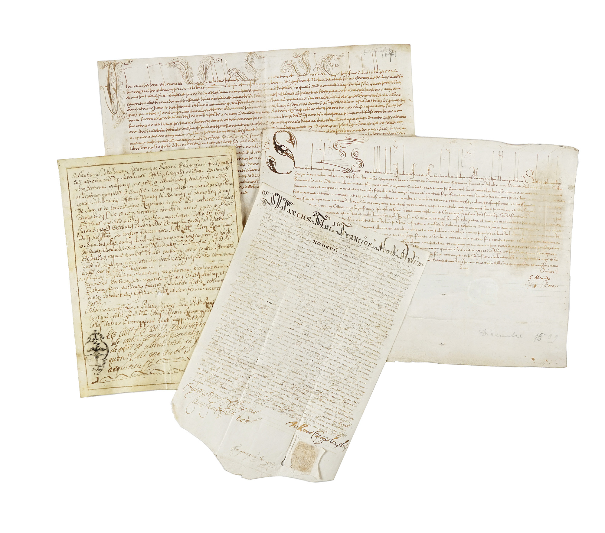 Manoscritti pergamenacei a inchiostro bruno. Testi in latino e italiano. Dimensioni varie. (35) La raccolta comprende: 1 investitura di beni "de Cella" (Villa Cella, Reggio Emilia) datata 1291, 1 documento veneziano relativo a un comando militare a Creta (1571), concessioni di indulgenze, bolle, nomine, privilegi, vari atti notarili ecc.
