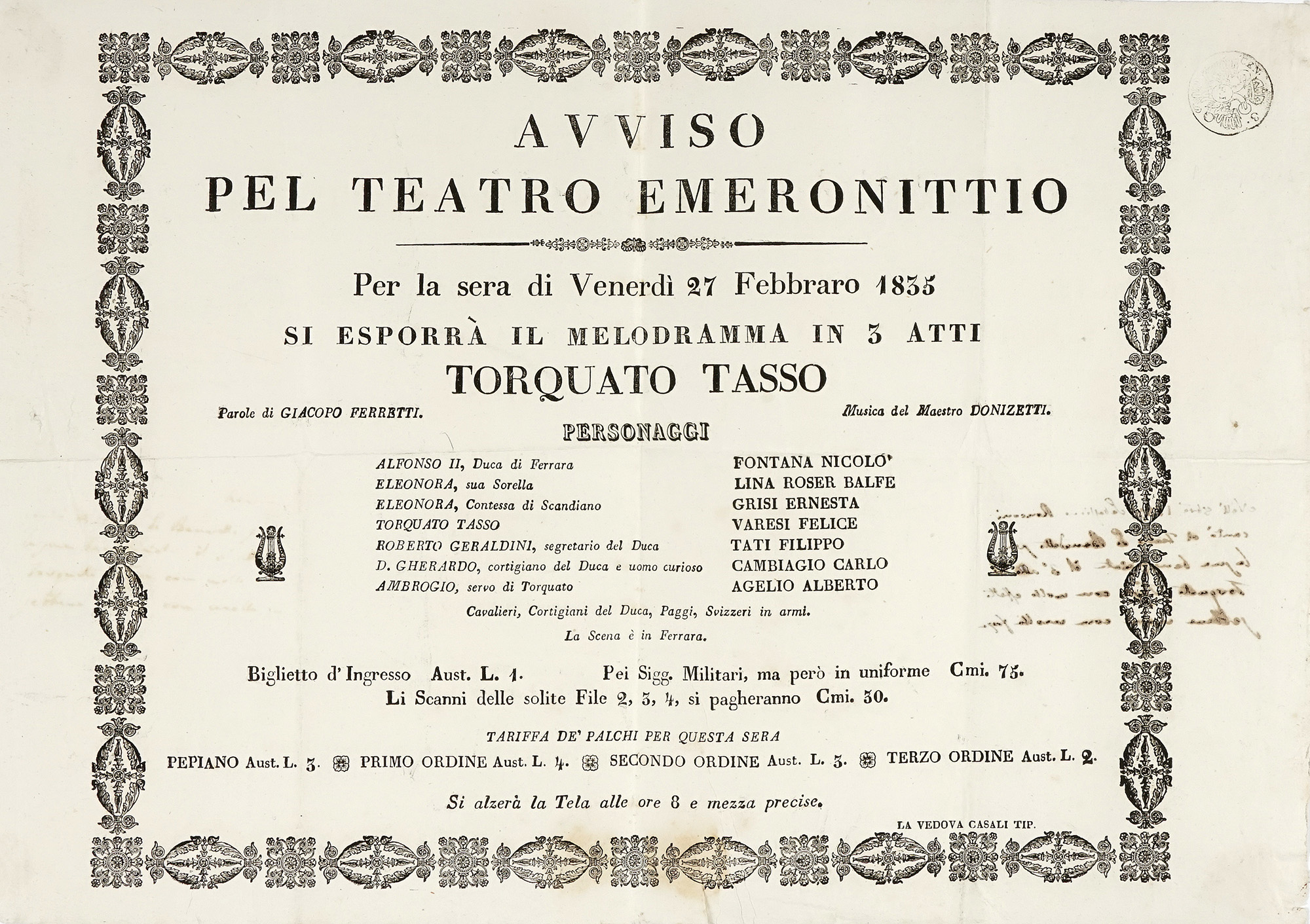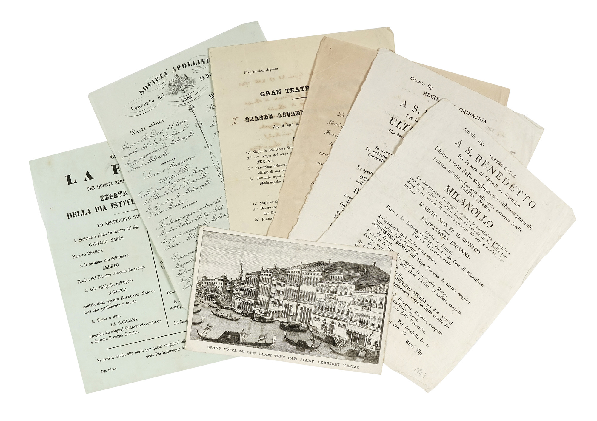 Documenti manoscritti e a stampa. Nel lotto anche 1 incisione del Grand Hotel du Lion Blanc tenu par Marc Ferrighi Venise. Dimensioni varie. (30) La raccolta comprende: 1 Avviso per Teatro Emeronittio (poi Teatro Malibran) relativo alla rappresentazione dell'opera Torquato Tasso di Donizetti. Datato 27 febbraio 1835 - 2 inviti al Teatro Gallo a S. Benedetto per i concerti del 19 e del 21 dicembre [1843] delle sorelle violiniste Teresa e Maria Milanollo (con programma dei concerti) - 1 invito datato 11 dicembre 1843 relativo ai concerti delle sorelle Milanollo - 1 programma di una Grande Accademia Istromentale del Gran Teatro La Fenice. Datato 14 dicembre 1843. Le interpreti sono le violiniste Teresa Milanollo e Maria Milanollo - 1 programma di concento della Società Apollinea. Datato 22 dicembre 1845. Tra le interpreti, Nina Montan e le violiniste Teresa Milanollo e Maria Milanollo - 1 piccolo manifesto su carta azzurrino relativo ad una serata a beneficio della Pia Istituzione d'orchestra. Datato 25 marzo 1848 - 3 circolari del Gran Teatro La Fenice. Datate 1843-1857 - 12 circolari con ordini del giorno. Carte intestate La Direzione / della / Società Proprietaria / del / Teatro La Fenice. Datate 1877-1880. Tra gli argomenti trattati anche una proposta dell'Impresa del Teatro alla Scala fratelli Corti di dare alla Fenice alcune rappresentazioni d'opera con Adelina Patti e il tenore Nicolini (La Traviata, Faust, Il Barbiere di Siviglia e il Trovatore) – 2 documenti manoscritti relativi alla proprietà dei palchetti del Teatro La Fenice - 1 dichiarazione del Teatro La Fenice in favore del Primo Violoncello Francesco Zanichelli, firmata da A. Tornielli condirettore del teatro. Su carta intestata. Datata 11 dicembre 1891 – 3 incisioni a colori che rappresentano scenografie dall'opera Zoraide, Tancredi e Tebaldo ed Isolina - 1 lettera autografa del pittore Bernardino Palazzi densa di notizie sulla vita artistica e culturale a Venezia. Datata 5 febbraio 1946.