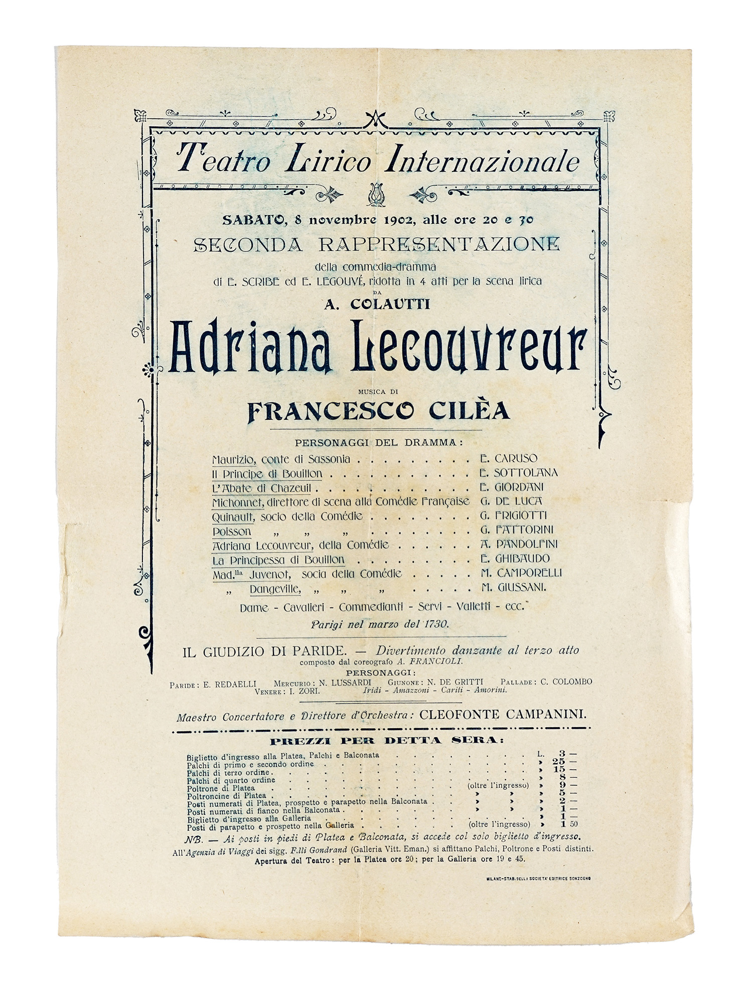 Raccolta di firme autografe di cantanti, librettisti e musicisti su libri, insieme ad una locandina di Adriana Lecouvreur in cui canta Enrico Caruso. Datati 1902-anni '90.