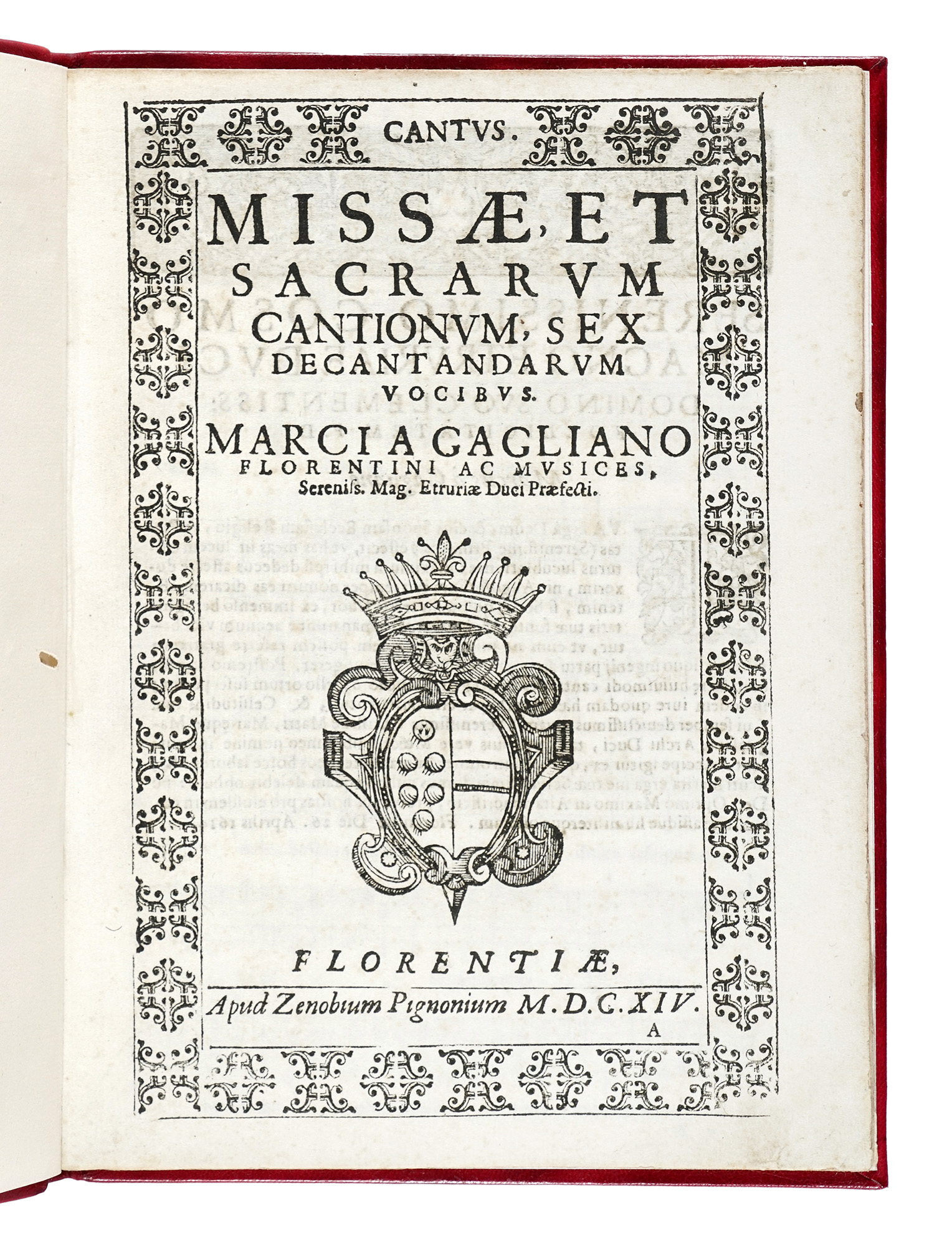 1 volume in 4° (230x170 mm). Conservato il libro parte del Cantus. Pagine 24. Al verso del frontespizio la dedicatoria al Serenissimo Cosmo / Magno Etruriae Duci / [...]. Florentiae Die 26 Aprilis 1614. Index in fine (p. 24). Capilettera incisi. Carte molto ben conservate. Ex Libris Bruno Lusini. Legatura in pelle rossa moderna con filetti in oro, che riproduce le armi della famiglia Medici. (1) Contiene: Veni Sancte Spiritus – Sicut Cedrus – O vos omnes – Ave Maria – Clamemus – Duo Seraphin – Popule meus – Quo raperis – Ecce quam bonum – Puer qui natus est – Regina coeli – Adoramus te Christe – Ne Timeas Maria – Hodie – Faustinus – Kyrie – Goria in excelisi Deo – Credo – Sanctus Agnus Dei. Marco da Gagliano (1582-1643), una delle personalità di primo piano della Firenze di inizio '600, autore di melodrammi, divenne Maestro di Cappella alla corte dei Medici. Fu tra i fondatori dell'Accademia degli Elevati, insieme a Ottavio Rinuccini e Jacopo Peri, con i quali spesso collaborò per la composizioni di balli e mascherate per da eseguirsi durante i periodi di carnevale alla corte dei Medici.