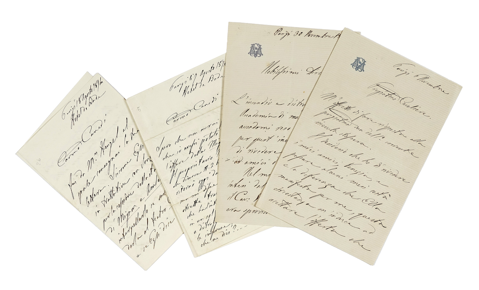Manoscritti a inchiostro bruno. Ottima conservazione. Dimensioni varie. (4) Lettera datata Parigi 30 novembre 1866 (scritte 3 pagine): L'incendio e distruzione dell'Accademia di musica di New York avendomi reso libero di impegni quest'inverno. Mi decisi di rivedere la mia famiglia ed amici in Europa. Nel mio soggiorno a Parigi intesi dal mio Maestro ed amico il Cav. Verdi che il teatro la fenice era sprovisto [sic!] di Maestro Concertatore e direttore d'Orchestra. L'ozio essendomi a peso, vengo a chiedere a questa Nobile Direzione, se è libero, il posto sudetto per la stagione di Carnevale e Quaresima [...]. Lettera inviata datata Parigi 6 novembre s.a. (scritte 2 pagine): M'affretto di fare risposta alla pregiat.ma del 1° corrente ricevuta stasera. Il desiderio che ho di rivedere i miei amici, Venezia, e passare alcuni mesi costà e la deferenza che Ella manifesta per me, questa circostanza m'induce ad acettare [sic!] l'offerta che ella mi fa, però per il solo Carnevale e Quaresima. Attendo la regolare scrittura per sapermi regolare sul tempo che devo trovarmi alla piazza per le prove necessarie [...] E. Muzio. 30 Rue Druot Paris. Due lettere inviate al Car.mo Canedi [Gaetano, architetto teatrale] datate Parigi 7 e 8 agosto 1874: Spero che non avrai pensato che io avessi potuto dimenticare l'affare della Mignon. Il proprietario Monsieur Heugel [Jacques-Léopold - editore] [...] mi dice che era in strette trattative col sig. Sonzogno che ha l'intenzione di mettere in un sol fascio Ricordi e Lucca e distruggerli, cosa della quale le imprese si lamenteranno [...] se l'affare incamminato non avesse effetto, ei allora tratterebbe col tuo mezzo colla casa Lucca. Il signor Sonzogno comperò già operette di Ofenbach [sic!], Lecoc [Charles Lecocq] ed altri, ma l'arte Italiana, la vera arte, non ha a temer nulla dal tentativo che si fa di introdurre questo nuovo mal francese in Italia [...] E. Muzio - Fui da M. Heugel al quale consegnai la tua lettera. Siccome egli è in trattative con Sonzogno per la cessione di Mignon e Amleto vuole interpellarlo se andrebbe bene darla al teatro Castelli (teatro Milanese progettato da Canedi) [...] se dice di no allora [...] entrerà in trattativa alla casa Lucca per un affare sulle basi di quello che questa casa aveva con M. Choudens [Antoine, editore musicale] [...] E. Muzio. La lettera si conclude con l'indicazione del successivo indirizzo di Muzio: Everett House New York. Una curiosità: a Muzio si deve il contatto parigino tra Verdi e il grande pittore Giovanni Boldini, che immortalò il Maestro nel celeberrimo ritratto con cappello a cilindro e sciarpa bianca.