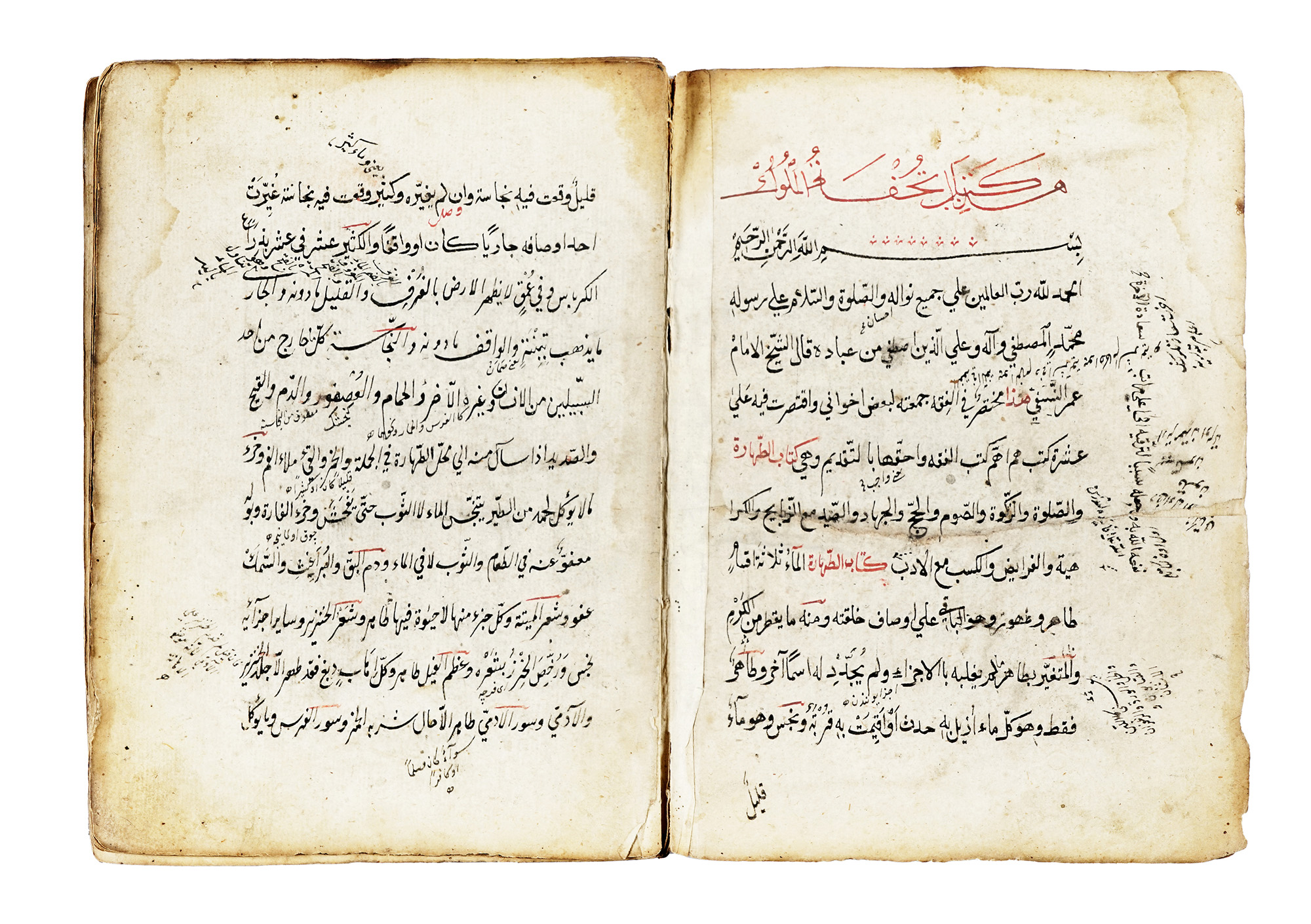 Codice manoscritto ottomano in lingua araba su carta vergellata chiara di mm 205x145 per 83 carte totali [1+47+1+34], con specchio di scrittura misurante mm 145x90 per la prima opera, mm 140x60 per la seconda. Testo arabo vergato in uno stile naskh orientale per il primo testo, e in una grafica più obliqua, tendente alla mano nasta'liq di area persiana per il secondo lavoro. Testo distribuito su 11 righi a facciata in entrambe le opere. Titolature rubricate, alcuni righi sovralineati in rosso. Il Tuhfat al-Muluk è un'agile opera propedeutica agli elementi del diritto islamico (fiqh) di scuola (madhhab) sunnita hanafita, mentre il Mu'addil al-Salawat consiste in u saggio sulla preghiera islamico-sunnita. Specchio di scrittura incorniciato (jadwal) presente soltanto al secondo trattato e consistente in una semplice linea rossa di delimitazione dello spazio scritto. Occasionali note a margine di varia natura, sia in arabo che in turco osmanico, concentrate intorno al primo dei due testi. Al contropiatto anteriore interno si notano prove di penna; varie stelle talismaniche a matita azzurra segnate alla doppia pagina bianca di intervallo fra i due trattati. Bella legatura in cartone rinforzato ricoperta in pelle scura, con doppia cornice e decorazione centrale impressa, formata da 25 decori circolari disposti a losanga, parzialmente rovinata agli angoli inferiori e scolorita appena al di sotto dell'area centrale al piatto anteriore. Condizioni di conservazione discrete nonostante la presenza di estese gore d'acqua, in particolare alla parte superiore esterna degli ultimi fascicoli; macchie, occasionali ingiallimenti e danni materiali di trascurabile entità, che in nessun caso pregiudicano la leggibilità del testo. (1) Questo manoscritto devozionale, verosimilmente destinato all'uso individuale oppure di qualche confraternita religiosa provinciale (non sufica), testimonia dell'aderenza, o quanto meno dell'interesse, del suo committente per la scuola giuridico-filosofica tradizionale dello hanafismo, uno degli antichi indirizzi della giurisprudenza tradizionale islamica di osservanza sunnita e particolarmente incoraggiata dalle politiche sultaniali ottomane lungo tutta l'età moderna. La scelta di accorpare in un unico manoscritto due autori specializzati in ambiti quali le normative della giurisprudenza e la letteratura devozionale, evidenzia la persistenza di una percezione unitaria, o quanto meno complementare, di tali ambiti personali e professionali nella civiltà ottomana sunnita.