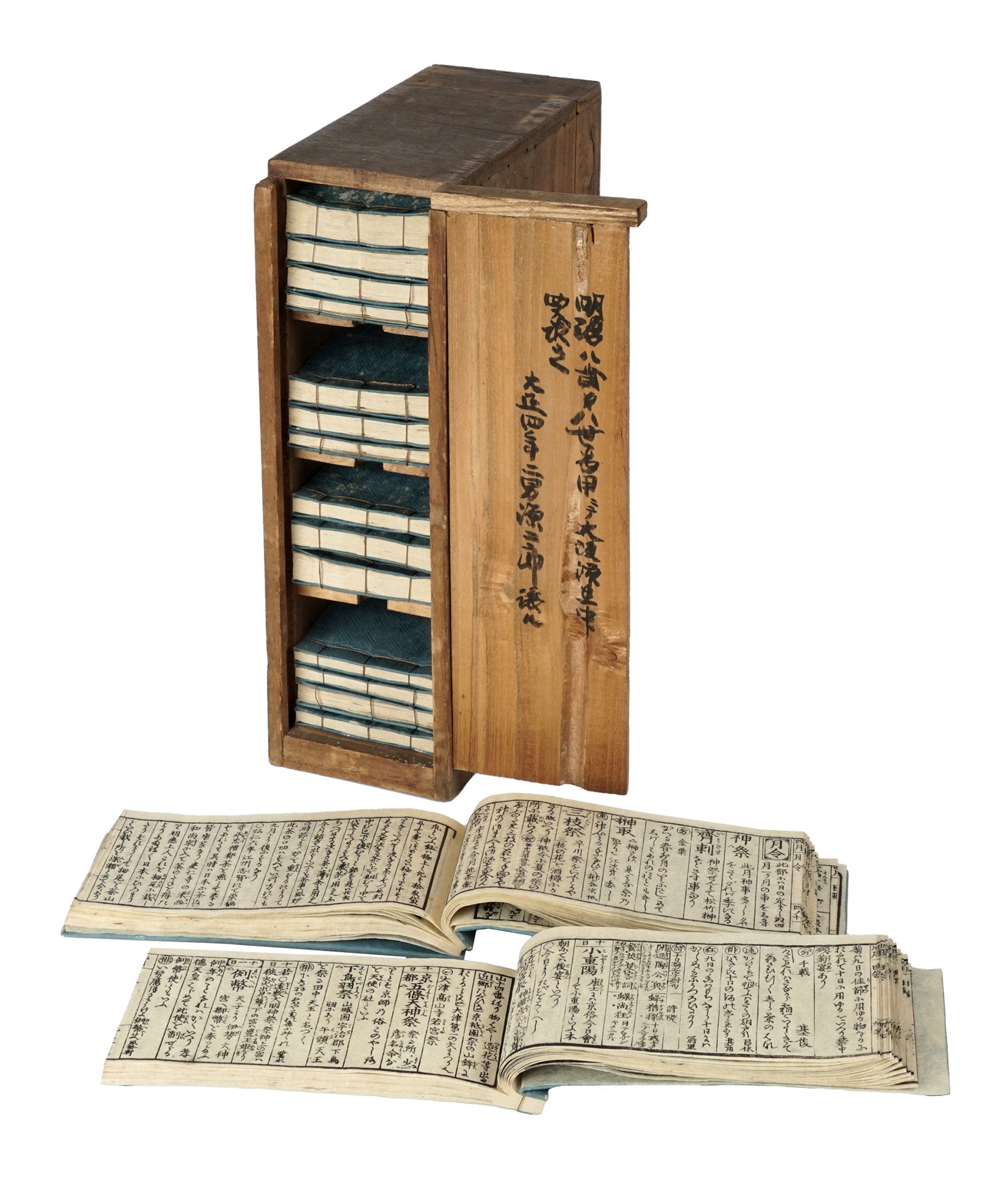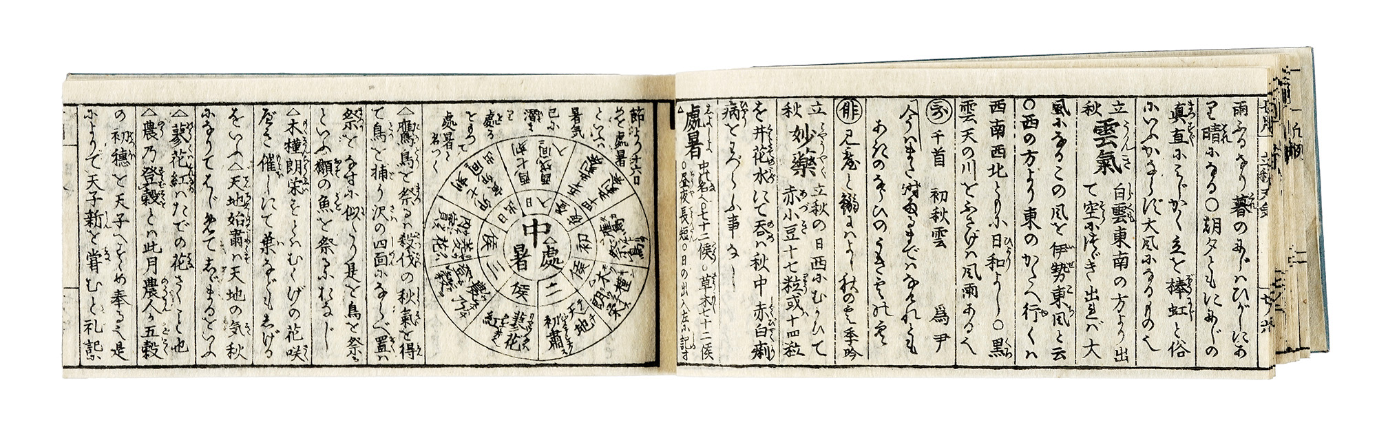 16 volumi in-12° oblungo. Opera completa, conservata nella scatola lignea originale, di mm. 310x200x100 ca., suddivisa in scomparti interni atti ad allocare i volumi a gruppi di quattro, composta in 16 volumi, ciascuno al foglio di mm 185x80, con specchio di scrittura di mm 150x70 ca.; testo giapponese all'inchiostro nero stampato in xilografia mokuhanga e distribuito mediamente su 20 colonne a pagina. I volumi si compongono dei seguenti numeri pagine: I: 93 [1+92]; II: 112; III: 112; IV: 202; V: 141 [1+140]; VI: 104; VII: 104; VIII: 131 [130+1]; IX: 51 [1+50]; X: 60; XI: 99 [98+1]; XII: 68; XIII: 83 [82+1]; XIV: 42; XV: 71 [70+1]; XVI: 55 [54+1]. Quanto alla distribuzione delle 94 illustrazioni, esse sono ripartite come segue: vol. I (8): pp. 10, 14, 16, 17, 18, 24, 31 e 61; II (5): pp. 7, 8, 10, 12 e 45; III (11): pp. 7, 9, 11, 12, 17, 87, 91, 94, 95, 96 e 98; IV (16): pp. 23, 27, 30, 32, 42, 43, 47, 54, 55, 57, 58, 108, 109, 164, 174 e 184; V (11): pp. 12, 16, 19, 28, 87, 90, 91, 94, 96, 126 e 130; VI (13): pp. 9, 11, 12, 15, 17, 30, 58, 60, 61, 62, 67, 68 e 69; VII (3): pp. 9, 11 e 12; VIII (12): pp. 9, 12, 13, 14, 61, 64, 66, 73, 85, 88, 96 e 100; IX (4): pp. 6, 10, 14 e 15; X (4): pp. 5, 7, 8 e 58; XI (3): pp. 9, 12 e 14; XII (4): pp. 5, 8, 9 e 32; XIII, XIV, XV e XVI non contengono invece alcuna illustrazione. Copertine in cartoncino azzurro a legatura giapponese in ciascun volume, tutte in buono stato. Le condizioni generali sono molto buone: alcune copertine sono prive dell'etichetta con il titolo e il numero del volume e su altre risulta in parte abrasa o poco leggibile; rilegature talora sfilacciate. Le pagine interne sono nel complesso assai ben conservate, senza difetti particolari. (16) L'opera descrive e analizza il mutare delle stagioni durante l'anno lunare, in sinergia con il calendario astrologico cinese e i relativi esagrammi dell'I-Ching (il "Libro dei Mutamenti" cinese). Gli autori pongono in relazione la ciclicità stagionale come è evidente nei cambiamenti naturali (per fiori, alberi, insetti, uccelli, etc., per gli eventi atmosferici e per il mutare della volta celeste), con stili di vita, usanze e finanche abitudini alimentari dell'epoca, fornendo altresì a sostegno di tipo autoriale citazioni da opere letterarie quali la poesia cinese classica, e quella giapponese nelle forme-genere metriche di waka, renga e altro. Opera molto consultata e apprezzata, diverse sue copie sono conservate alla Biblioteca Nazionale di Letteratura Giapponese e presso varie università, in considerazione del rilevante interesse culturale che riveste. Data e luogo di pubblicazione, pur rimontando al tardo periodo Edo, non risultano unitari, bensì ricomposti lungo un ampio lasso di tempo di quasi 40 anni. Più specificamente, i 4 libri I, II, III e "mese lunare" per la "primavera" furono stampati a Osaka nel 1804 da editori vari; per i libri IV, V, VI e "mese lunare" per l'"estate" il dato risulta mancante; la stampa dei libri VII, VIII, IX e "mese lunare" riferito all'"autunno" avvenne sempre a Osaka nel 1806, mentre i libri X, XI, XII e "mese lunare" per l'"inverno" fu approntata tra Tokyo e Osaka per essere ultimata soltanto nel 1842.