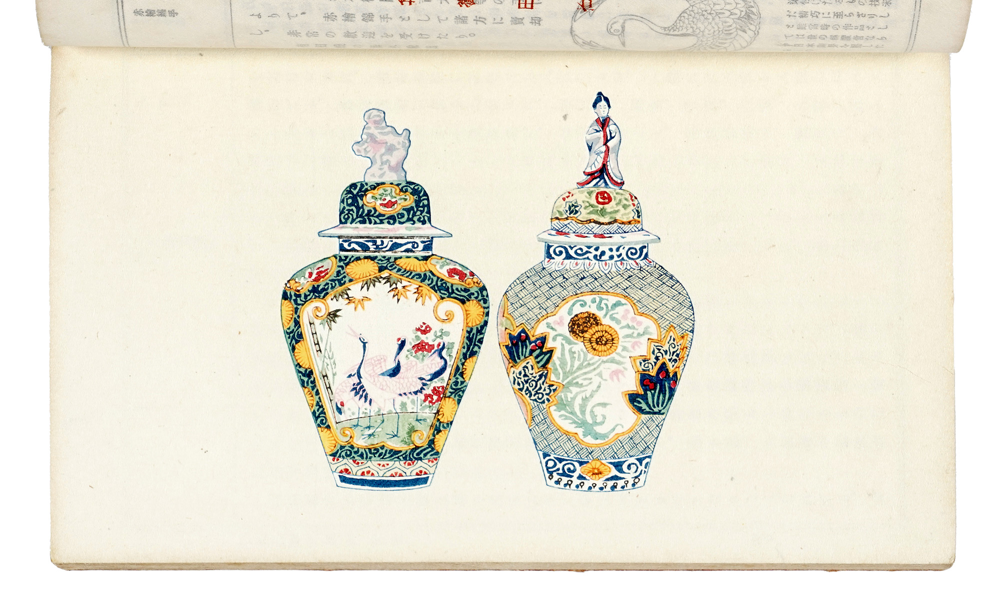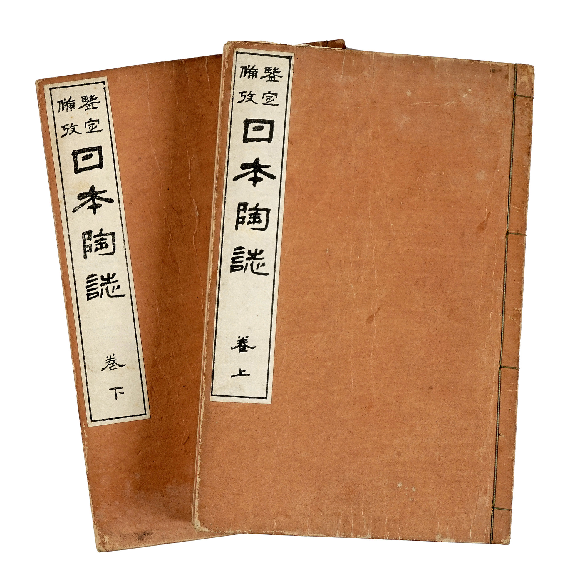 2 volumi in-4°. Coppia di volumi a stampa xilografica (vol. I di pgg. 135 [1+134]; vol. II di pgg. 164) eseguiti secondo il metodo mokuhanga, misuranti al foglio mm. 225x150, con specchio di scrittura di mm. 195x120; testo giapponese distribuito su di una media di 16 colonne di testo a facciata, stampato con inchiostro nero. Il frontespizio del vol. I è a colori ed espone i dati editoriali; presente un timbro di possesso. Illustrazioni sia in bianconero che a colori si ritrovano su ambedue i volumi: più precisamente, al vol. I, pg. 31, è riprodotto un reperto archeologico, presumibilmente dell'età della pietra; a pag. 106 spicca la pregiata illustrazione a colori di un vaso di ceramica per conservare le foglie da tè, cotto con una tecnica imitante la smaltatura cinese tipica del periodo Jian'an. Al vol. II, pg.20, si illustra la tecnica per l'ottenimento della particolare tonalità di blu-grigio e di azzurro chiaro utilizzate in ceramica, e a pg. 58 è illustrato un vaso cinese che, passato in mani olandesi, si trova oggi conservato al British Museum di Londra. Rilegato con copertina giapponese watoji. Entrambi i volumi sono assai ben conservati. Alcune sottolineature a penna rossa e qualche appunto a matita, verosimilmente di un precedente proprietario. (2) Nella prefazione l'Autore dichiara che quest'opera va considerata come un trattato generale sulla ceramica giapponese, per poi passare a esaminare la cronologia degli elementi utili a comprendere l'evoluzione dell'arte ceramica, ad esempio elucidando origini e funzionamento delle fornaci nelle diverse provincie nipponiche, registrando le caratteristiche dei prodotti, e descrivendo il percorso storico della ceramica partire dalle origini cinesi e coreane fino alle dinamiche del suo sviluppo dopo essere state introdotte in Giappone.