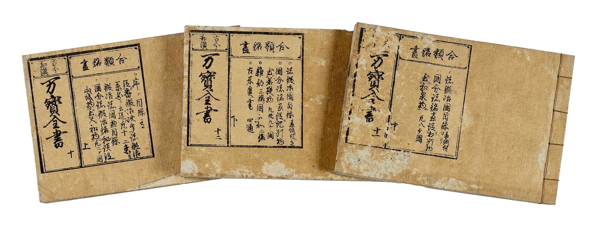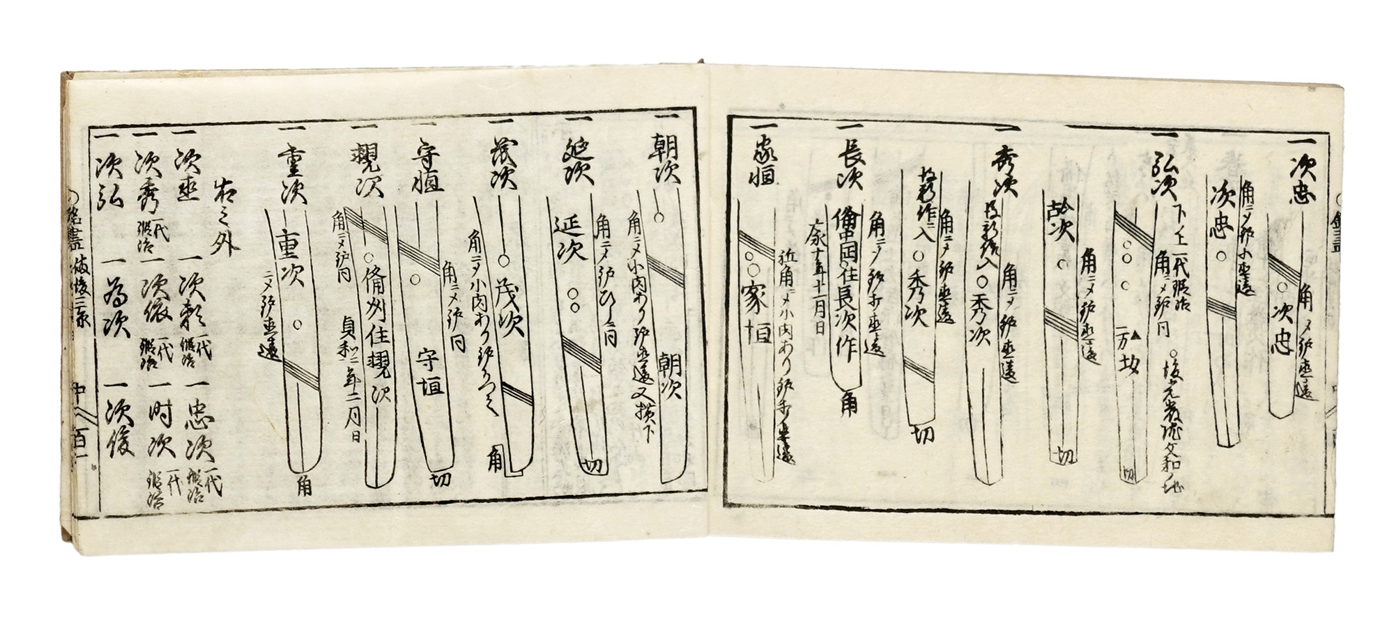 3 volumi in 8° piccolo. Trittico di volumi consecutivi integri a stampa, composti con la tecnica della xilografia nipponica mokuhanga e parte di un'opera di enciclopedica in 13 volumi. Ognuno dei libri misura al foglio mm 160x110, con uno specchio di scrittura di mm 140x88 ca.; testo giapponese all'inchiostro nero distribuito su di un numero irregolare di colonne. I volumi di questa copia comprendono il seguente numero di pagine: vol. I: 103 [1+102]; vol. II 81 [1+80]; vol. III 99 [1+98], nelle quali annoveriamo una notevole quantità di illustrazioni tecniche sulle parti componenti delle katana e talune procedure di fabbricazione, assemblaggio e i passaggi formali dell'apposizione della "firma del forgiatore". Il vol. I (ossia il vol. 10) presenta illustrazioni alle pp.19-23; 27-30; 34-39; 41-46; 49-63; 65-91 e 94-103; il vol. II (vol. 11) alle pp. 2-17; 19-30; 32-33; 35; 37-39; 41; 45-51 e 55-71; il vol. III (vol. 12), infine, reca immagini alle pp. 3-8; 10-16; pp. 21-28;.30 e 30-35; 37; 42-43; 46; 48-53; 55-61; 63; 65-66; 68-69; 72-77; 81; 83-92; 95 e 97-99. Stato di conservazione generalmente buono: trascurabili segni del tempo e piccoli guasti di tarlo. Copertine a legatura giapponese, in buono stato. (3) L'opera consiste in una trattazione tecnico-enciclopedica illustrata con intento di introduzione e di guida al mondo delle tradizionali spade katana, colmo di preziosa conoscenza tecnica come pure di rilevanti valori culturali e simbolici, ad oggi estremamente popolare sia in Giappone che in Occidente. I volumi 10, 11 e 12 offrono un elenco completo dei capolavori antichi e moderni della tecnica giapponese dell'arte della spada.