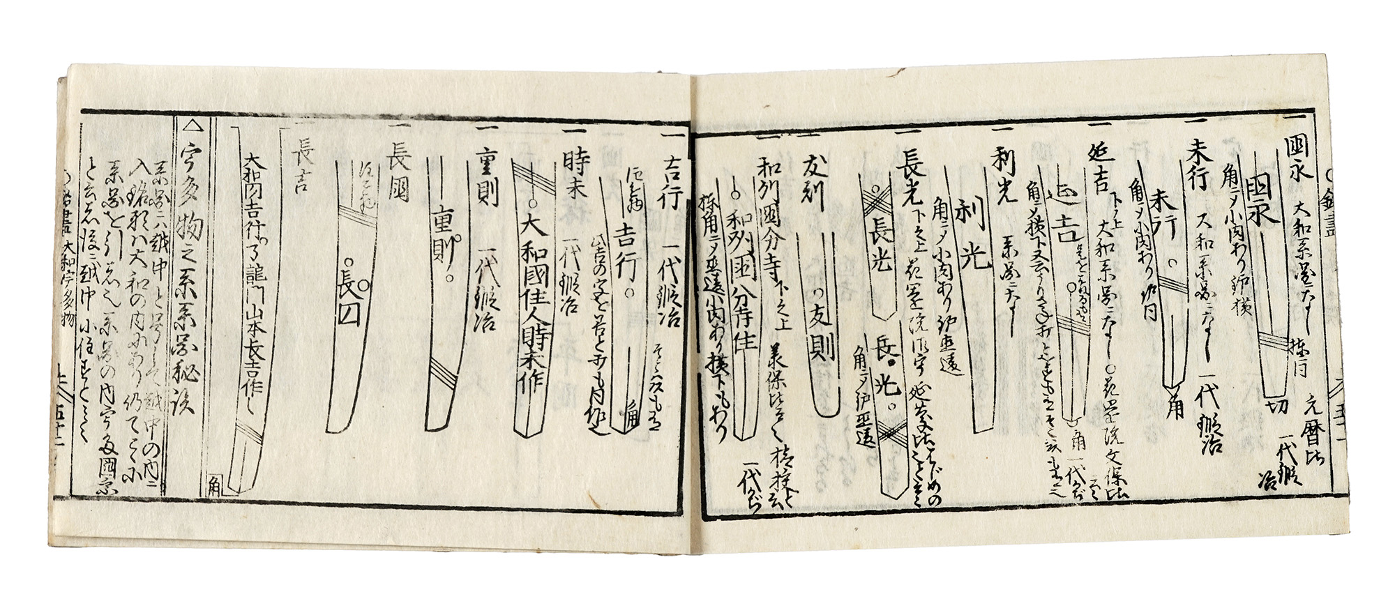Kokonwakan Banpozensho: “Guida illustrata alla katana”, nei voll. 10, 11 e 12 (18). 1818 (tarda era Edo); l’editore e il luogo di stampa di questa edizione risultano ignoti.