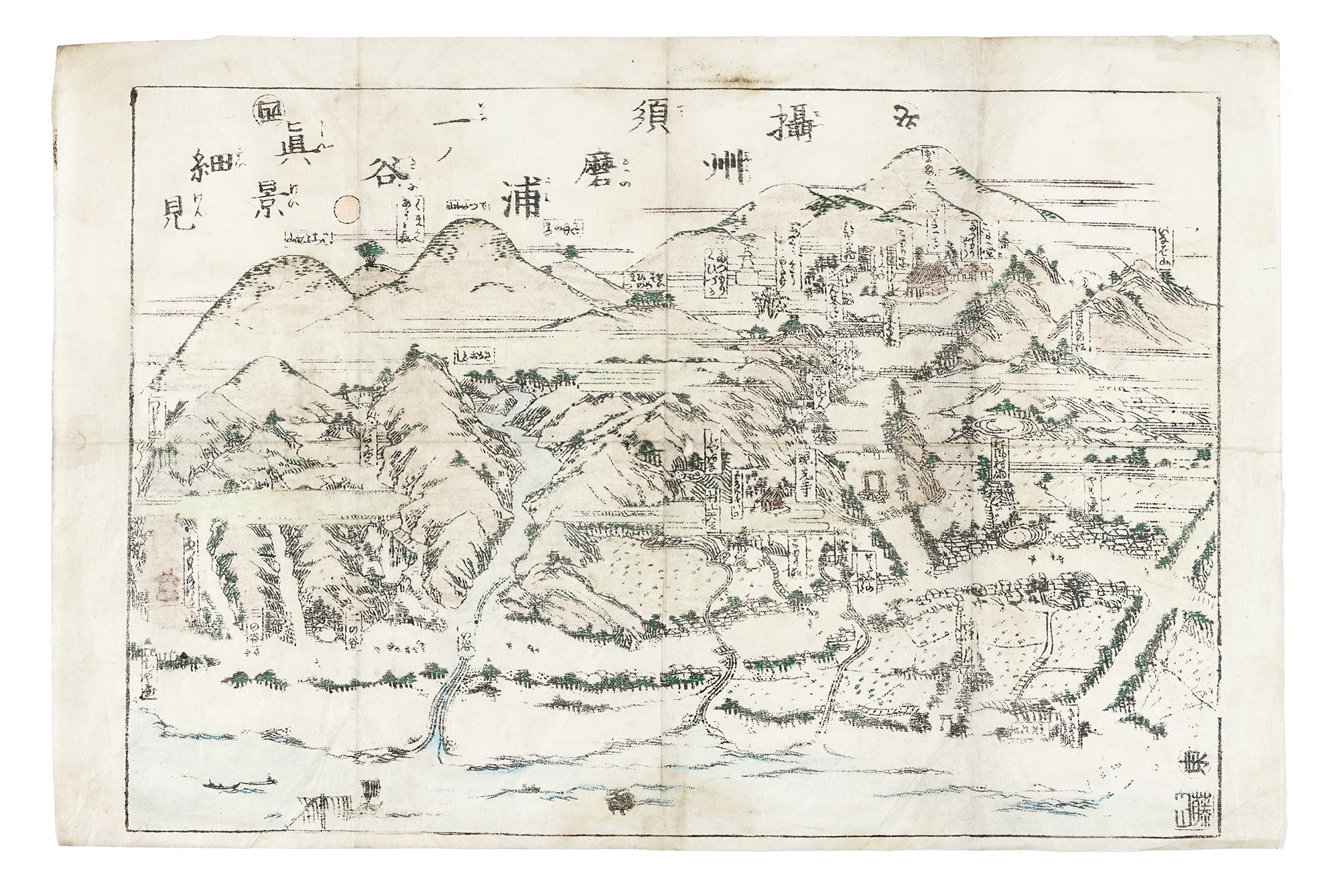 Foglio in carta di riso stampato su blocco di legno con tecnica xilografica giapponese mokuhanga. Misura al foglio mm 470x310, con stampa entro lo specchio misurante mm 415x285. La mappa, nello stile rappresentativo nipponico, presenta accurati profili dei rilievi e dei corsi d'acqua, delle strade e dei sentieri, come pure degli edifici e delle opere fortificate con approccio essenzialmente disegnativo e pittorico. Leggera coloritura a matita in rosa tenue, azzurrino e giallo chiaro. Indicati a stampa i punti cardinali e varie legende racchiuse in cartigli verticali all'interno della mappa, il cui perimetro esterno è costituito da una semplice linea continua nera. Preservata in buono stato di conservazione, al netto di alcuni sbiadimenti. (1) La battaglia del Forte di Ichi-no Tani, località strategica e ben munita ubicata non lungi dall'attuale città di Kobe, fu combattuta nel febbraio 1184 tra l'esercito attaccante del clan Minamoto e quello, in difesa nel forte, del clan rivale Taira, due preminenti famiglie samuraiche del periodo Heian che si stavano affrontando sanguinosamente nella cosiddetta "guerra Genpei" (1180-1185). L'episodio dell'assedio e dell'espugnazione del forte, che vide un susseguirsi di atti di eroismo da entrambe le parti, contribuì in modo determinante alla disfatta del clan Taira e aprì la strada alla fondazione del primo shogunato samuraico, quello dei Kamakura, da parte di Minamoto-no Yoritomo.