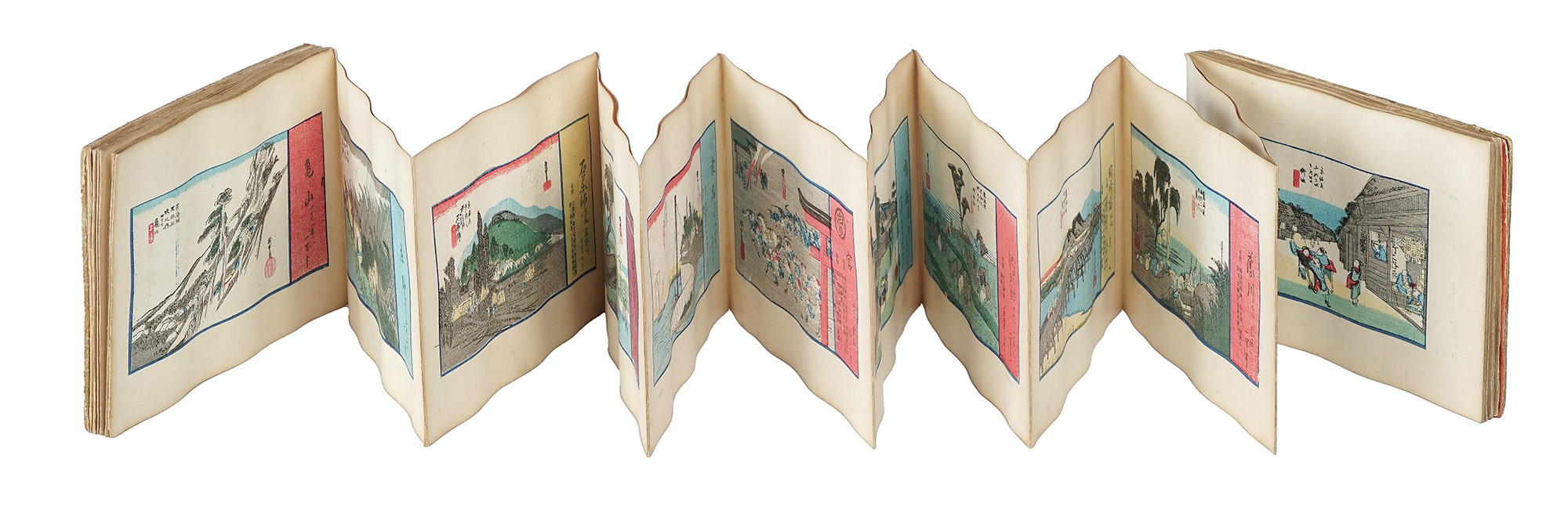 Volume cartaceo a stampa xilografica a colori con tecnica mokuhanga completo di 61 carte [60+1], misuranti al foglio mm 180x130, con illustrazioni di mm 150x75, corredato di illustrazioni su tutte le carte, ad eccezione di quella iniziale occupata da una tabella-indice. Una fascia sul lato minore destro di ciascuna pagina reca l'iscrizione descrittiva della relativa stazione della via. Le 53 Stazioni del Tokaido si susseguono secondo l'ordine e l'iconografia della prima edizione (come si evince dall'immagine della stazione di partenza di questo viaggio da Edo a Kyoto: Nihonbashi); tra le stazioni 12 (Mishima) e 13 (Numazu) è inserito un pannello con calligrafia in inchiostro verde su sfondo bianco e grigio; analogo pannello calligrafico in verde tra la stazione 26 (Kakegawa) e 27 (Fukuroi); altro inserto di pannello calligrafico, stavolta su sfondo bianco e azzurro, tra la stazione 34 (Yoshida) e la 35 (Goyu); manca la tavola finale con l'arrivo a Kyoto, sostituita da tre illustrazioni, di formato lievemente maggiore, con scene di allestimenti militari e scorci di ambienti di corte. Stato di conservazione più che discreto: esemplare ingiallito ai margini; qualche carta mostra segni di umidità riassorbita e minuscole macchie. L'applicazione dei colori risulta talora appena sfasata rispetto alle forme disegnate. Legatura giapponese con copertina marrone chiaro marmorizzata, molto screpolata. Contropiatto interno anteriore screziato, dalla superficie lievemente danneggiata. Piatto posteriore staccato. (1) Hiroshige creò un nuovo stile di pittura paesaggistica nel mondo dell'ukiyo-e verso la fine del periodo Edo, ed esercitò indirettamente grande influenza anche sul mondo dell'arte europeo (fervido appassionato di ukiyo-e fu notoriamente Vincent Van Gogh). Nato in una famiglia di pompieri dello shogunato, Hiroshige aspirava a diventare un artista ukiyo-e, così divenne discepolo di Toyohiro della scuola Utagawa. Superati gli studi e l'apprendistato, si dedicò alla pittura di luoghi e paesaggi fino a quando, nel 1833, pubblicò le "Cinquantatré stazioni del Tokaido", che riscosse un successo strepitoso, diventando in breve tempo la sua opera più conosciuta. I paesaggi naturali che riflettono le emozioni umane e gli scorci del viaggio, la scelta dei colori e la maestria compositiva eccezionali hanno reso queste xilografie uno dei più conosciuti capolavori dell'arte figurativa nipponica ottocentesca. Oltre alle stampe paesaggistiche che catturano i sottili cambiamenti della natura, Hiroshige ha lasciato composizioni assai felici cimentandosi nelle stampe a soggetto di fiori e uccelli, così come nei dipinti. Le Cinquantatré stazioni del Tokaido è il capolavoro di Hiroshige, e le numerose seguenti pubblicazioni che ne furono edite si basavano su un diario di schizzi realizzato dall'artista nel corso del suo viaggio a Kyoto nel 1832 per assistere alla processione della Presentazione Imperiale Hassaku, una mostra annuale di cavalli pregiati presentati alla Corte Imperiale da parte dello shogunato. L'artista completò l'opera nel corso di due anni, nel 1834. I temi delle 53 Stazioni del Tokaido includono soggetti stagionali come pioggia, neve, nebbia e vento, come pure scene evocative di istanti particolari colti durante un lungo viaggio: i momenti della mattina, del tramonto, delle processioni e simili. La composizione complessiva è creata nello spirito tutto nipponico della sensibilità per la bellezza della semplicità naturale e umana.