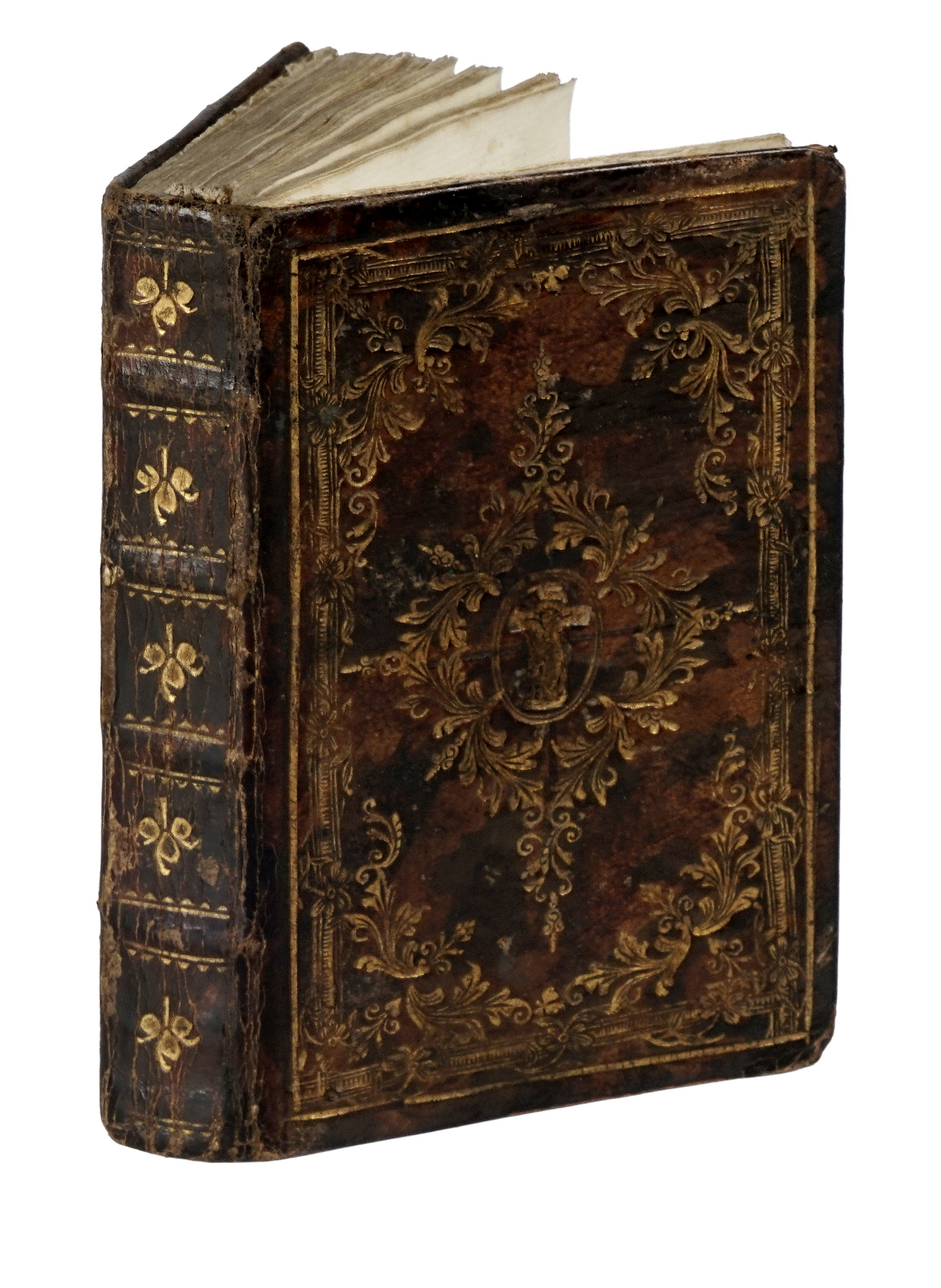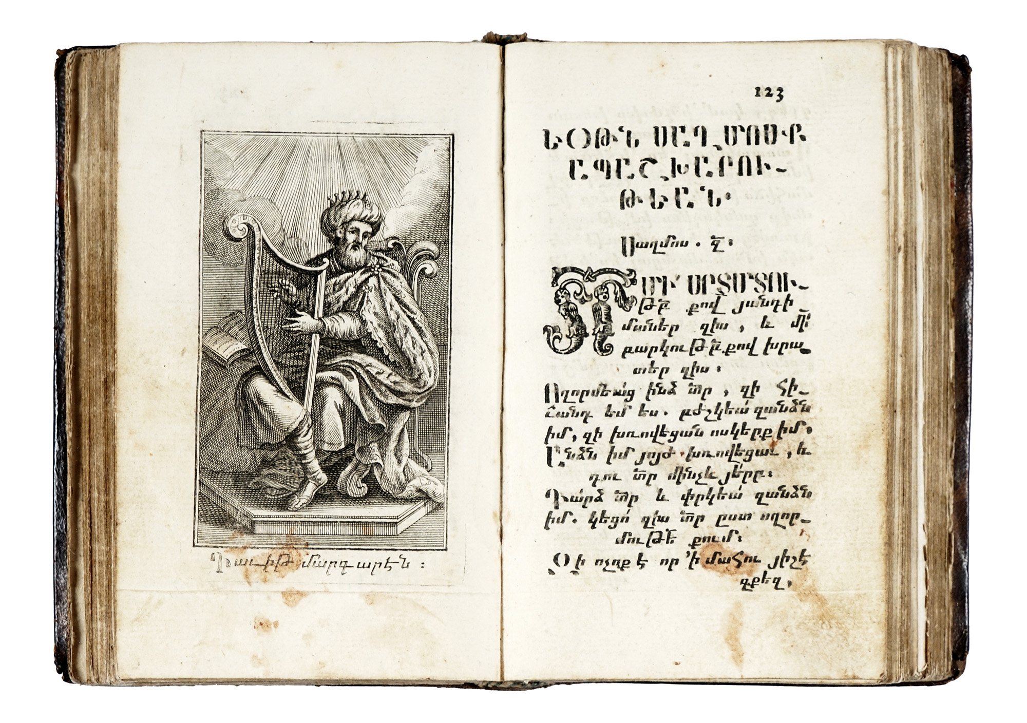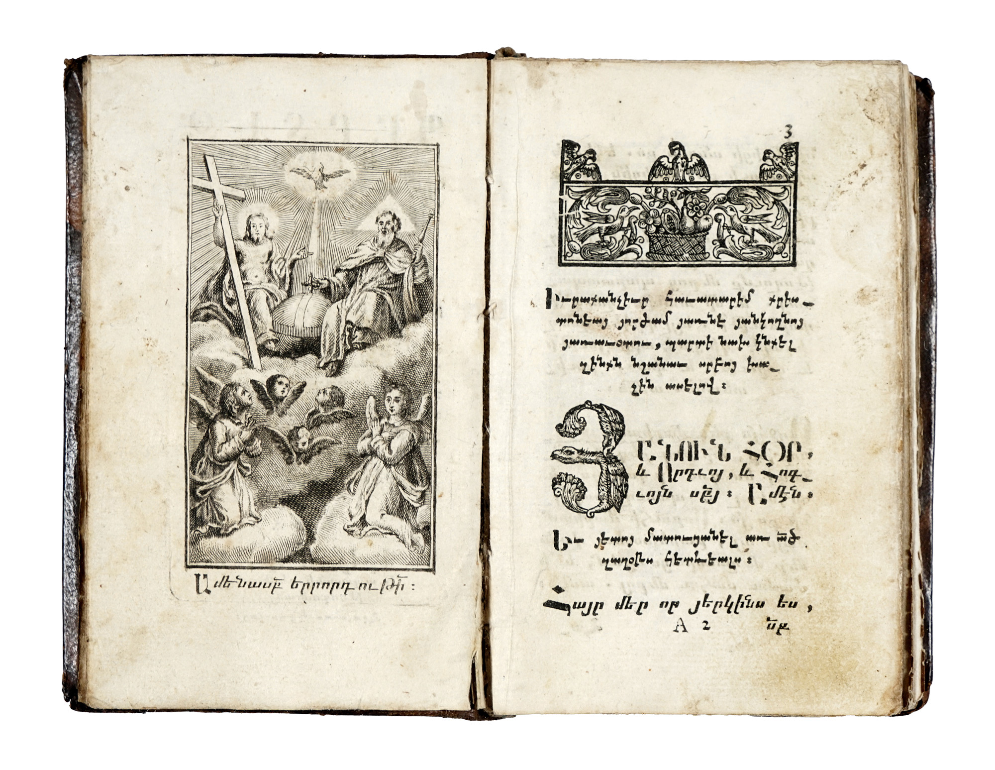 Volume a stampa illustrato in lingua armena classica (grabar) su carta vergellata, composto di 323 pagine numerate [1+162+1], con dimensioni al foglio di mm 130x80 e specchio di scrittura misurante mm 100x50, inchiostro nero e grafia minuscola armena talvolta con occasionali sbiadimenti alle impressioni (persino al titolo del frontespizio). Testo armeno su singola colonna per 21 righi a facciata. Capilettera in armeno stampati imitando lo stile manoscritto, in forma di grilli o figurine bizzarre. Singole facciate numerate a stampa con numerazione araba (europea). Cornici separatrici elaborate a motivi geometrici tra i capitoli, decorazioni floreali al principio e alla fine dei capitoli. Al verso precedente l'inizio di una nuova sezione di preci o inni troviamo una delle sei tavole xilografiche presenti nel volume, con le seguenti illustrazioni, in ordine: alle cc. 2-3 (il Trionfo di Cristo); c. 92 (Maria e Gesù Bambino), c. 122 (Re Davide con l'arpa dei Salmi); c. 172 (Maria e il Bambino in Cielo e sotto di essi i dannati tra le fiamme infernali); c. 238 (la Vergine Maria circondata dal coro dei Santi) e infine c. 276 (Crocifissione di Gesù). Radi lemmi latini scritti a matita in corrispondenza di singoli termini armeni ne costituiscono la traduzione latina. Sontuosa legatura in pelle scura con impressioni dorate su entrambi i piatti esterni, abbellita da una cornice dorata a linea semplice racchiudente una profusione di ampi decori vegetali ai quattro angoli interni e a losanga intorno all'ovale centrale, che presenta una forma iscritta lievemente diversa su ciascun piatto. Stato di conservazione eccellente: rare macchioline e lievissime screpolature su alcune carte. (1) Quest'opera devozionale di arduo reperimento rappresenta con ogni probabilità una sorta di breviario mariano dei cattolici armeni, redatta in un periodo di grandi scontri dottrinali e politici all'interno della comunità armena costantinopolitana e della diaspora.