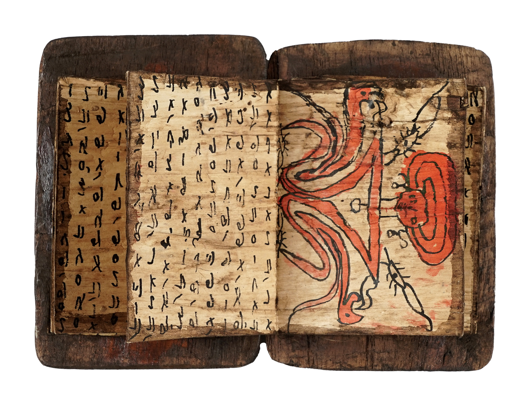 Manoscritto divinatorio apotropaico scritto su un insolito supporto di corteccia trattata misurante mm 100x70 al singolo foglio, fissato a due piatti lignei e confezionato a fisarmonica. Il testo, che si sviluppa senza soluzione di continuità e non è dotato di uno specchio di scrittura definito, è corredato di 5 raffigurazioni di dubbia interpretazione, sebbene almeno una di esse rappresenti evidentemente una figura umana in rosso chiaro e nero. Incastonata al centro del piatto esterno anteriore ligneo della legatura campeggia una moneta delle Indie Orientali Olandesi da 2 centesimi e ½ emessa nel 1914, insieme amuleto rituale e testimonianza del passato coloniale dell'isola di Sumatra. (1) Questo singolare manoscritto esemplifica assai bene la classe di manoscritti tribali apotropaico-divinatori noti come pustaha (termine di remota origine sanscrita indicante il "libro" e oggi in uso, in molte diverse varianti, in larghissima parte del Subcontinente). Questo testo fu composto con ogni probabilità da un datu (sacerdote-mago) della tribù dei Toba-Batak del nord dell'isola indonesiana di Sumatra. Il testo è scritto in inchiostro scuro nell'alfabeto sillabico destrorso batak, da leggersi orizzontalmente, derivato dall'antica scrittura giavanese (ea forse influenzato anche dall'alfabeto Brahmi), e costituisce un amuleto magico di valore apotropaico, nonché uno dei tre più evidenti attributi rituali dei sacerdoti datu, insieme al bastone magico e al corno curativo. Gli impieghi di simili libri magici spaziavano dal trarre le sorti alle previsioni meteorologiche, fino alla consultazione per finalità mediche e per formulare auspici che propiziassero gli affari o la guarigione, oppure a scagliare malefici contro i nemici in tempo di guerra.