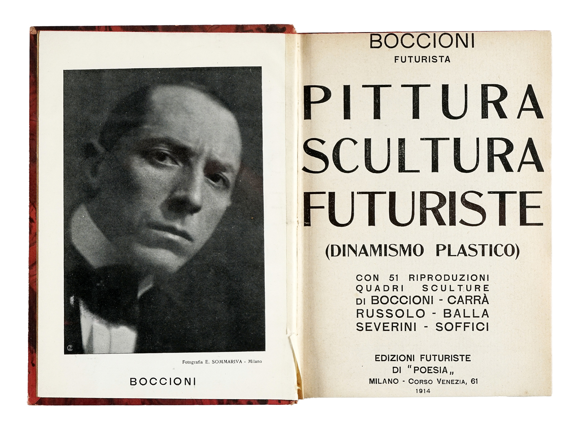 Boccioni Umberto, Pittura scultura futuriste (dinamismo plastico) con 51 riproduzioni, quadri, sculture di Boccioni, Carrà, Russolo, Balla, Severini, Soffici. Milano: Edizioni Futuriste di Poesia, 1914.