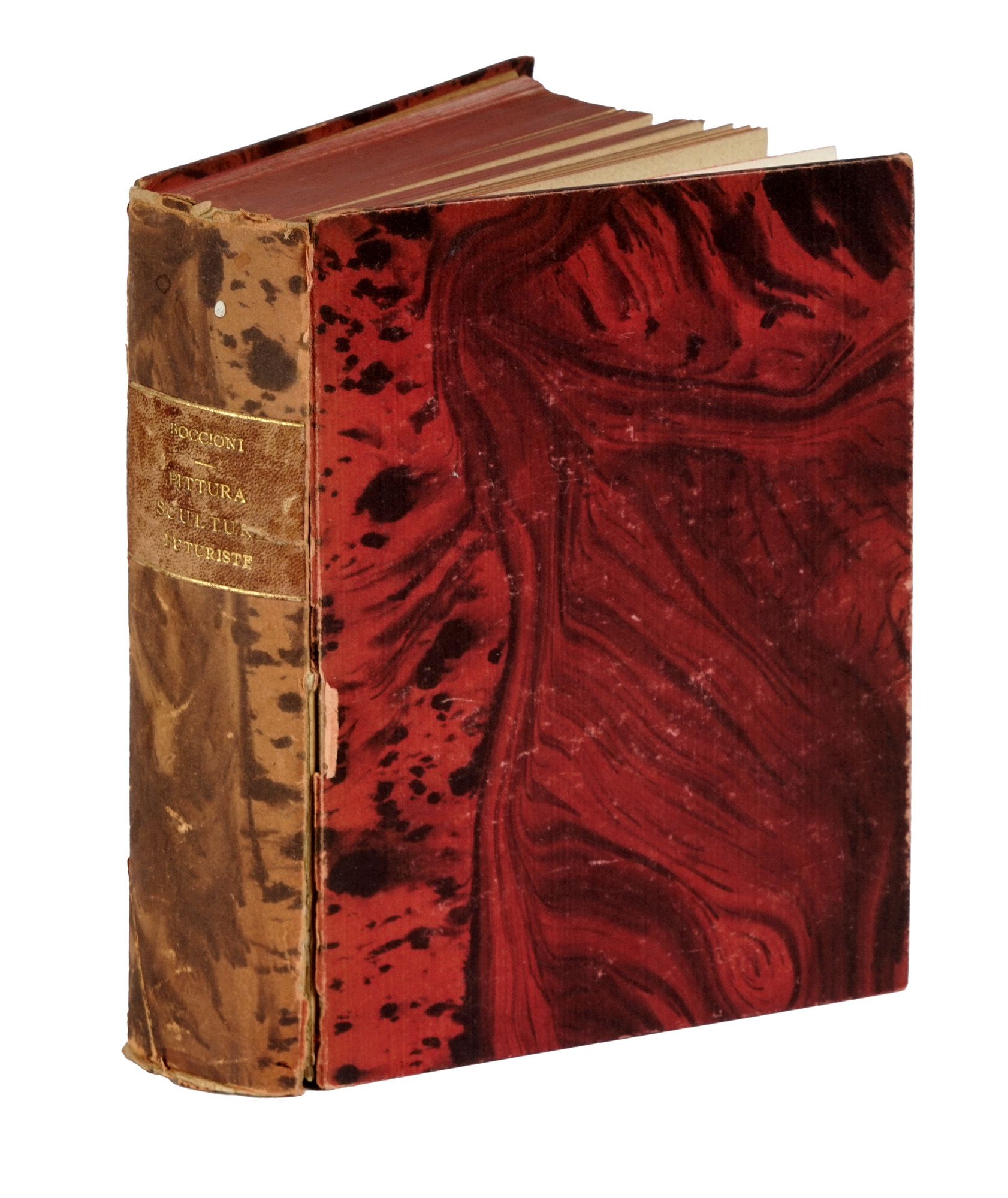 In-8° (mm 185x130). Con 1 ritratto fotografico di Boccioni rimontato in antiporta e 51 riproduzioni in bianco e nero di quadri e sculture su carta patinata. Esemplare rifilato, altrimenti buona conservazione. Legatura successiva in pieno cartonato con titoli su tassello al dorso. Difetti alle cerniere e alle cuffie. (1) Prima edizione di questo fondamentale trattato sulla pittura futurista, lo scritto più importante di Boccioni, corredato da un imponente apparato iconografico. Cfr. Cammarota 40.1; Salaris 23b.