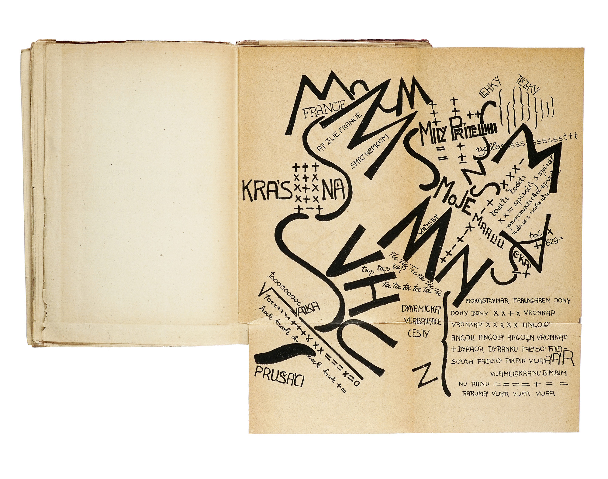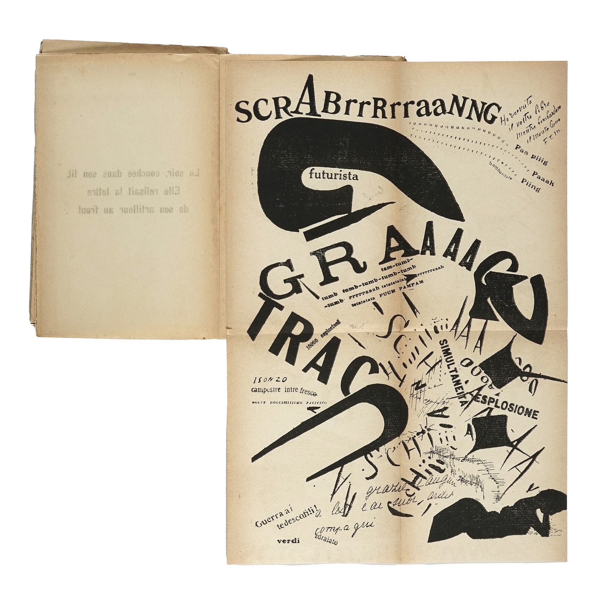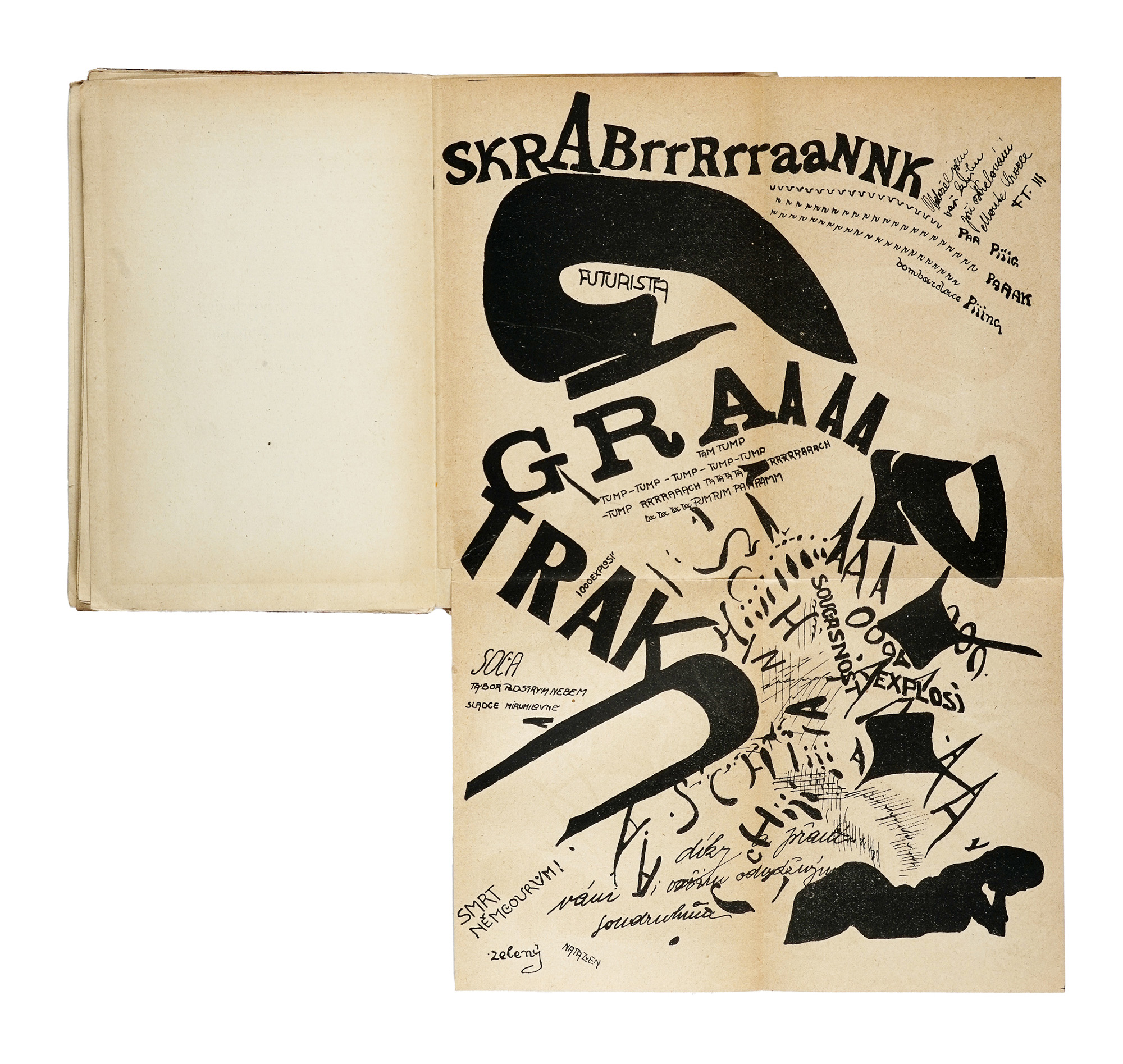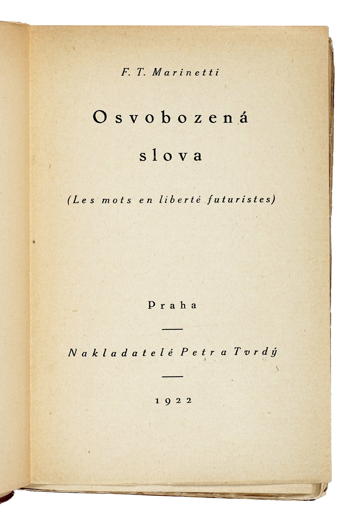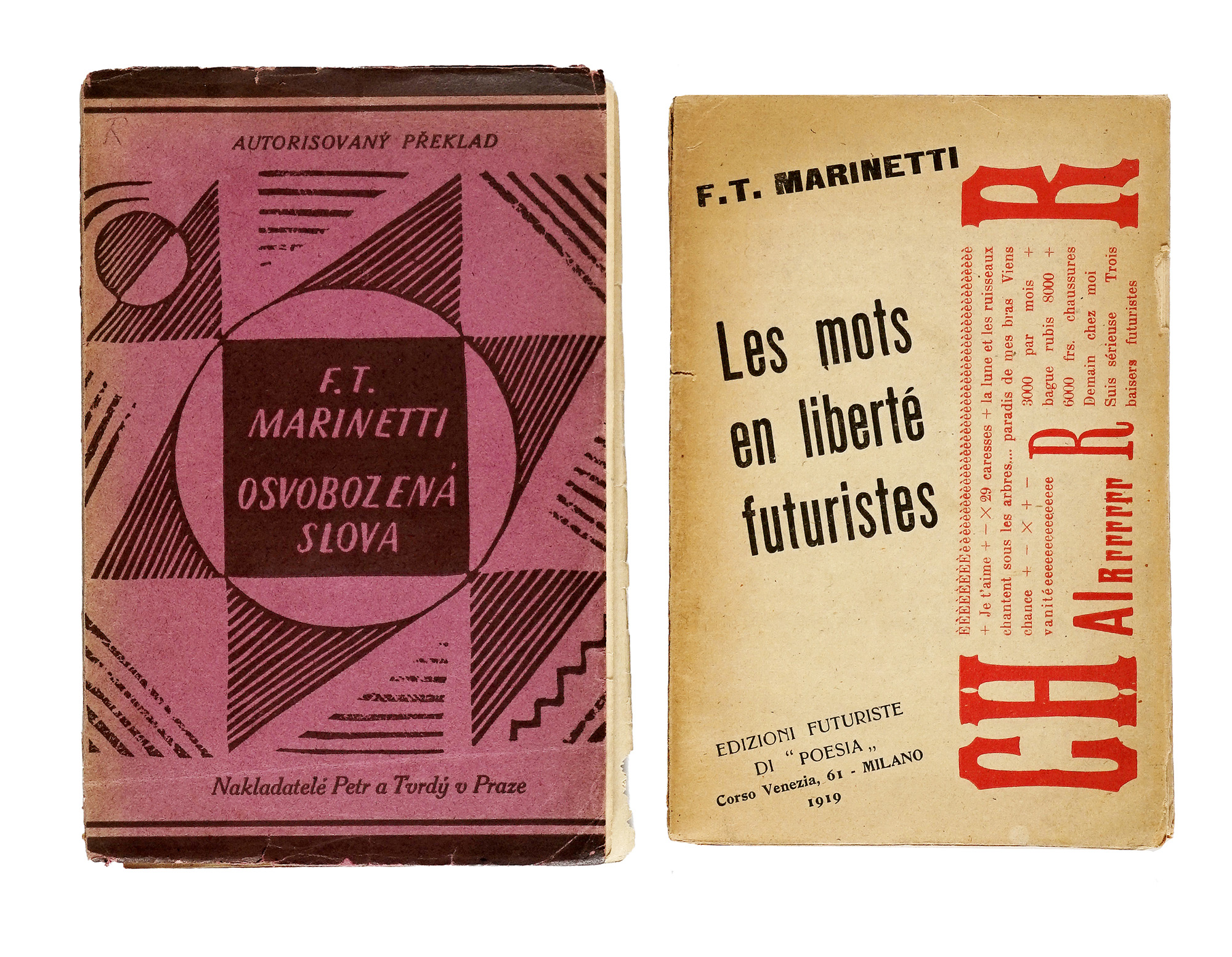 In-8° (mm 193x125). Pagine 107, [7]. Con 4 tavole parolibere fuori testo, più volte ripiegate. Numerose poesie parolibere nel testo. Quasi completamente staccate le pagine da 96 in poi, altrimenti copia intonsa, ben conservata nelle sue barbe. Brossura editoriale con una composizione parolibera in nero e rosso al piatto anteriore. Staccato il piatto anteriore, con una lieve mancanza marginale che non coinvolge il testo e mancanze alle cuffie. Copia arricchita da una dedica autografa di Marinetti. SI AGGIUNGE: Id., Osvobozenà slova. Praha: Nakladatelé Petr a Tvrdy', 1922. Copia da studio, in gran parte slegata e con difetti. (2) I OPERA: Prima edizione di questo libro simbolo dell'editoria futurista, apice della sperimentazione tipografica di Marinetti, che riassume i principi del paroliberismo e contiene traduzioni in francese di testi programmatici del futurismo e di parolibere, alcune delle quali inedite. Futurismo (catalogo di vendita n. 43). Gussago (BS): L'Arengario Studio Bibliografico, 2001, pag. 51 cita Salaris 1992, pp. 108-109: «Le mots en liberté futuristes presenta una parte teorica in cui si vuole dimostrare che il futurismo ha influenzato e anticipato tutto lo sperimentalismo del mondo. In funzione esemplificativa seguono alcune tavole parolibere davvero straordinarie, in cui si precisano i canoni di una spazialità tipografica astratta di grande suggestione. Siamo di fronte al punto più alto della ricerca futurista.». II OPERA: Traduzione in ceco dell'opera Les mots en liberté, a cura di Jirky Macàka, pubblicata in una tiratura di 1500 esemplari, con la brossura originale illustrata da Josef Capek. Quest'edizione ha rivestito un ruolo di grande rilievo per lo sviluppo della poesia d'avanguardia ceca e ha avuto un impatto determinante anche sull'evoluzione della nuova arte tipografica nazionale. Si tratta inoltre dell'unica traduzione al mondo di questo testo fondamentale, che rappresenta la sintesi teorica e creativa della ricerca futurista sulle parole in libertà.