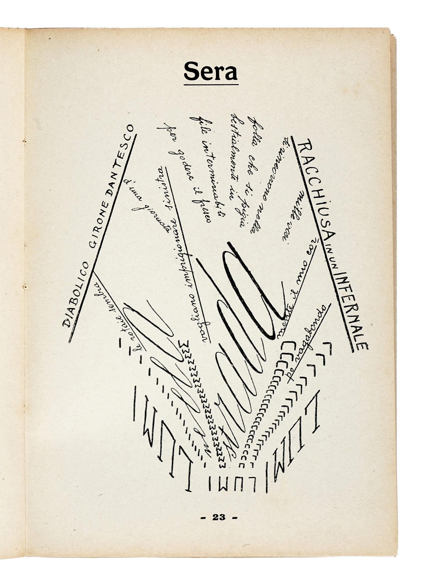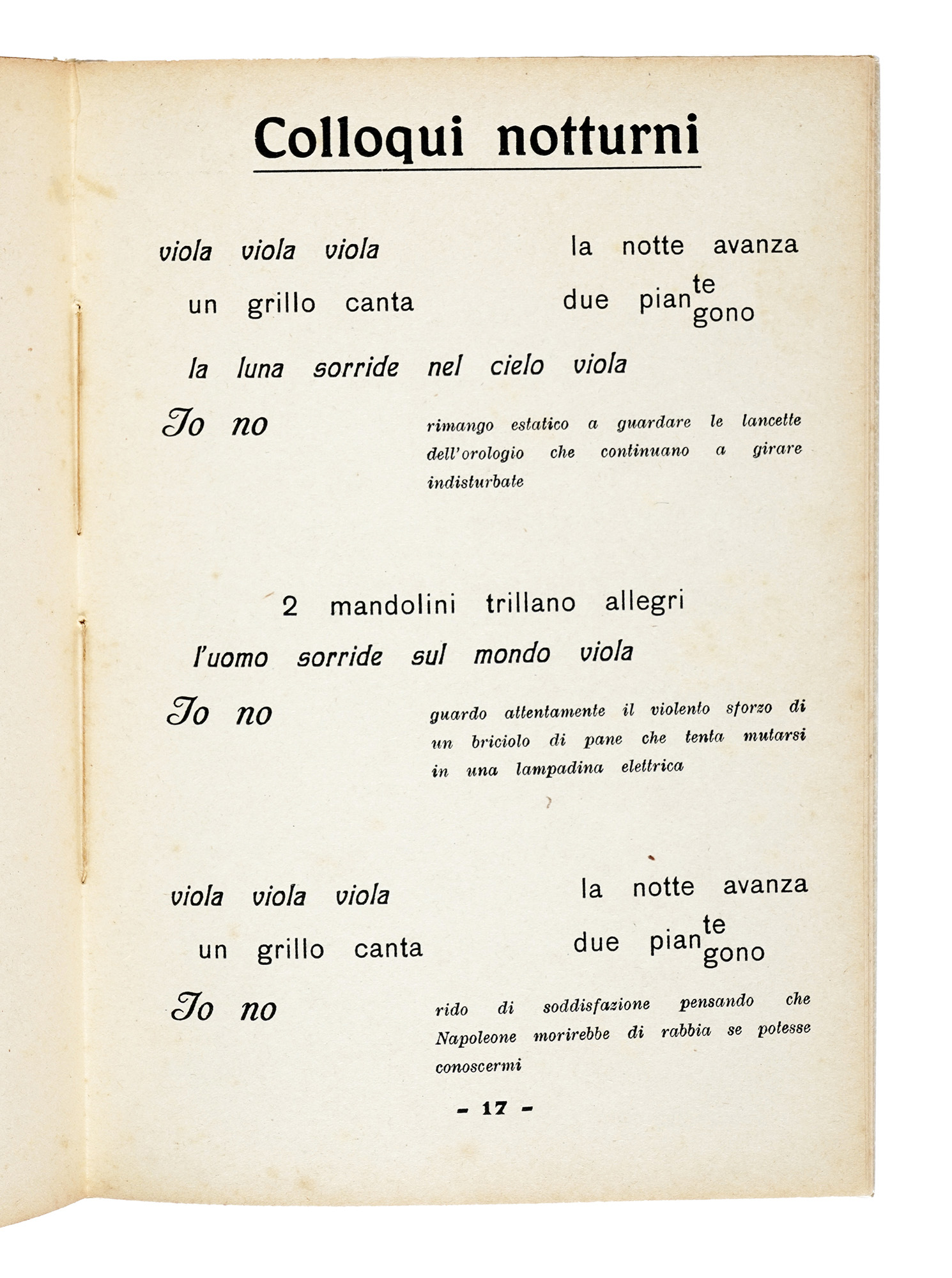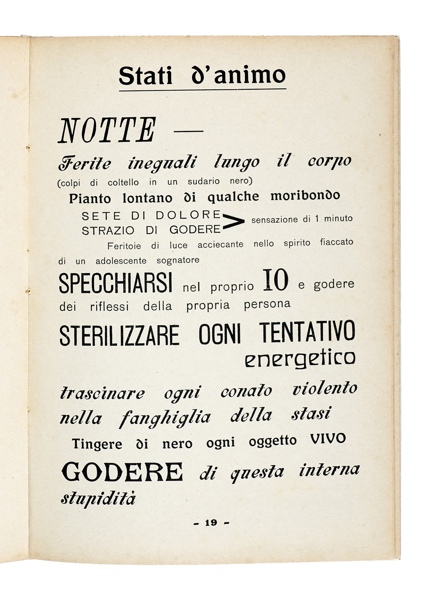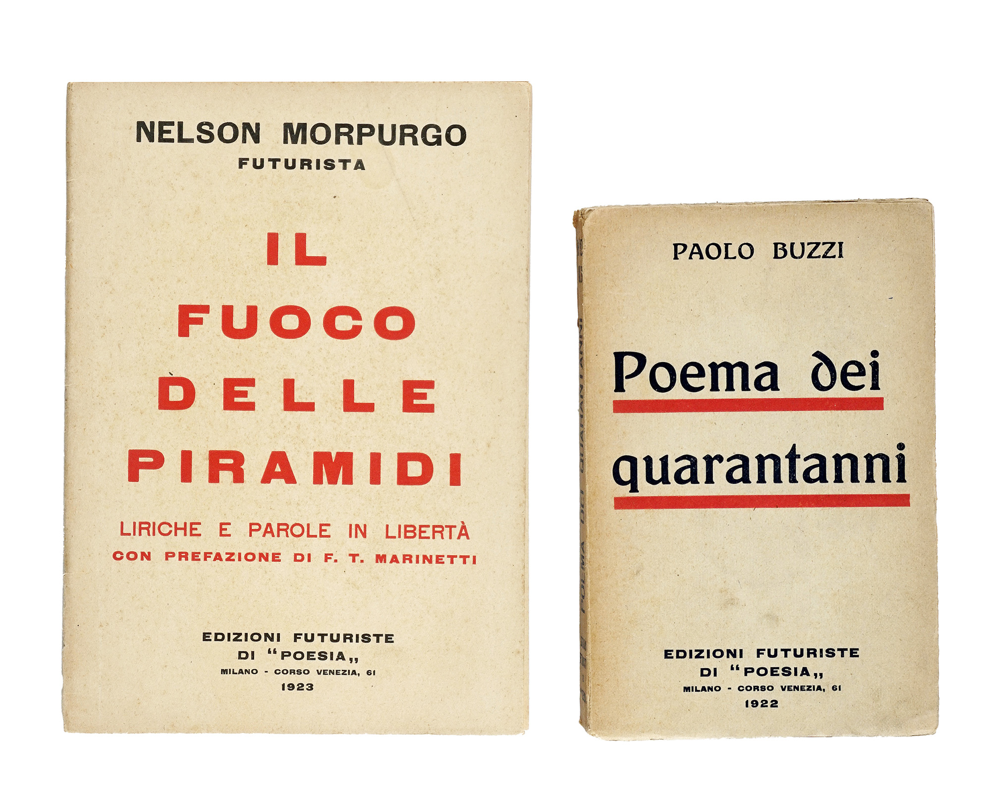 In-8° (mm 243x170). Pagine 29, [3]. Con le splendide parolibere di Nelson Morpurgo a piena pagina nel testo. Esemplare con qualche fioritura e con le pagg. 1-2 quasi completamente staccate, altrimenti buona conservazione. Brossura editoriale con titoli in rosso e nero. Fioriture ai piatti, internamente quasi completamente staccato quello anteriore, con qualche difetto alla cerniera. SI AGGIUNGE: Buzzi Paolo, Poema dei quarantanni. Milano: Edizioni futuriste di Poesia, 1922. (2) I OPERA: Edizione originale che comprende una prefazione scritta da F.T. Marinetti. Raccolta di 15 parolibere stampate solo al recto. Così nel Dizionario del Futurismo: «Tra gli esiti maggiori del sintetismo e del paroliberismo futurista per nitidezza grafica e costruzione iconoica del lessema». Cfr. Cammarota, Futurismo 333,4; Salaris 57; non censito in Gambetti-Vezzosi. II OPERA: Edizione originale di questa raccolta di poesie.