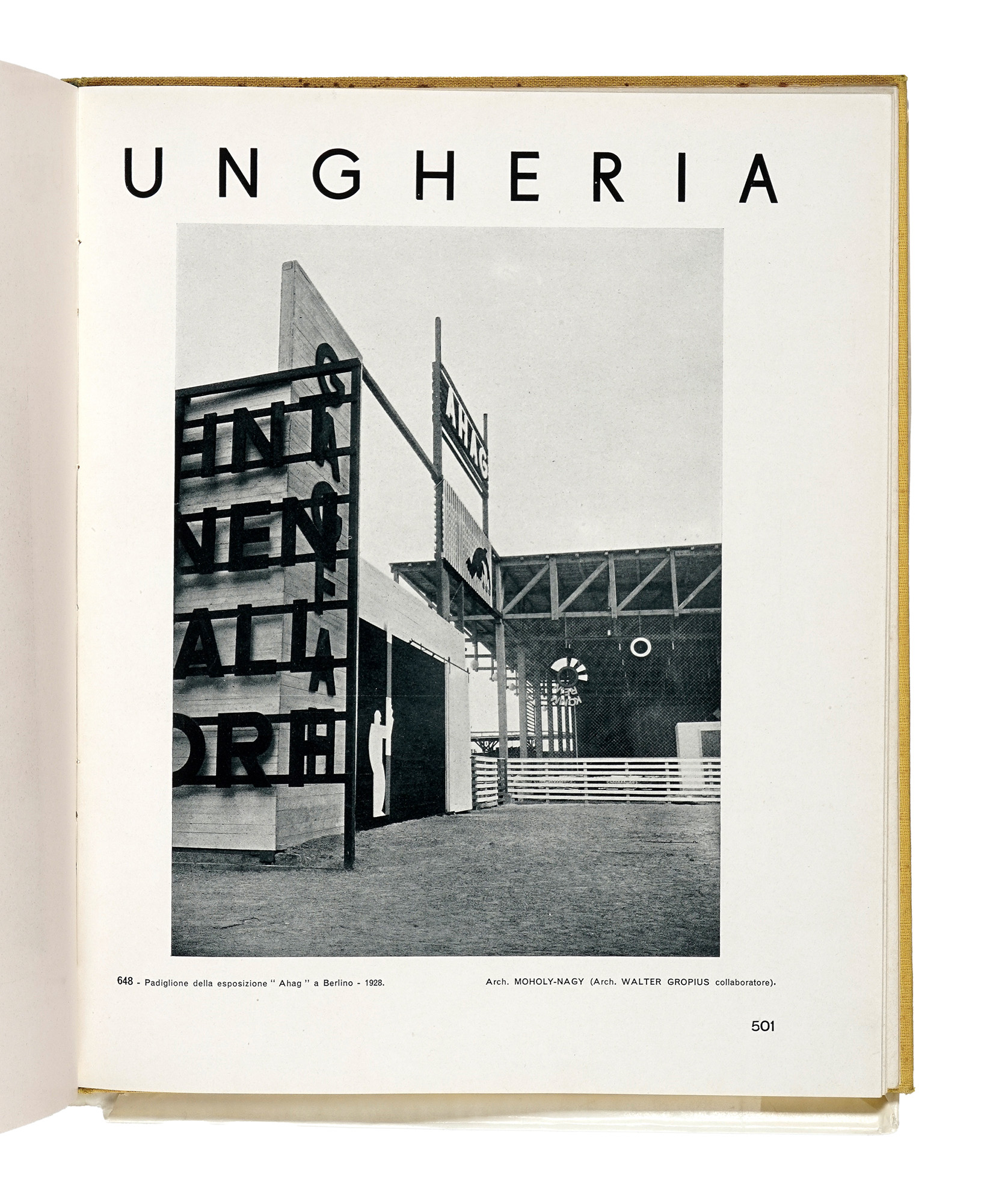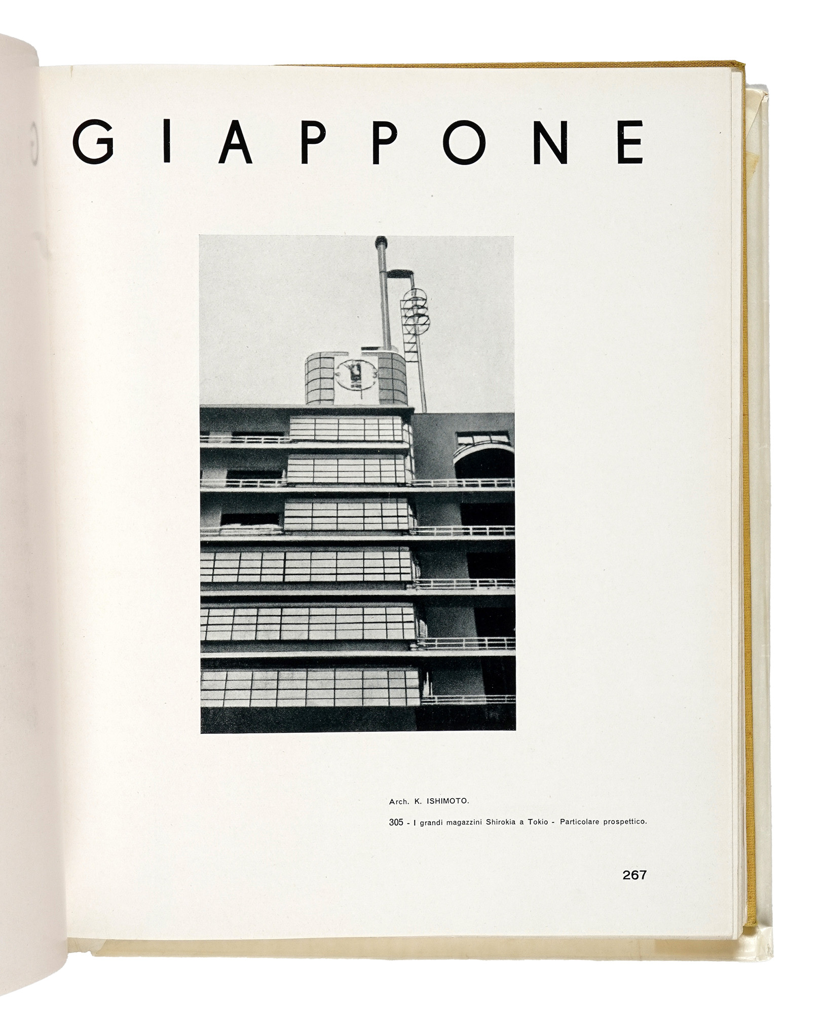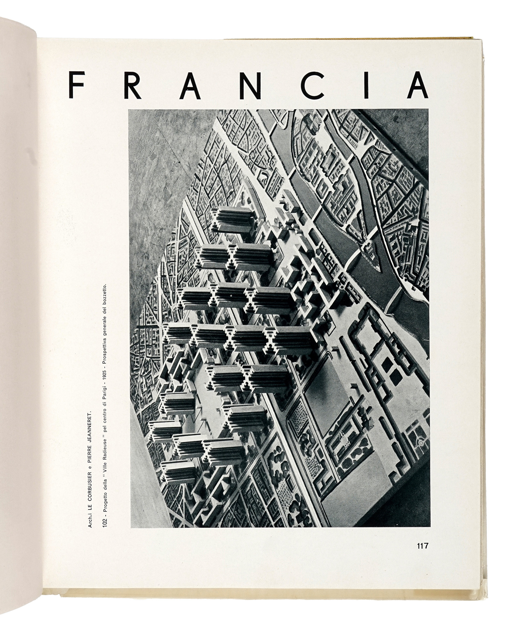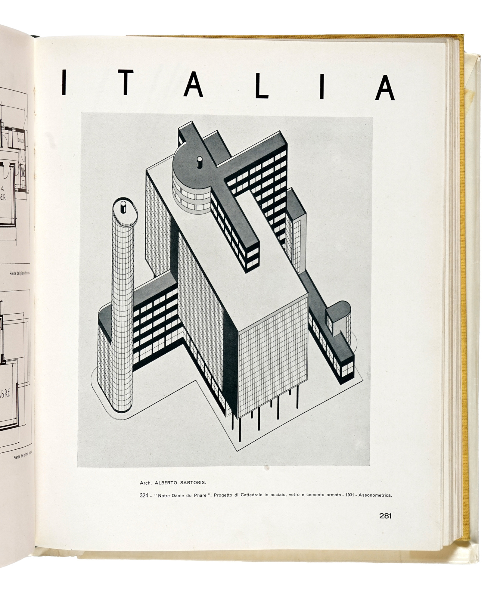 In-4° (mm 275x225). Pagine [2] bianche, [8], 538, [2] con 675 illustrazioni in bianco e nero nel testo delle opere dei maggiori architetti dei vari Paesi e 1 tavola a colori di Sartoris. Rarissimi strappetti marginali, altrimenti ottima copia. Legatura editoriale in piena tela gialla, con titolo in verde e rosso stampato a secco sul piatto anteriore e al dorso. Tracce di polvere e lievissime fioriture concentrate principalmente al piatto anteriore, ma nel complesso ottima conservazione. Nota di possesso manoscritta al foglio di guardia anteriore. SI AGGIUNGE: Id., Gli elementi dell'architettura funzionale. [...] Seconda edizione interamente rifatta. Prefazione di Le Corbusier... Milano: Ulrico Hoepli, 1935. SI AGGIUNGE: Id., Gli elementi dell'architettura funzionale. [...] Terza edizione interamente rifatta. Collaudo di F.T. Marinetti... Milano: Ulrico Hoepli, 1941. Dorso scolorito e un'etichetta incollata al piatto anteriore, per il resto buona conservazione. (3) I OPERA: Prima edizione di questo poderoso volume di architettura, riccamente illustrato. III OPERA: L'introduzione di P. M. Bardi riproduce quella della seconda edizione, la prefazione di Le Corbusier quella della prima edizione, mentre il testo di Marinetti compare qui per la prima volta ed è datato novembre 1940, XIX.