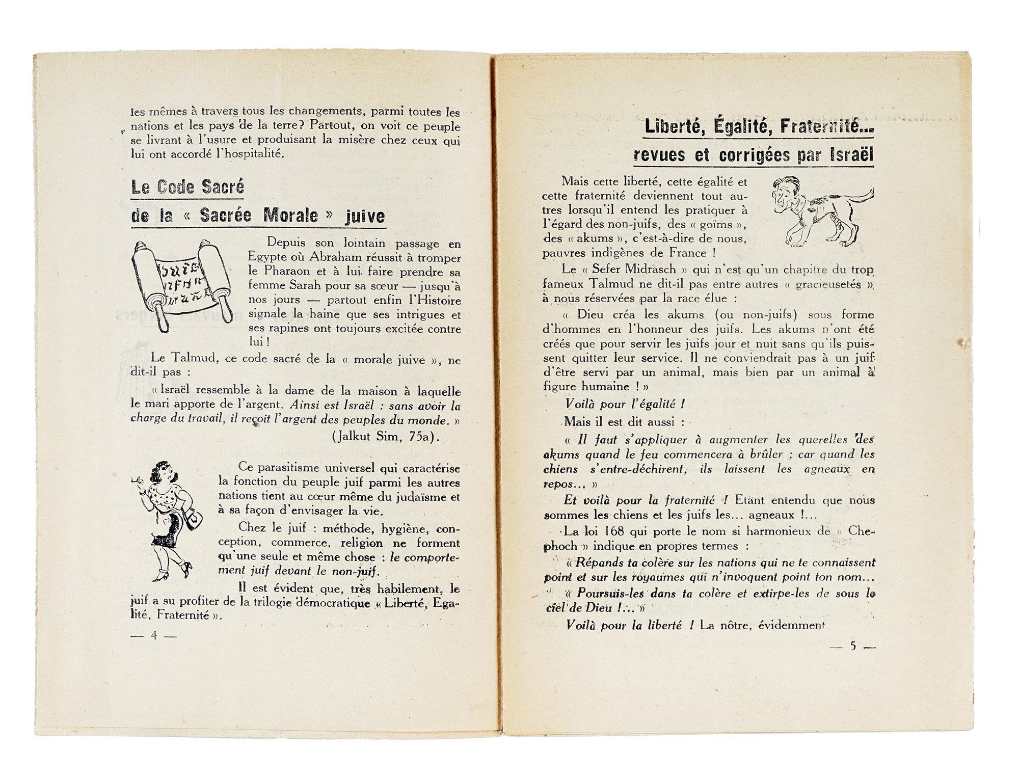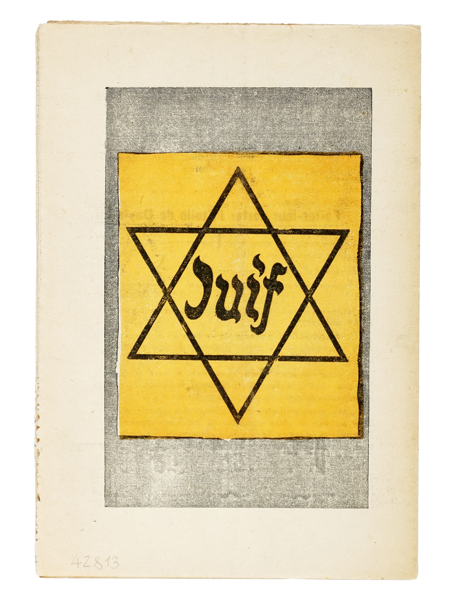 In-8° (mm 204x144). Pagine 16. Brossura originale, pressochè perfettamente conservata, con una copertina raffigurante sul lato anteriore il cerchio colorato in giallo, simbolo distintivo degli ebrei nell'antichità, e sul lato posteriore la stella di David con la scritta JUIF, sempre su fondo giallo, evidentemente per gli ebrei francesi. (1) L'opuscolo presenta molte idee e storie diverse a sfondo antisemita, che denigrano, criticano e accusano la comunità ebraica per effetto dell'antisemitismo che imperava in Europa nei primi decenni del XX secolo. Estremamente raro.