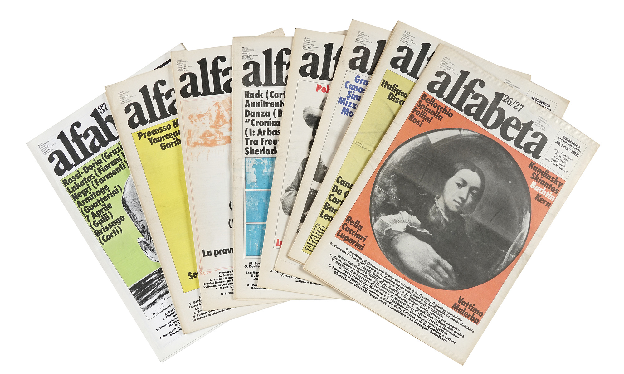133 fascicoli sciolti in-folio (mm 418X280). Dal n. 1 del maggio 1979 al n. 114 del dicembre 1988. Presenti anche i 29 Supplementi. Un segno di penna al piatto anteriore del n. 92, altrimenti ottimo esemplare, perfettamente conservato. Elenco dettagliato dei Supplementi disponibile su richiesta. (133) Fondata nel 1979, «Alfabeta» rappresenta una delle più importanti esperienze intellettuali italiane del secondo Novecento, capace di dare voce alla cultura militante in una fase segnata dalla crisi della figura dell'intellettuale, dal riflusso post-ideologico e dalla trasformazione dei linguaggi artistici e letterari. La rivista nasce come evoluzione e ampliamento del progetto «α–beta. Laboratorio di critica delle arti visive, di storia dell' arte e...», pubblicato in otto numeri tra il 1975 e il 1976 per iniziativa di Gino Di Maggio e George Brecht, in dialogo con Fluxus e le avanguardie storiche. A rilanciarne il titolo nel 1979 è la casa editrice Multhipla di Milano, che inaugura «Alfabeta. Mensile di informazione culturale», un nuovo periodico caratterizzato da una visione ampia e transdisciplinare. Il comitato di redazione è composto da figure d'eccezione: Nanni Balestrini, vero ideatore del progetto, affiancato da Umberto Eco, Antonio Porta, Paolo Volponi, Maria Corti, Francesco Leonetti, Pier Aldo Rovatti, Mario Spinella, oltre allo stesso Di Maggio e a Gianni Sassi, art director e co-fondatore della casa editrice Intrapresa, che curerà la pubblicazione a partire dal 1981. Con 114 numeri pubblicati fino al 1988, «Alfabeta» si pone come l'ultima grande rivista del Novecento, come l'ha definita Romano Luperini, dando forma a un progetto collettivo che mirava a riattivare il pensiero critico e il confronto culturale tra le "forze superstiti" della sinistra intellettuale dopo la repressione politica degli anni Settanta. L'interesse per la parola orale e performativa porta alla collaborazione con iniziative d'avanguardia come MilanoPoesia, Polyphonix e Guerra alla guerra. Non meno centrale è il dialogo tra immagine e testo: ogni numero ospita sezioni iconografiche tematiche, dedicate a grafica, fotografia, fumetto, Fluxus, futurismo, underground, con interventi di Andrea Pazienza, Pablo Echaurren, Massimo Dolcini, Giovanni Anceschi, e numerosi supplementi visivi e letterari. Strumento fondamentale della critica culturale, «Alfabeta» ha saputo raccogliere e rilanciare le tensioni e le eredità del Gruppo 63, creando connessioni con movimenti europei e lasciando una traccia profonda nella storia dell'editoria militante. L'ideale di una rivista "senza paura" – come scrisse Alberto Colonnetti nell'ultimo editoriale (n. 114, 1988) – resta il lascito più vivo di questa impresa. Una collezione completa dei 114 numeri costituisce oggi una rarità bibliografica di grande interesse storico, letterario e artistico, fondamentale per lo studio della cultura italiana tra anni Settanta e Ottanta.
