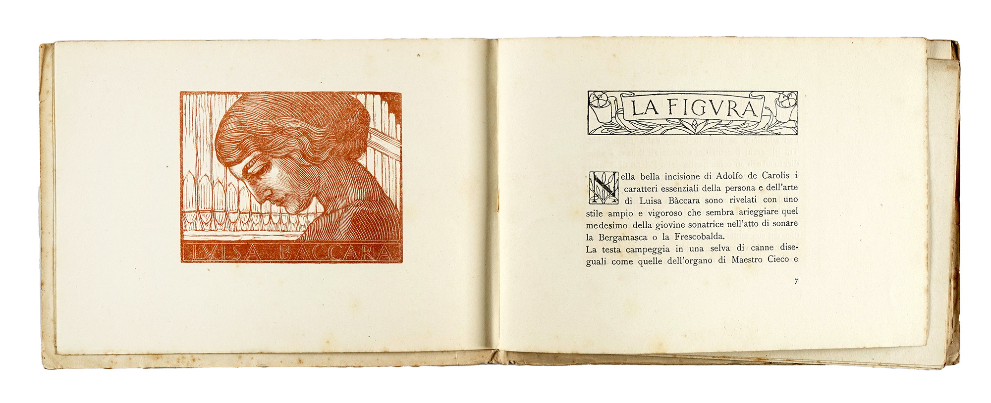 In-8° oblungo (mm 140x198). Pagine 41, [3] bianche. Con un ritratto xilografico in sanguigna realizzato da Adolfo De Carolis. Esemplare intonso, parzialmente allentato, con rarissime fioriture. Brossura originale a due colori con xilografia in rosso dell'artista, con unghiature. Fioriture ai piatti e segni di usura al dorso. (1) Prima ed unica edizione di questi scritti - già apparsi su periodici dello stesso anno - dedicati alla pianista Luisa Baccara che visse con il Vate al Vittoriale dal 1920 al 1938.