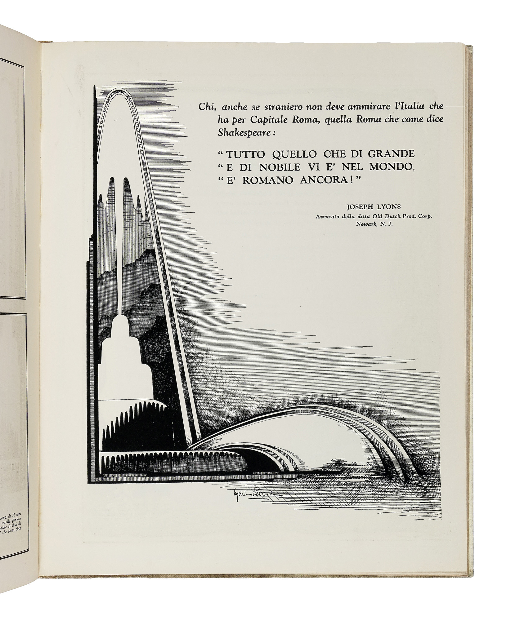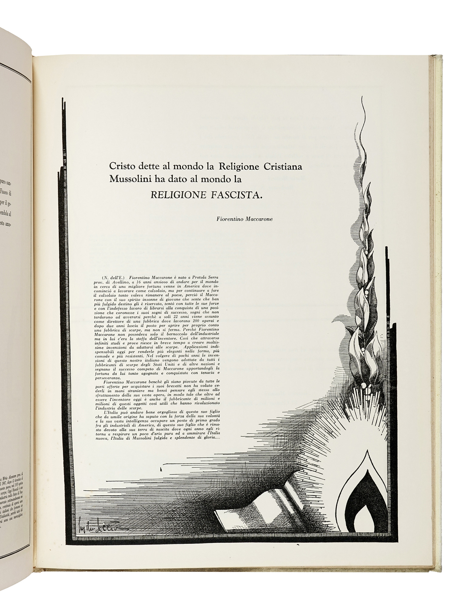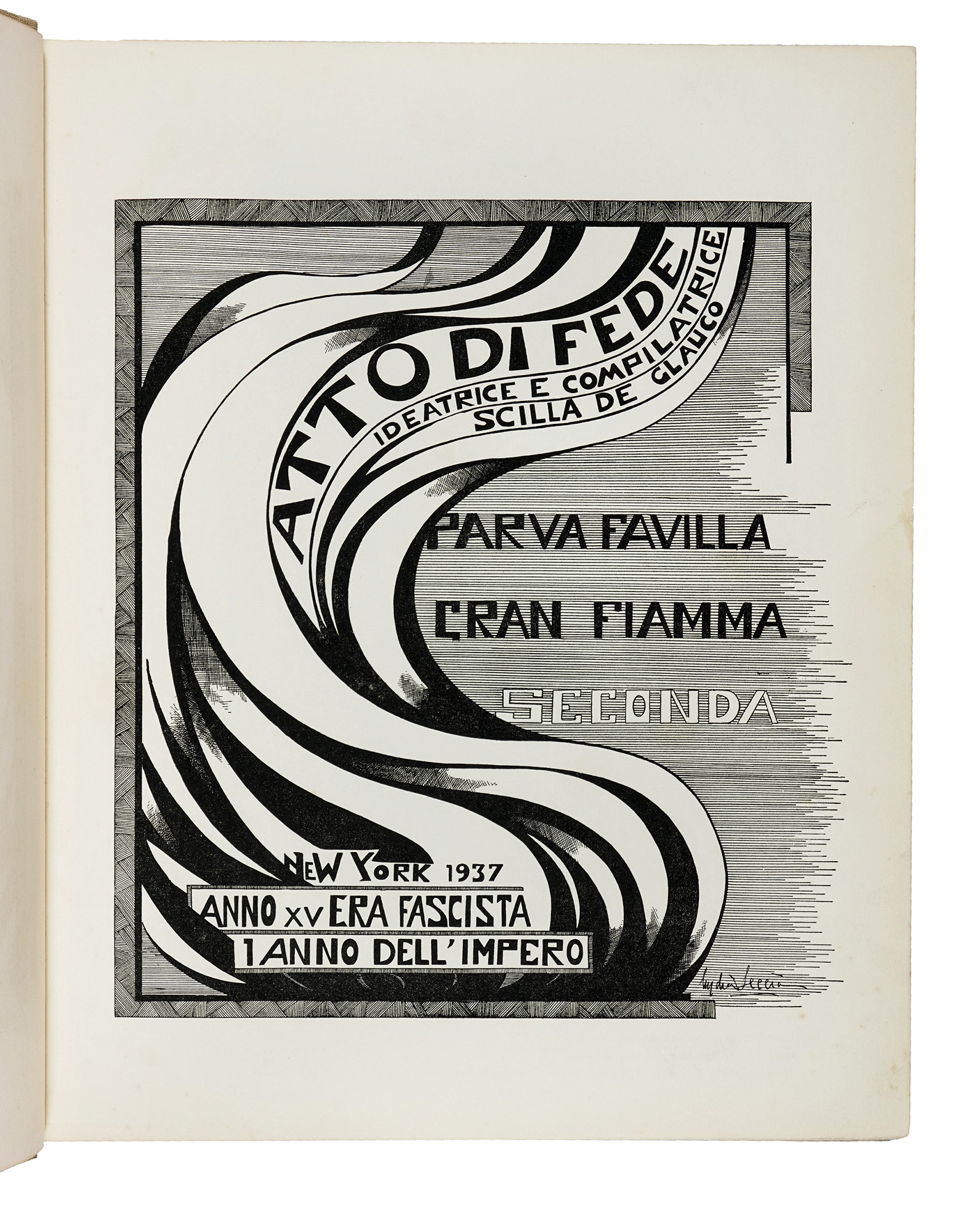 In-4° (mm 348x285). Esemplare con numerose riproduzioni fotografiche nel testo, profusamente illustrata ad opera di Lydia Seccia. Rare fioriture, concentrate principalmente nella prima parte, altrimenti ottima copia. Legatura editoriale in piena tela, con bella illustrazione dell'Artista in nero e oro al piatto anteriore. Tracce di polvere e lievi segni di usura alle cerniere. (1) Importante, monumentale e rarissima edizione bilingue realizzata come omaggio politico e celebrativo al fascismo e alla figura di Benito Mussolini, Atto di fede rappresenta una testimonianza emblematica della propaganda italiana all'estero. Di particolare interesse è l'apparato iconografico firmato da Lydia Seccia, che attraverso fotografie, disegni e ritratti allegorici contribuisce a rafforzare il tono solenne e declamatorio dell'opera. L'elegante veste tipografica, l'impaginazione ricercata e la copertina rigida decorata conferiscono al volume l'aspetto di una vera e propria "strenna ideologica" destinata al pubblico italoamericano del tempo.