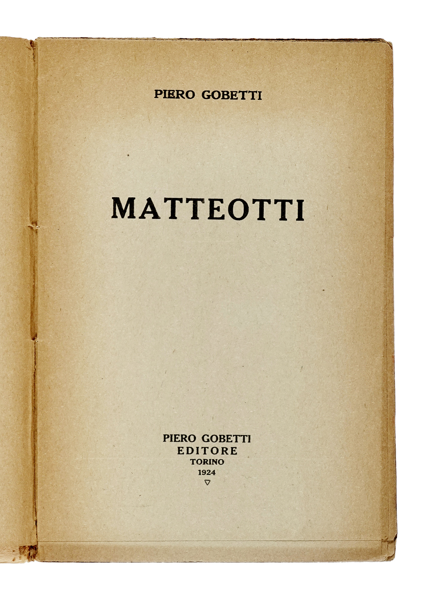 In-8° (mm 192x130). Ottimo esemplare in barbe, con un fascicolo slegato, ma presente e ben conservato. Brossura editoriale con titoli in nero entro cornice tipografica rossa al piatto anteriore. (1) Pubblicato nell'agosto del 1924, questo Matteotti di Piero Gobetti rappresenta una delle prime e più lucide reazioni intellettuali all'assassinio del deputato socialista, nonché uno dei più incisivi ritratti biografici a lui dedicati. Il volumetto raccoglie il lungo scritto comparso sul numero del 1° luglio della rivista La Rivoluzione Liberale e una nota biografica pubblicata il 22 dello stesso mese. La sua uscita ebbe un'immediata risonanza: il libretto andò letteralmente a ruba e diverse testate giornalistiche ne pubblicarono recensioni, a conferma della sua potenza espressiva e dell'attualità politica delle sue tesi. L'opera si inserisce pienamente nel clima teso e drammatico dell'estate 1924, dopo l'omicidio Matteotti e nel cuore della crisi dello Stato liberale. La sua diffusione fu presto bloccata da numerosi sequestri e distruzioni da parte del regime fascista, il che rende le copie superstiti estremamente rare. Il progetto grafico fu curato dal pittore Felice Casorati, che conferì all'edizione una cifra estetica moderna e severa, perfettamente in linea con la tensione civile del testo. Oggi questo volumetto, oltre a essere un documento storico di rara importanza, si offre come esempio di opposizione radicale e lucidissima, valida anche nel presente per chiunque voglia contrastare le derive autoritarie o populiste in ogni epoca. Un manifesto morale e civile senza tempo.