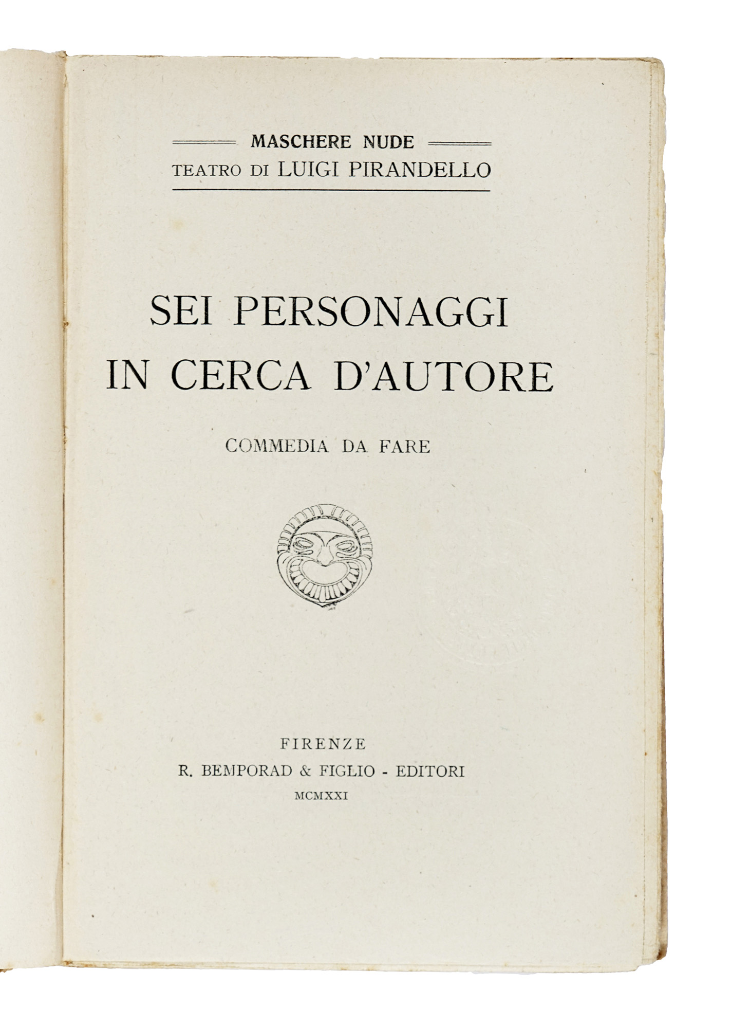 Pirandello Luigi, Sei personaggi in cerca d'autore. Commedia da fare. (Maschere Nude, III vol.). Firenze: R. Bemporad & figlio, 1921.