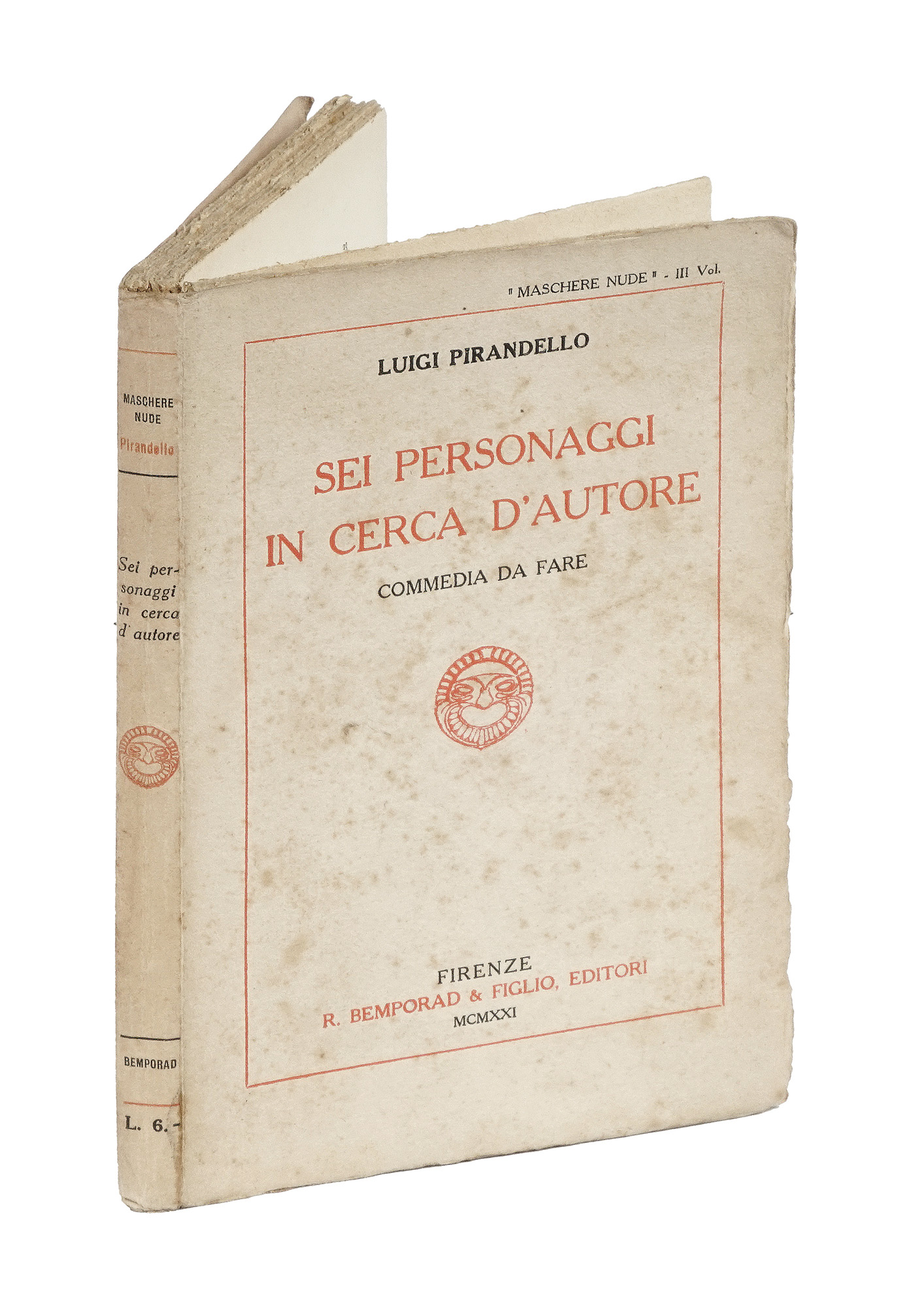 In-8° piccolo (mm 195x135). Pagine 141, [1], 2 bianche. Ottimo esemplare in barbe, parzialmente intonso. Brossura originale con titoli in nero e rosso entro cornice tipografica al piatto. Internamente staccata nella parte superiore, con i primi fascicoli allentati; ampie fioriture ai piatti. Annotazione manoscritta a matita all'occhietto. (1) Rara edizione originale di una delle opere più famose di Pirandello, rappresentata per la prima volta dalla Compagnia di Dario Niccodemi al Teatro Valle di Roma il 10 maggio 1921. Gambetti-Vezzosi, 691.