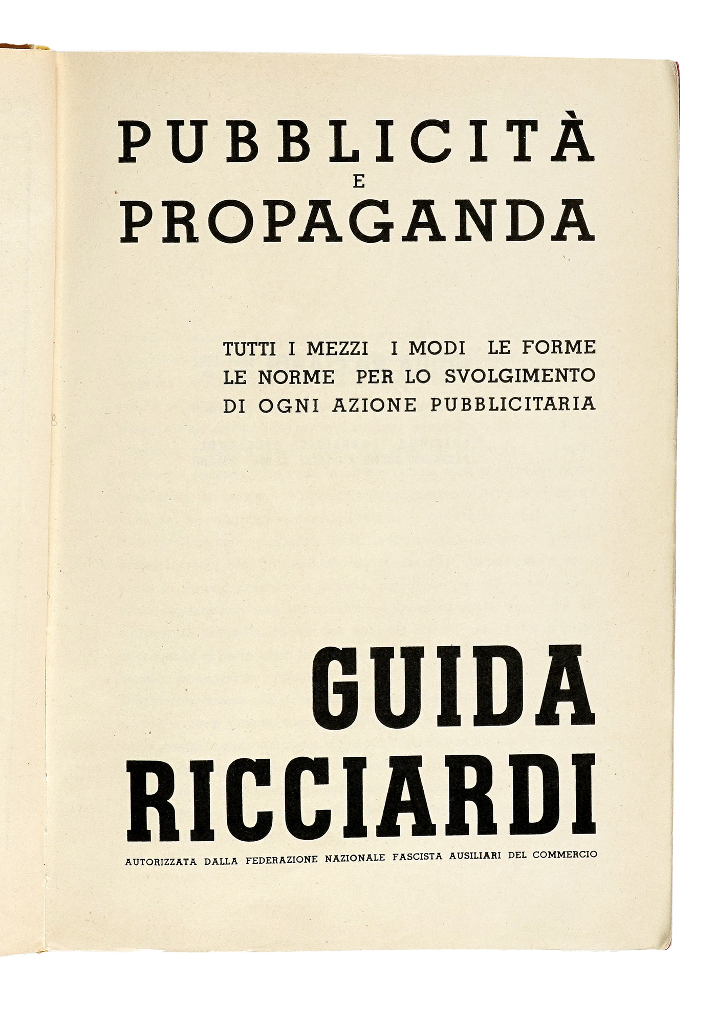 Ricciardi Giulio Cesare, Guida Ricciardi. Pubblicità e Propaganda. Tutti i mezzi i modi le forme le norme per lo svolgimento di ogni azione pubblicitaria. Milano: Edizione Pubblicità Ricciardi, 1941-1942.