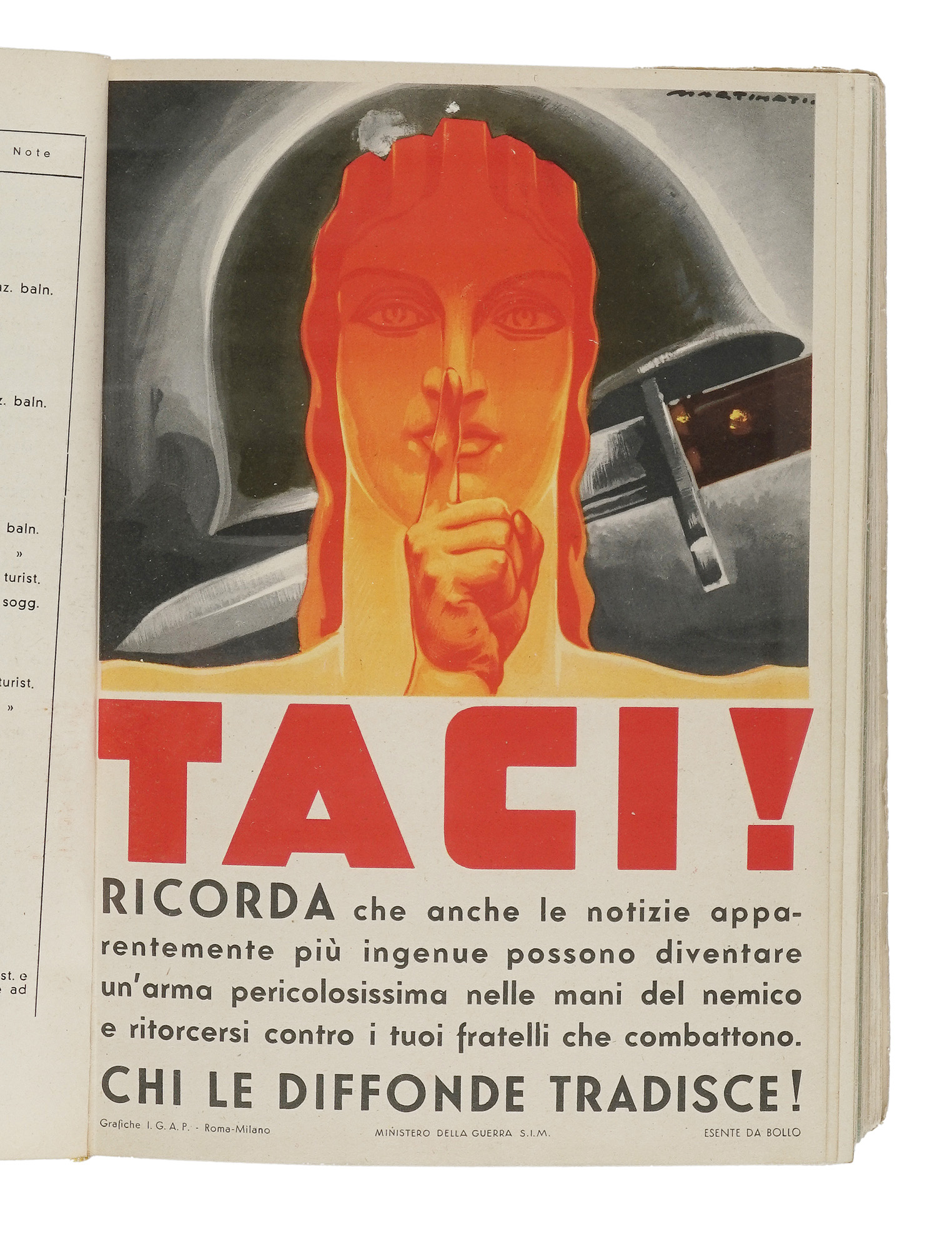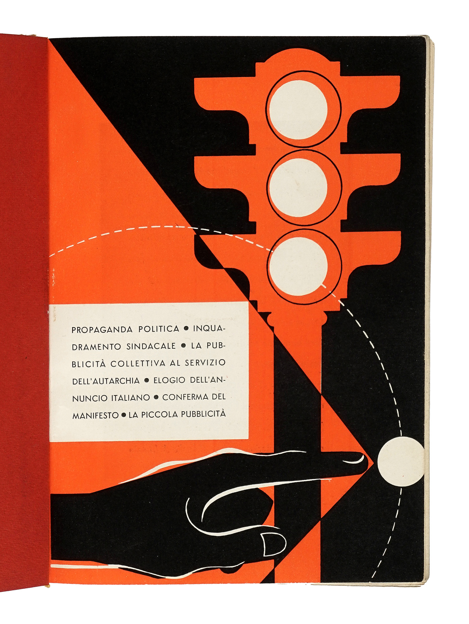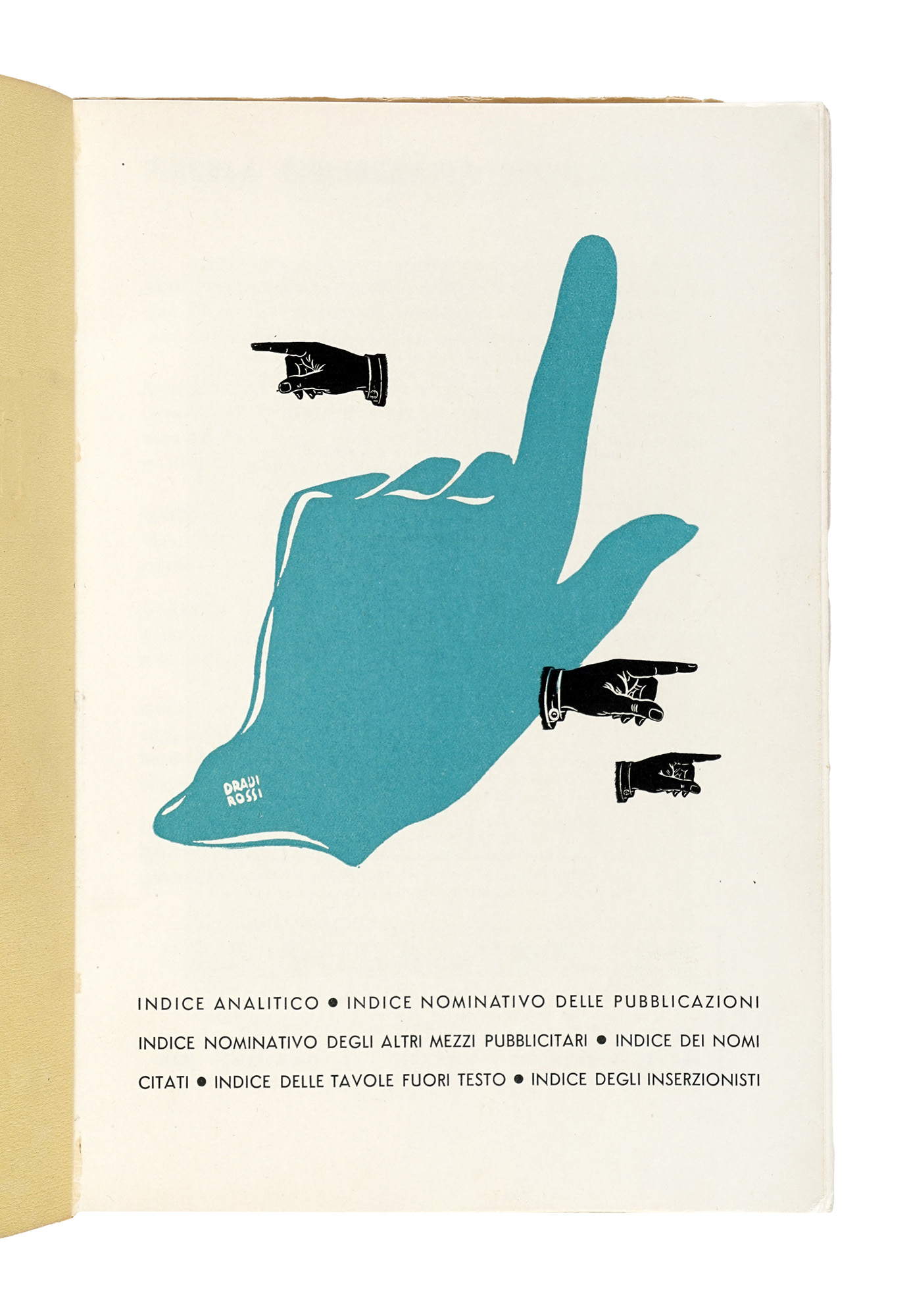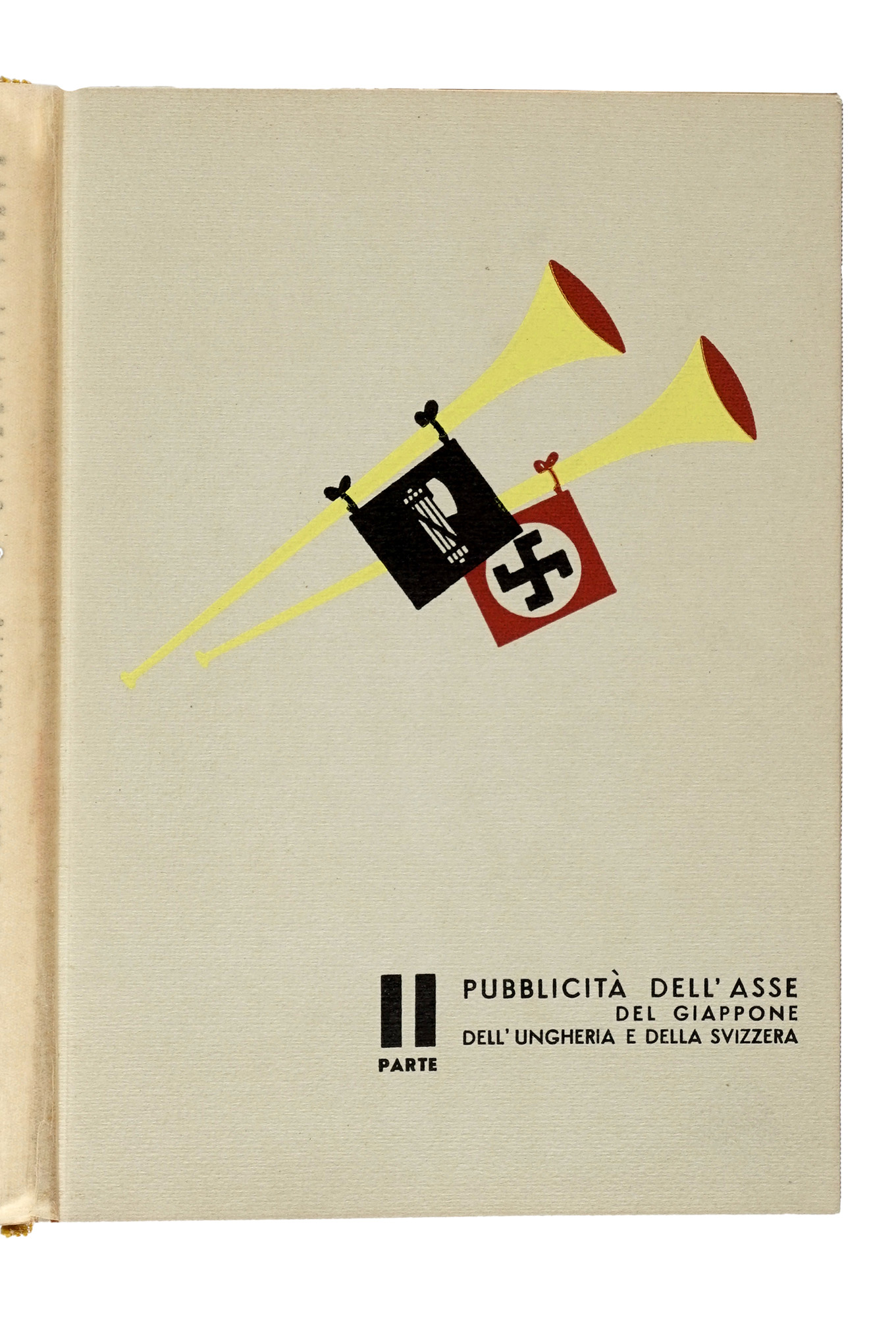 In-8° (mm 238x175). Corposissimo volume, profusamente illustrato, diviso in 8 parti (Propaganda e pubblicità; Pubblicità dell'Asse; Giornali e Riviste; Forme varie di pubblicità; Allestimenti mostre e fiere; Codice pubblicitario; L'ufficio di pubblicità; Indici generali), ciascuna separata da 1 tavola fuori testo stampata su cartoncino colorato, protetto da velina. Numerose tavole in bianco e nero e a colori, anche a piena pagina, nel testo e fuori testo; alcune, bellissime, applicate. Tra le curiosità: 2 fotografie originali applicate, il catalogo delle edizioni Domus; un pieghevole Kneip illustrato da Carboni, uno dell'Ente Nazionale Risi, uno dei Vini Mirafiore, uno di Grafitalia, un libretto pubblicitario Gancia illustrato da Cella, uno di G. Ricordi & Co. e moltissime pubblicità di Bayer, Cirio, Alfa Romeo, Agip, Olivetti, Ramazzotti, Lufthansa e moltissimi altri. Illustrazioni ad opera di Dudovich, Veronesi, Dinelli, Cavadini ed altri. Il tutto stampato su carte di diversi colori e grammature. Una tavola a colori staccata, ma presente e ben conservata. Legatura in cartonato d'attesa muto, con sovraccoperta editoriale in Vipla (resina sintetica di produzione A.C.N.A. Montecatini) con titoli al piatto e al dorso; tracce di polvere e due strappetti senza perdine al dorso, ma nel complesso buona conservazione. (1) Rara e monumentale guida tecnico-professionale alla pubblicità e alla propaganda nell'Italia del Ventennio, pubblicata nel pieno della Seconda guerra mondiale, l'ultima dei tre celebri annuari realizzati da Giulio Cesare Ricciardi dal 1933 al 1941-42. L'opera, articolata in forma enciclopedica, offre una sistematizzazione completa degli strumenti, dei linguaggi e delle regole che governavano l'attività pubblicitaria nel contesto politico, culturale e giuridico del regime fascista. Frutto della visione editoriale di Giulio Cesare Ricciardi, già attivo nel campo della comunicazione e della grafica, la guida costituisce un documento prezioso per comprendere l'intreccio tra finalità commerciali e obiettivi ideologici in un'epoca in cui la propaganda di Stato permeava ogni ambito della comunicazione pubblica e rimane un valido documento della produzione pubblicitaria italiana, ricco di originali interpolati in grado di offrire un quadro particolarmente vivo delle varianti presenti tra i molti studi pubblicitari, milanesi e non solo. Oltre al valore storico-documentario, infatti, la guida è una straordinaria fonte iconografica: numerose riproduzioni, illustrazioni e inserti pubblicitari testimoniano lo stile visivo e l'estetica della comunicazione italiana degli anni Quaranta.