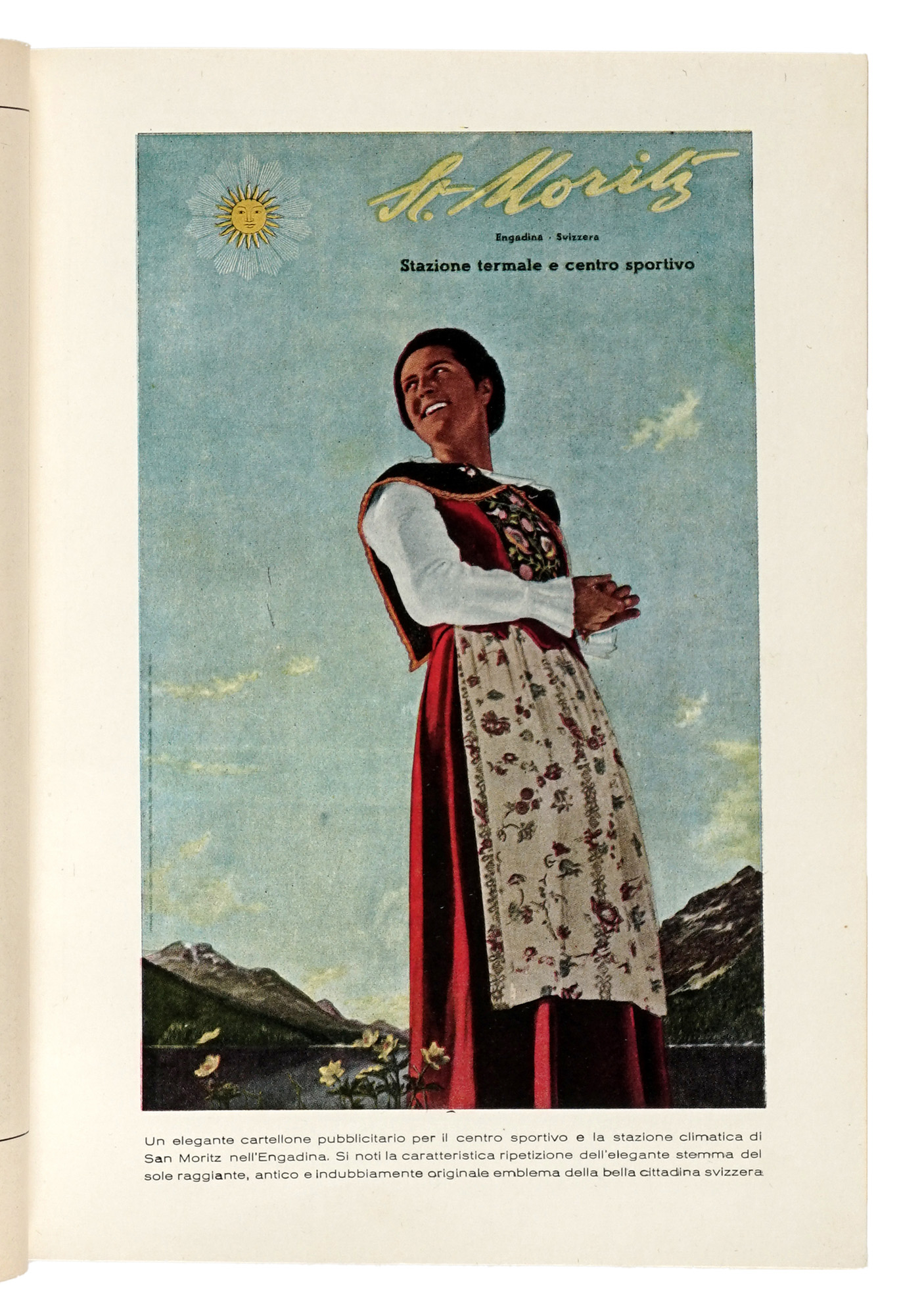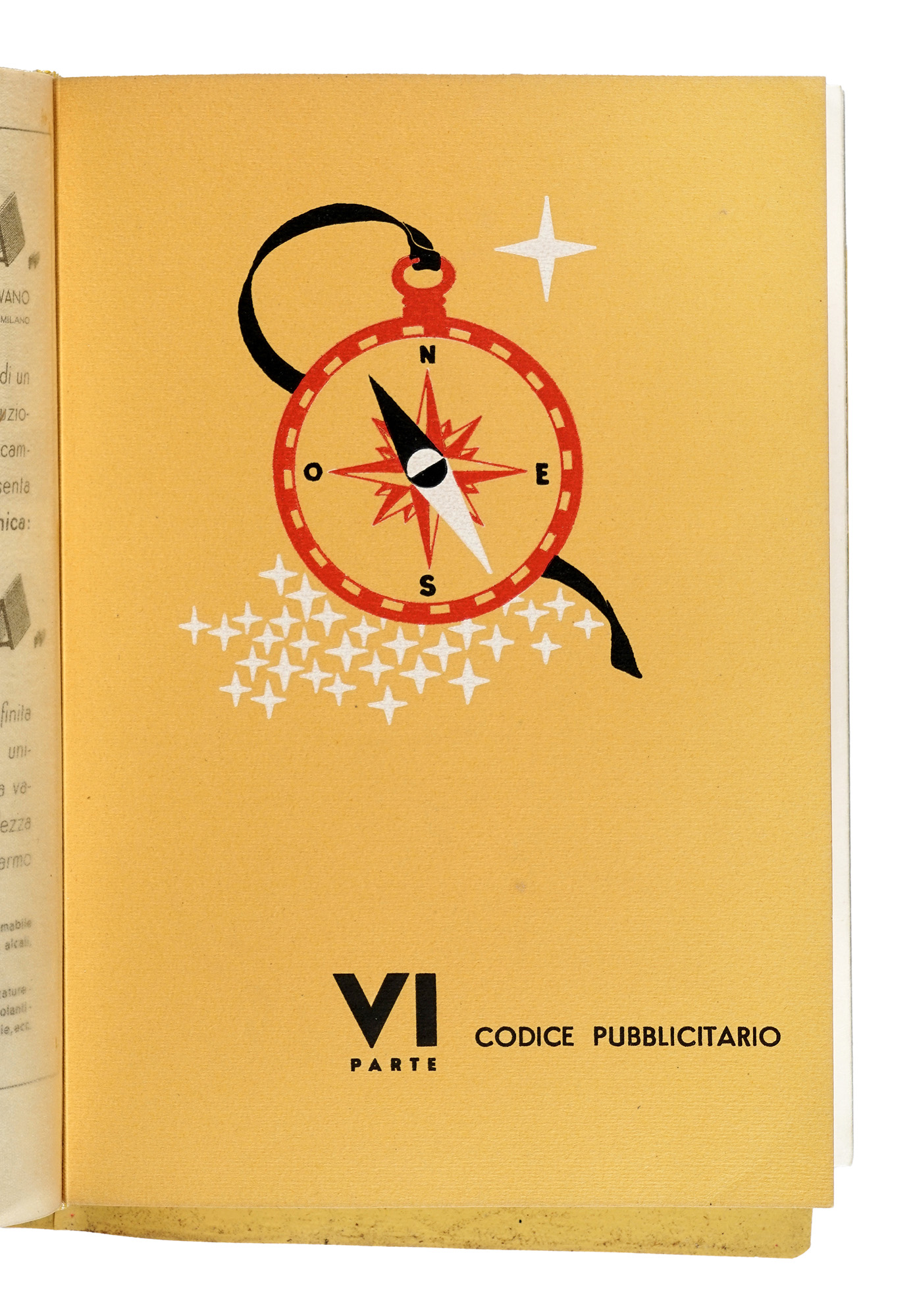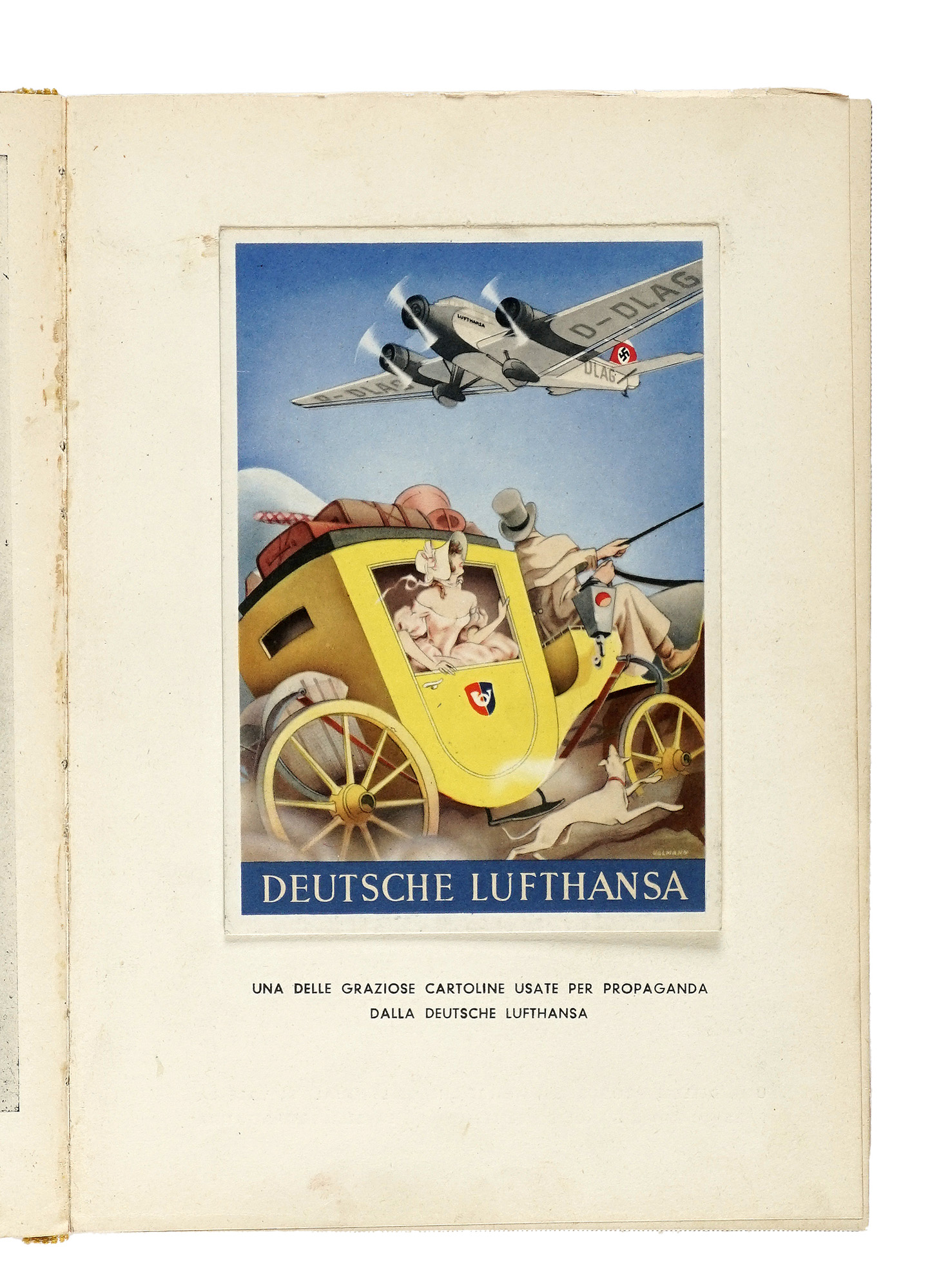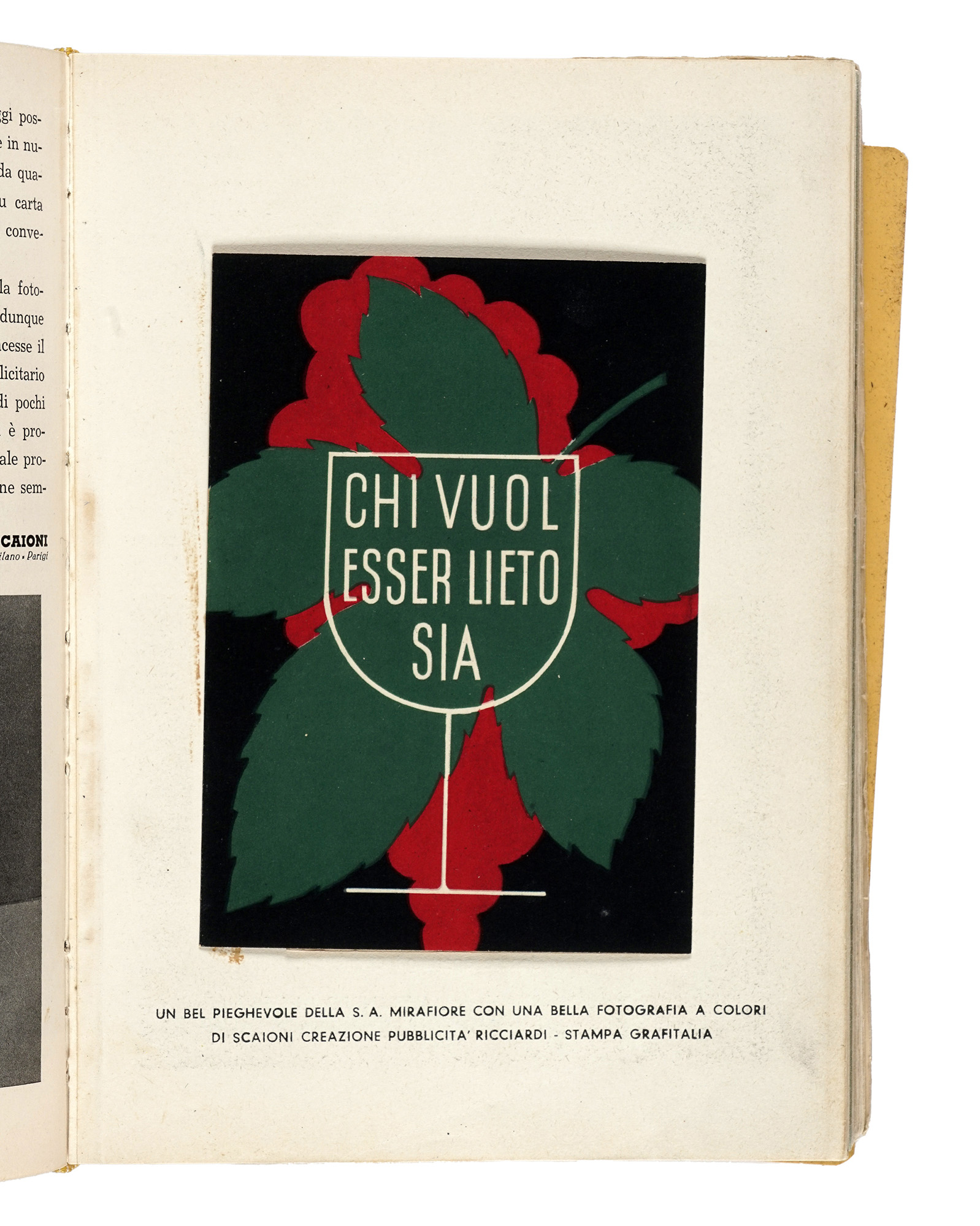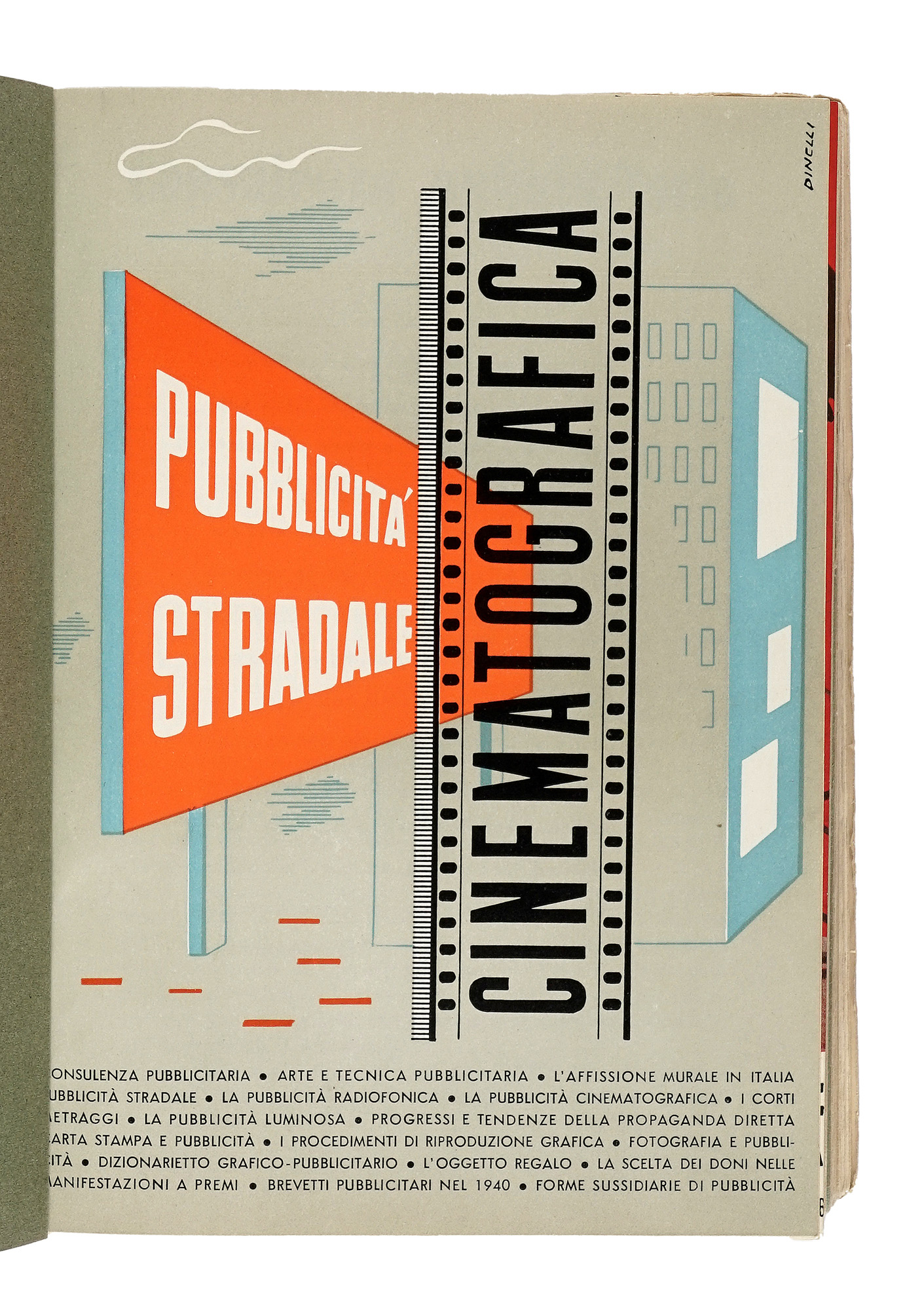 In-8° (mm 238x175). Corposissimo volume, profusamente illustrato, diviso in 8 parti (Propaganda e pubblicità; Pubblicità dell'Asse; Giornali e Riviste; Forme varie di pubblicità; Allestimenti mostre e fiere; Codice pubblicitario; L'ufficio di pubblicità; Indici generali), ciascuna separata da 1 tavola fuori testo stampata su cartoncino colorato, protetto da velina. Numerose tavole in bianco e nero e a colori, anche a piena pagina, nel testo e fuori testo; alcune, bellissime, applicate. Tra le curiosità: 2 fotografie originali applicate, il catalogo delle edizioni Domus; un pieghevole Kneip illustrato da Carboni, uno dell'Ente Nazionale Risi, uno dei Vini Mirafiore, uno di Grafitalia, un libretto pubblicitario Gancia illustrato da Cella, uno di G. Ricordi & Co. e moltissime pubblicità di Bayer, Cirio, Alfa Romeo, Agip, Olivetti, Ramazzotti, Lufthansa e moltissimi altri. Illustrazioni ad opera di Dudovich, Veronesi, Dinelli, Cavadini ed altri. Il tutto stampato su carte di diversi colori e grammature. Una tavola a colori staccata, ma presente e ben conservata. Legatura in cartonato d'attesa muto, con sovraccoperta editoriale in Vipla (resina sintetica di produzione A.C.N.A. Montecatini) con titoli al piatto e al dorso; tracce di polvere e due strappetti senza perdine al dorso, ma nel complesso buona conservazione. (1) Rara e monumentale guida tecnico-professionale alla pubblicità e alla propaganda nell'Italia del Ventennio, pubblicata nel pieno della Seconda guerra mondiale, l'ultima dei tre celebri annuari realizzati da Giulio Cesare Ricciardi dal 1933 al 1941-42. L'opera, articolata in forma enciclopedica, offre una sistematizzazione completa degli strumenti, dei linguaggi e delle regole che governavano l'attività pubblicitaria nel contesto politico, culturale e giuridico del regime fascista. Frutto della visione editoriale di Giulio Cesare Ricciardi, già attivo nel campo della comunicazione e della grafica, la guida costituisce un documento prezioso per comprendere l'intreccio tra finalità commerciali e obiettivi ideologici in un'epoca in cui la propaganda di Stato permeava ogni ambito della comunicazione pubblica e rimane un valido documento della produzione pubblicitaria italiana, ricco di originali interpolati in grado di offrire un quadro particolarmente vivo delle varianti presenti tra i molti studi pubblicitari, milanesi e non solo. Oltre al valore storico-documentario, infatti, la guida è una straordinaria fonte iconografica: numerose riproduzioni, illustrazioni e inserti pubblicitari testimoniano lo stile visivo e l'estetica della comunicazione italiana degli anni Quaranta.
