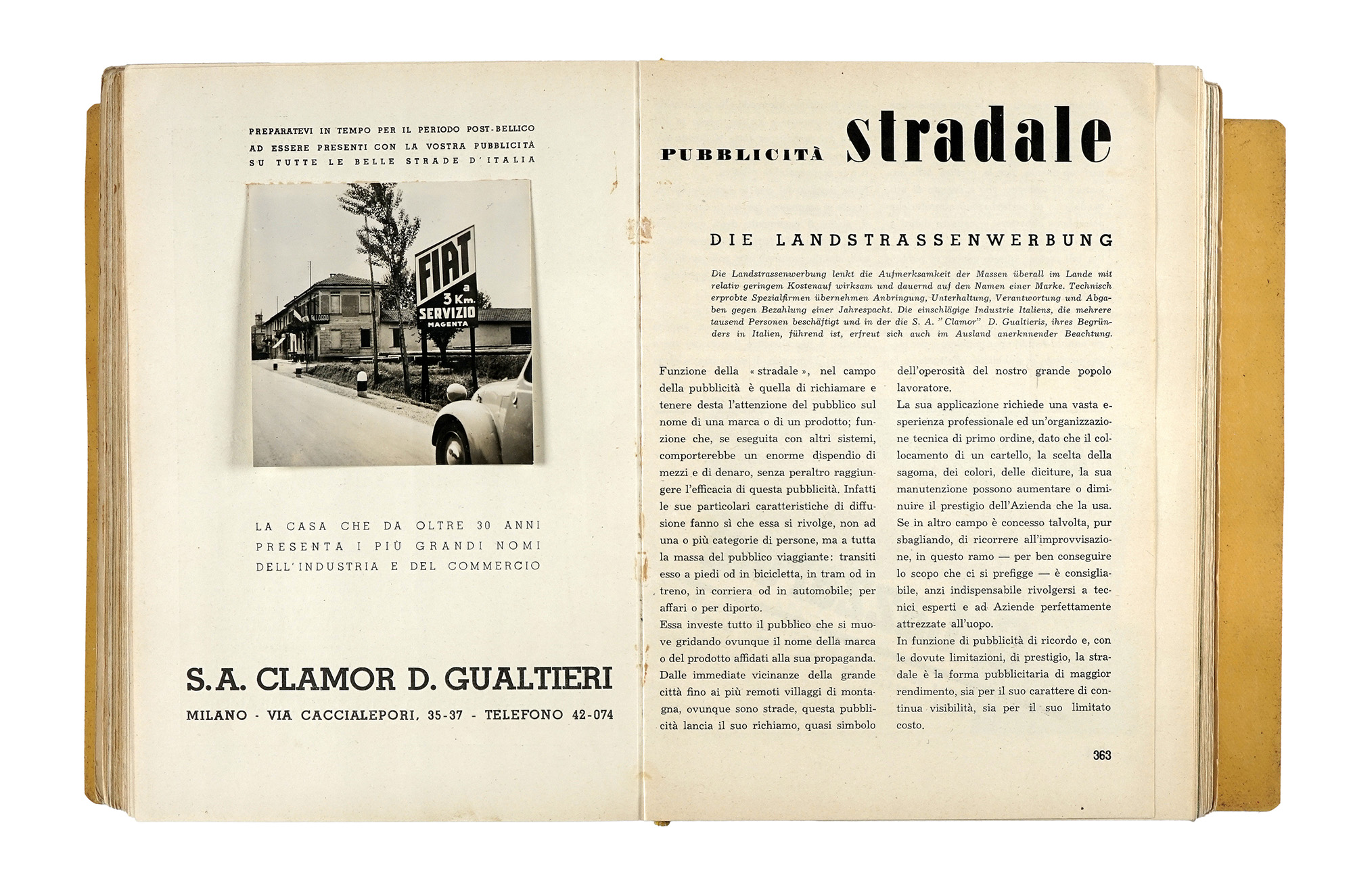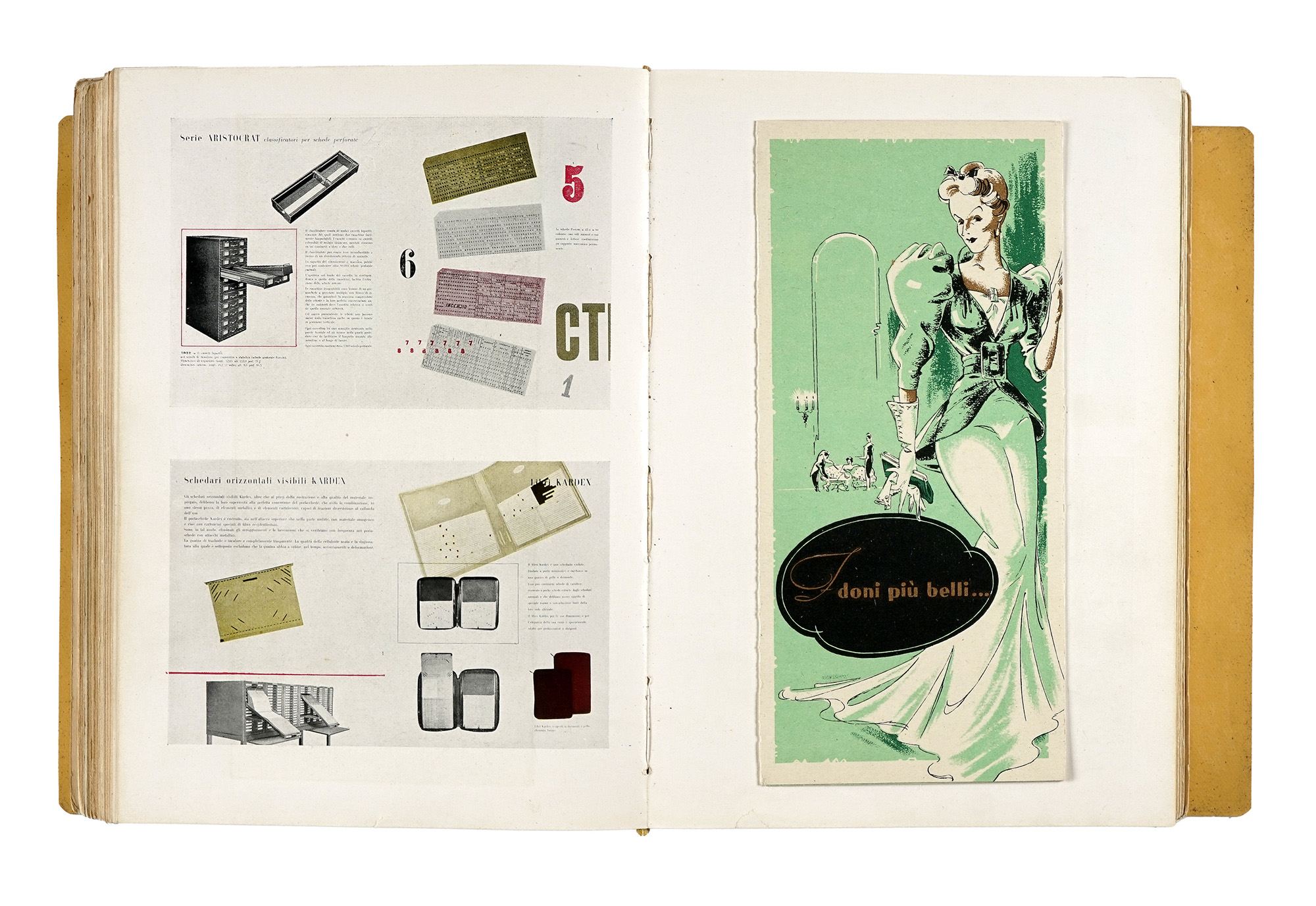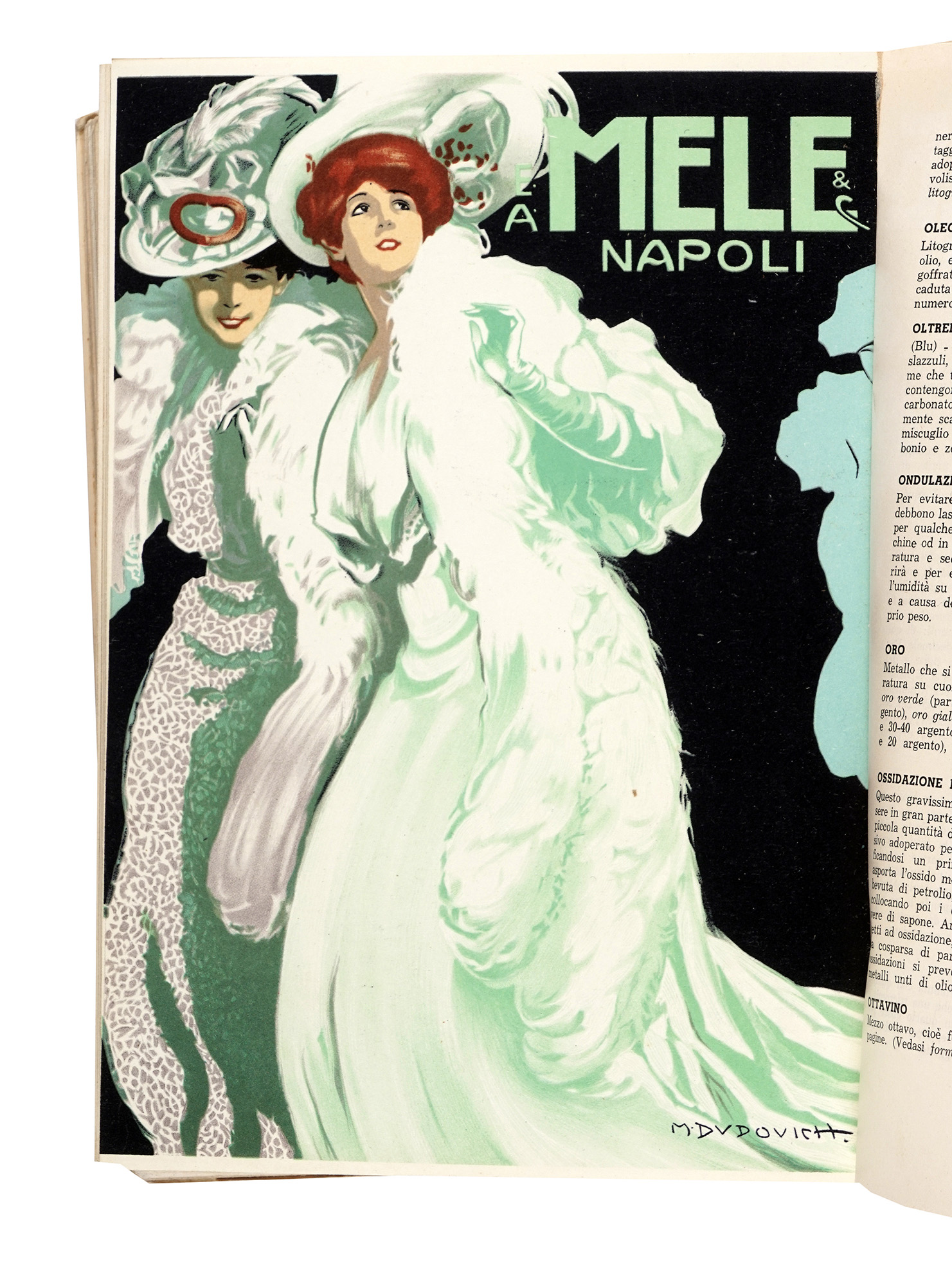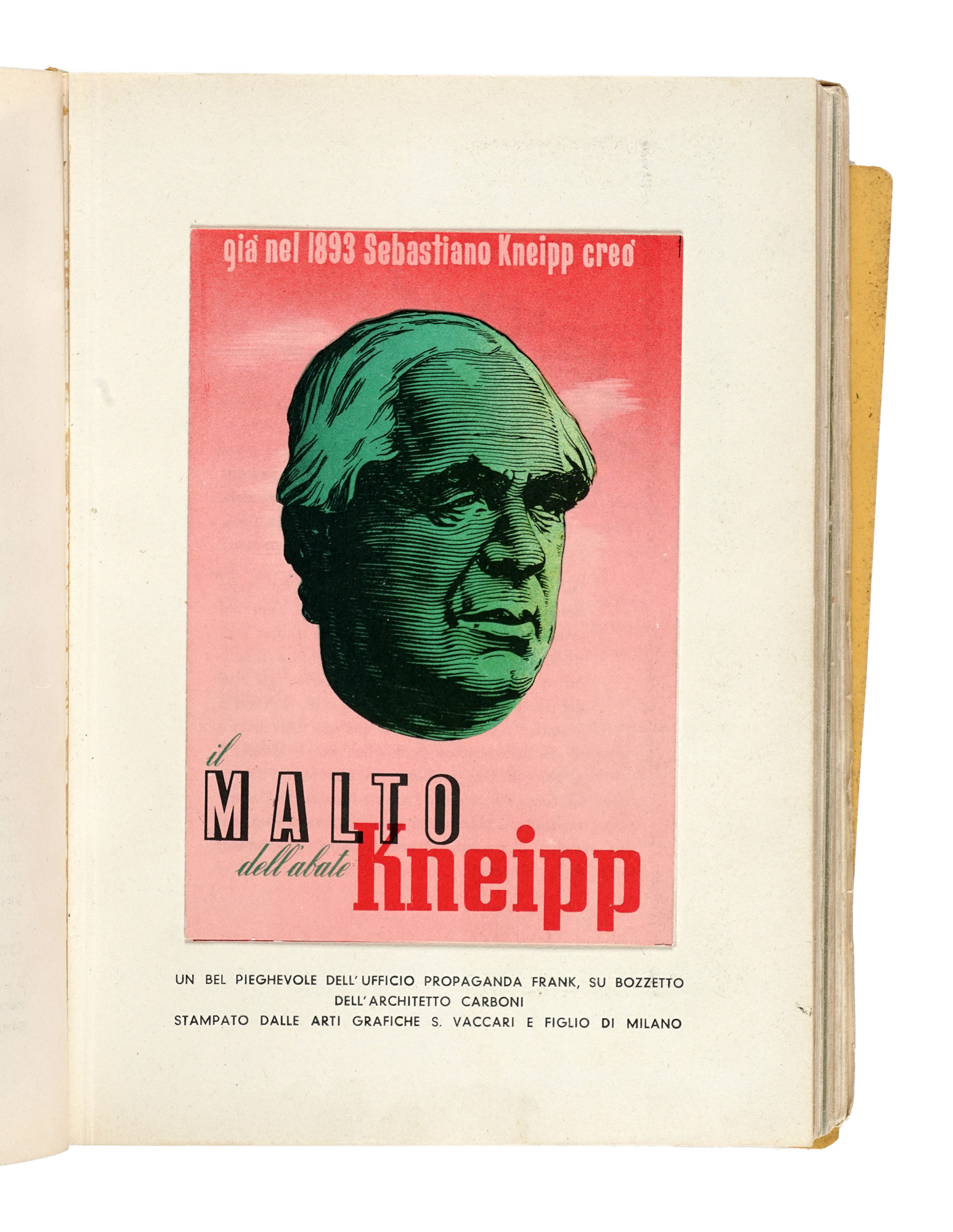 In-8° (mm 238x175). Corposissimo volume, profusamente illustrato, diviso in 8 parti (Propaganda e pubblicità; Pubblicità dell'Asse; Giornali e Riviste; Forme varie di pubblicità; Allestimenti mostre e fiere; Codice pubblicitario; L'ufficio di pubblicità; Indici generali), ciascuna separata da 1 tavola fuori testo stampata su cartoncino colorato, protetto da velina. Numerose tavole in bianco e nero e a colori, anche a piena pagina, nel testo e fuori testo; alcune, bellissime, applicate. Tra le curiosità: 2 fotografie originali applicate, il catalogo delle edizioni Domus; un pieghevole Kneip illustrato da Carboni, uno dell'Ente Nazionale Risi, uno dei Vini Mirafiore, uno di Grafitalia, un libretto pubblicitario Gancia illustrato da Cella, uno di G. Ricordi & Co. e moltissime pubblicità di Bayer, Cirio, Alfa Romeo, Agip, Olivetti, Ramazzotti, Lufthansa e moltissimi altri. Illustrazioni ad opera di Dudovich, Veronesi, Dinelli, Cavadini ed altri. Il tutto stampato su carte di diversi colori e grammature. Una tavola a colori staccata, ma presente e ben conservata. Legatura in cartonato d'attesa muto, con sovraccoperta editoriale in Vipla (resina sintetica di produzione A.C.N.A. Montecatini) con titoli al piatto e al dorso; tracce di polvere e due strappetti senza perdine al dorso, ma nel complesso buona conservazione. (1) Rara e monumentale guida tecnico-professionale alla pubblicità e alla propaganda nell'Italia del Ventennio, pubblicata nel pieno della Seconda guerra mondiale, l'ultima dei tre celebri annuari realizzati da Giulio Cesare Ricciardi dal 1933 al 1941-42. L'opera, articolata in forma enciclopedica, offre una sistematizzazione completa degli strumenti, dei linguaggi e delle regole che governavano l'attività pubblicitaria nel contesto politico, culturale e giuridico del regime fascista. Frutto della visione editoriale di Giulio Cesare Ricciardi, già attivo nel campo della comunicazione e della grafica, la guida costituisce un documento prezioso per comprendere l'intreccio tra finalità commerciali e obiettivi ideologici in un'epoca in cui la propaganda di Stato permeava ogni ambito della comunicazione pubblica e rimane un valido documento della produzione pubblicitaria italiana, ricco di originali interpolati in grado di offrire un quadro particolarmente vivo delle varianti presenti tra i molti studi pubblicitari, milanesi e non solo. Oltre al valore storico-documentario, infatti, la guida è una straordinaria fonte iconografica: numerose riproduzioni, illustrazioni e inserti pubblicitari testimoniano lo stile visivo e l'estetica della comunicazione italiana degli anni Quaranta.
