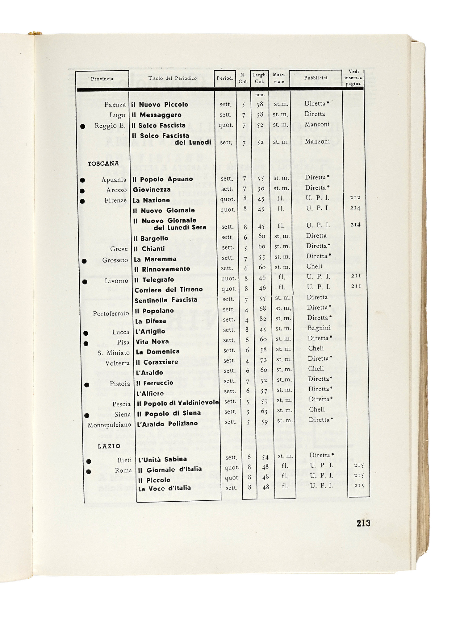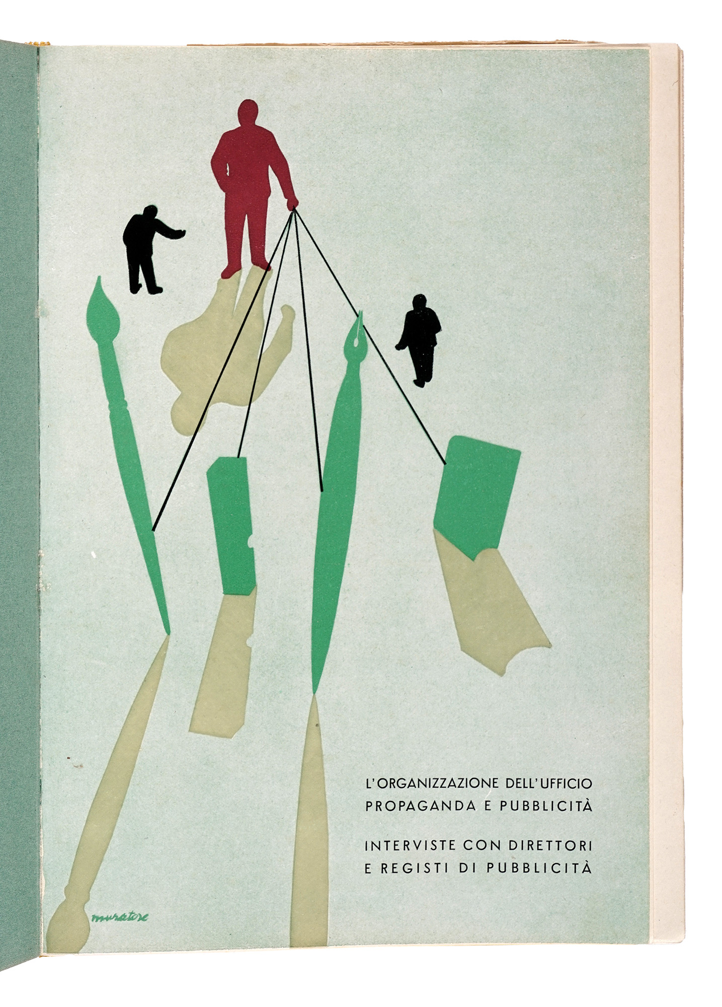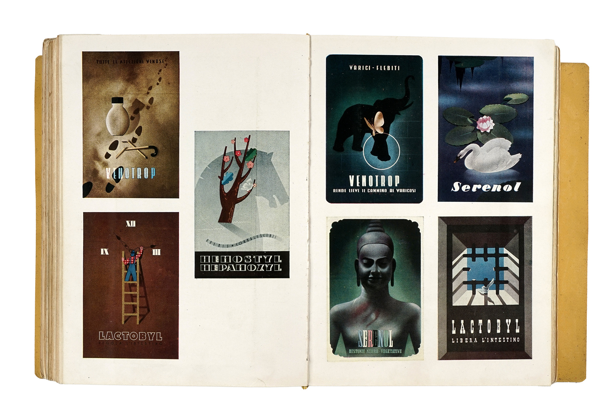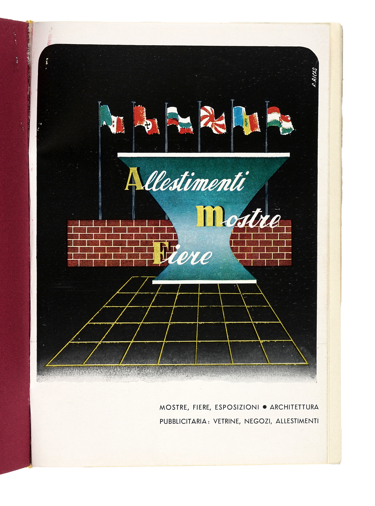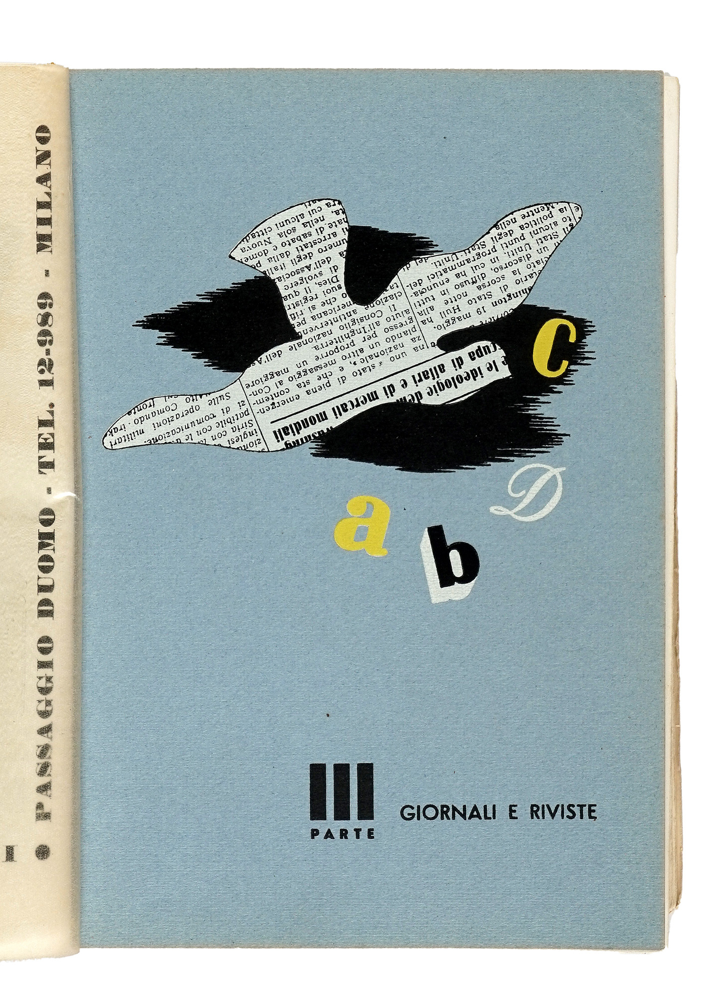 In-8° (mm 238x175). Corposissimo volume, profusamente illustrato, diviso in 8 parti (Propaganda e pubblicità; Pubblicità dell'Asse; Giornali e Riviste; Forme varie di pubblicità; Allestimenti mostre e fiere; Codice pubblicitario; L'ufficio di pubblicità; Indici generali), ciascuna separata da 1 tavola fuori testo stampata su cartoncino colorato, protetto da velina. Numerose tavole in bianco e nero e a colori, anche a piena pagina, nel testo e fuori testo; alcune, bellissime, applicate. Tra le curiosità: 2 fotografie originali applicate, il catalogo delle edizioni Domus; un pieghevole Kneip illustrato da Carboni, uno dell'Ente Nazionale Risi, uno dei Vini Mirafiore, uno di Grafitalia, un libretto pubblicitario Gancia illustrato da Cella, uno di G. Ricordi & Co. e moltissime pubblicità di Bayer, Cirio, Alfa Romeo, Agip, Olivetti, Ramazzotti, Lufthansa e moltissimi altri. Illustrazioni ad opera di Dudovich, Veronesi, Dinelli, Cavadini ed altri. Il tutto stampato su carte di diversi colori e grammature. Una tavola a colori staccata, ma presente e ben conservata. Legatura in cartonato d'attesa muto, con sovraccoperta editoriale in Vipla (resina sintetica di produzione A.C.N.A. Montecatini) con titoli al piatto e al dorso; tracce di polvere e due strappetti senza perdine al dorso, ma nel complesso buona conservazione. (1) Rara e monumentale guida tecnico-professionale alla pubblicità e alla propaganda nell'Italia del Ventennio, pubblicata nel pieno della Seconda guerra mondiale, l'ultima dei tre celebri annuari realizzati da Giulio Cesare Ricciardi dal 1933 al 1941-42. L'opera, articolata in forma enciclopedica, offre una sistematizzazione completa degli strumenti, dei linguaggi e delle regole che governavano l'attività pubblicitaria nel contesto politico, culturale e giuridico del regime fascista. Frutto della visione editoriale di Giulio Cesare Ricciardi, già attivo nel campo della comunicazione e della grafica, la guida costituisce un documento prezioso per comprendere l'intreccio tra finalità commerciali e obiettivi ideologici in un'epoca in cui la propaganda di Stato permeava ogni ambito della comunicazione pubblica e rimane un valido documento della produzione pubblicitaria italiana, ricco di originali interpolati in grado di offrire un quadro particolarmente vivo delle varianti presenti tra i molti studi pubblicitari, milanesi e non solo. Oltre al valore storico-documentario, infatti, la guida è una straordinaria fonte iconografica: numerose riproduzioni, illustrazioni e inserti pubblicitari testimoniano lo stile visivo e l'estetica della comunicazione italiana degli anni Quaranta.