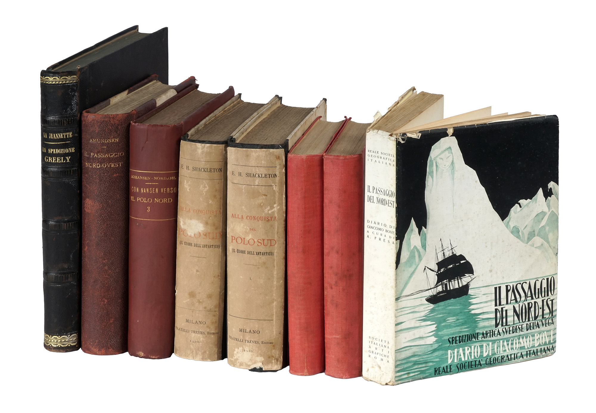 Compongono il lotto: 1) Stanley Henry Morton, Nell'Africa tenebrosa ovvero Ricerca, liberazione e ritorno di Emin governatore della Provincia equatoriale [...]. Volume I (-II). Milano: fratelli Treves, 1890. 2) Luigi di Savoia - Duca degli Abruzzi, La stella polare nel Mare Artico... Milano: Hoepli, 1903; 3) Id., La stella polare nel Mare Artico... Milano: Hoepli, 1913; 4) Id., Il Ruwenzori. Viaggio di esplorazione e prime ascensioni delle più alte vette nella catena nevosa situata fra i grandi laghi equatoriali dell'Africa centrale... Milano: Hoepli, 1908; 5) Verso Il Polo Sud: Memorie della Spedizione Antartica Diretta dal Prof. O. Nordenskjold (1901-1903). Milano: fratelli Treves, 1907; 6) Il passaggio del nord-est. Spedizione artica svedese della Vega. Roma: Società Italiana Arti Grafiche, 1940; 7) Il viaggio della Jeannette e la spedizione Greely. Milano: fratelli Treves, 1886; 8) Al Polo Nord in pallone. Roma: Enrico Voghera editore, 1898; 9) Amundsen Roald, Il Passaggio Nord-Ovest. La mia spedizione polare sulla Gjoa... Milano: fratelli Treves, 1908; 10) Klutschak Enrico, Da eschimese fra gli eschimesi. Racconto delle avventure della spedizione Schwatka alla ricerca di Franklin negli anni 1878-79. Milano: fratelli Treves, 1883; 11) Lotte e vittorie. Dal Polo Artico a Marsala. Milano: Hoepli, 1907; 12) Shackleton Ernest, Alla conquista del Polo Sud [...]. Vol I (-II). Milano: fratelli Treves, 1909; 13) Nansen Fridtjof, Fra ghiacci e tenebre. Spedizione polare norvegese [...] Volume I (-II, di III). Roma: Voghera editore, 1897; 14) Nansen Fridtjof, Fra ghiacci e tenebre. Spedizione polare norvegese [...] Volume III. Roma: Voghera editore, 1900. Difetti da controllare. Lotto non passibile di restituzione. (17)