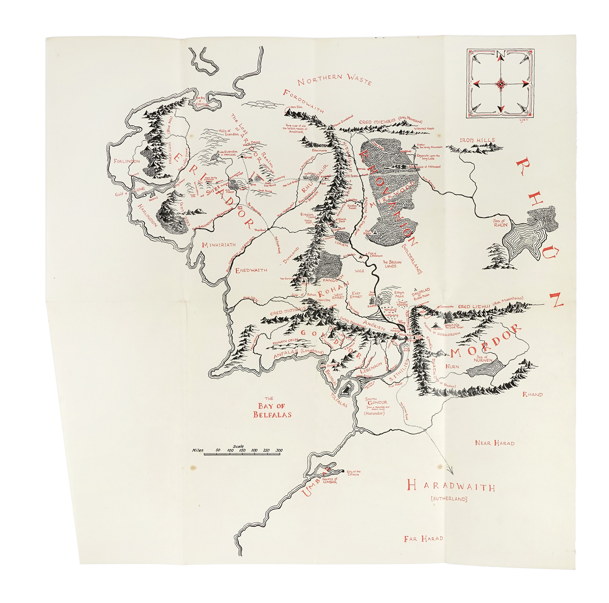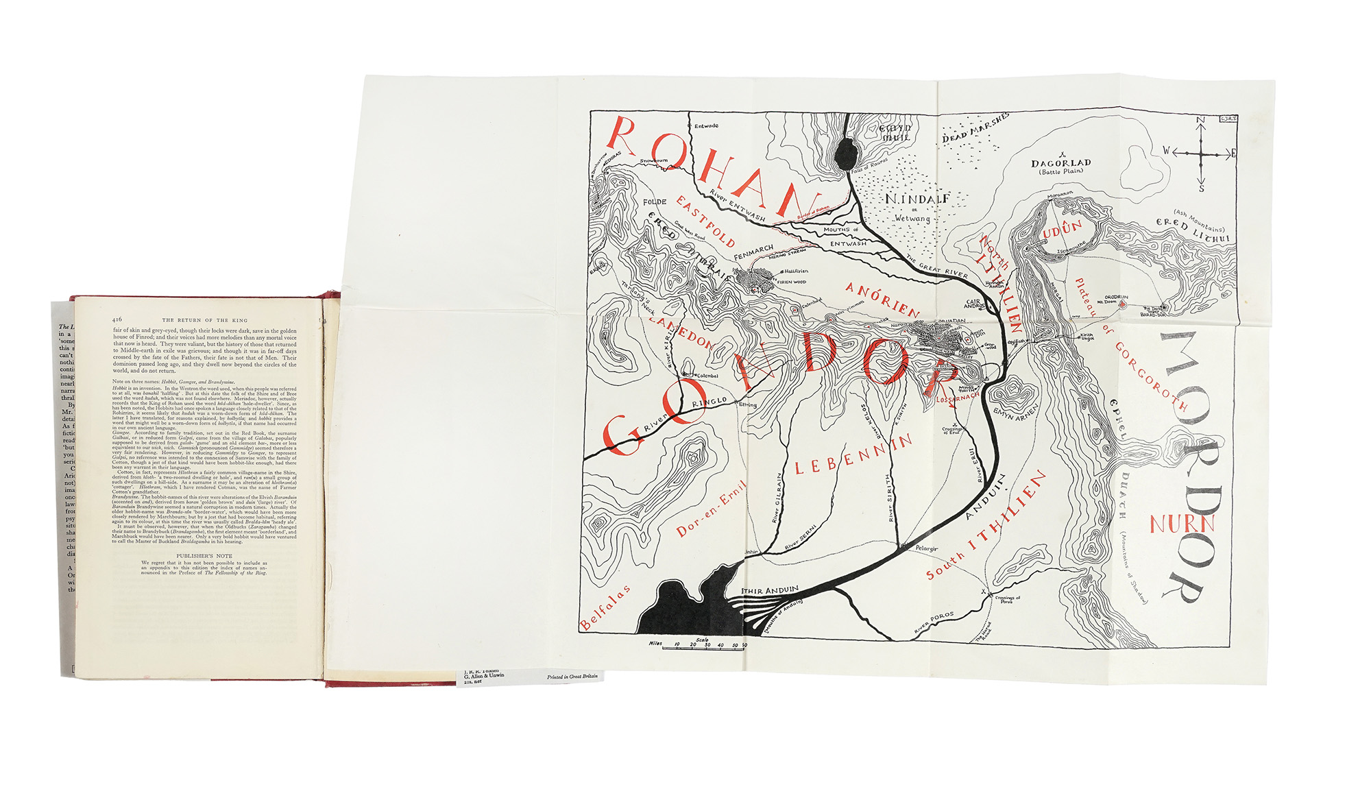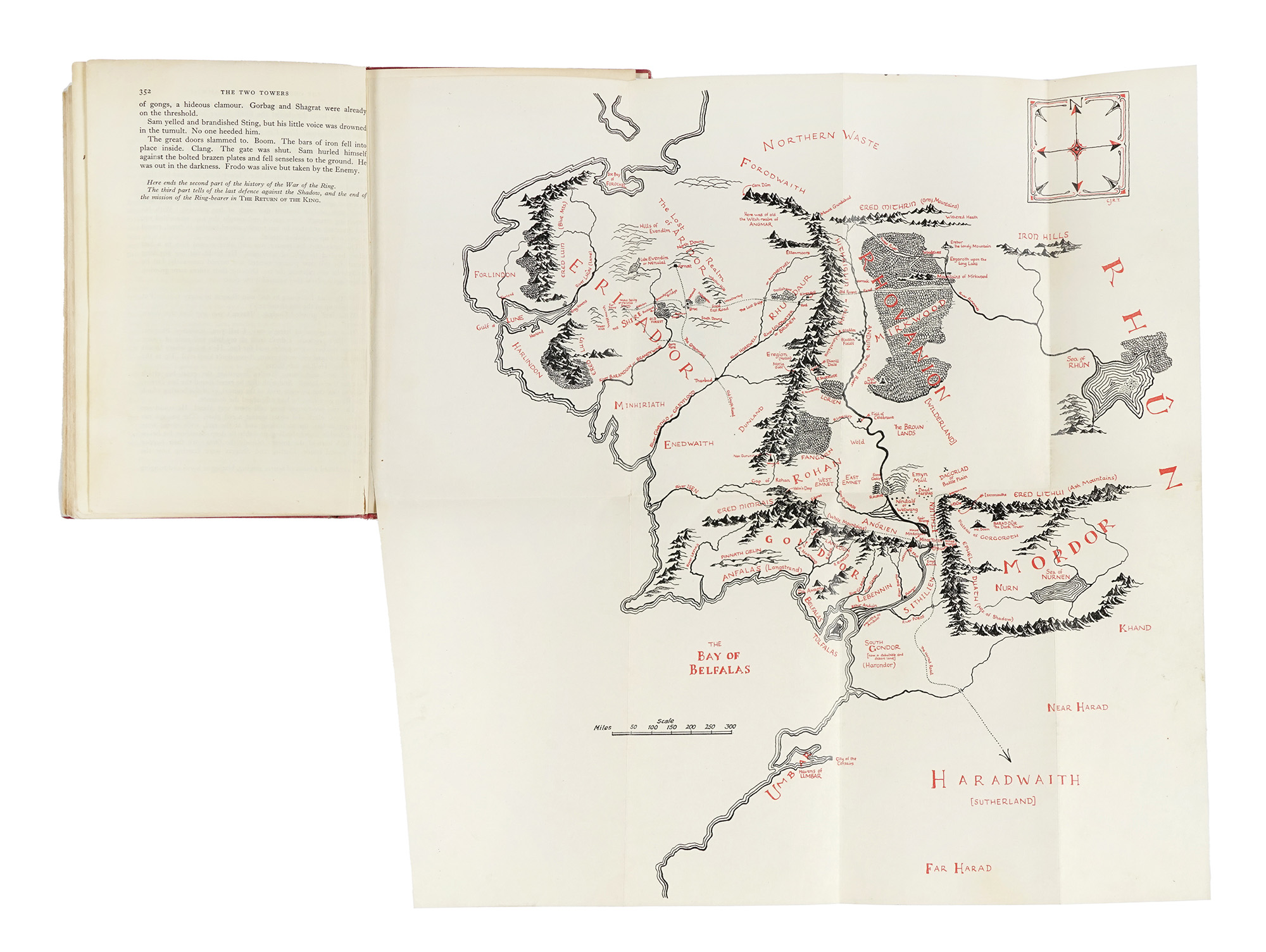3 volumi in-8° (mm 215x135). Pagine 423, [1] + 1 mappa più volte ripiegata; 352 + 1 mappa più volte ripiegata, rilegata in fine; 416 + 1 mappa più volte ripiegata, rilegata in fine. Staccata, ma presente e ben conservata - ad eccezione di alcune macchioline - la mappa al primo volume; in facsimile quella del terzo. Macchioline sparse, più evidenti alle pagg. 251-254 del terzo volume, e rarissimi strappetti marginali. Legatura editoriale in piena tela rossa, con titoli al dorso. Ampie macchie ai piatti, restauri ai dorsi, con difetti alle cuffie e alle cerniere. Tutti i volumi risultano provvisti di sovraccoperte illustrate in facsimile, provenienti dalla Tolkien Library. (3) Prima edizione della trilogia de Il Signore degli Anelli, opera fondamentale della narrativa fantasy e uno dei libri più venduti di tutti i tempi, che comprendente: The Fellowship of the Ring (prima edizione, seconda impressione, dicembre 1954), The Two Towers (prima edizione, seconda impressione, 1955) e The Return of the King (prima edizione, prima impressione, 1955, con la segnatura 4 e il testo disallineato a pag. 49). A seguito dello straordinario successo di The Hobbit nel 1937, l'editore George Allen & Unwin incoraggiò Tolkien a scrivere un seguito. L'opera vide la luce solo tra il 1954 e il 1955, frutto di una lunga gestazione segnata dalla rigorosa attività accademica dell'autore a Oxford, dalle sue meticolose ricerche e da una serie di discussioni con l'editore sull'impostazione narrativa. Sebbene oggi universalmente conosciuta come una "trilogia", The Lord of the Rings fu concepita da Tolkien come un'opera unitaria. La divisione in tre volumi fu dettata da motivi esclusivamente economici, legati agli alti costi di stampa del dopoguerra. Il mondo della Terra di Mezzo nasce dalla profonda passione di Tolkien per le leggende celtiche e scandinave, per le lingue antiche e la letteratura anglosassone – in particolare Beowulf – ma anche dalla sua avversione per l'industrializzazione e la guerra. Il Borgo, che apre la narrazione, rievoca un'Inghilterra rurale e serena, preindustriale, mentre le forze di Mordor incarnano il potere cieco, meccanizzato e distruttivo della modernità. The Lord of the Rings è al tempo stesso epica classica e narrazione del viaggio dell'eroe, una lotta tra bene e male sospinta dal desiderio di dominio e di immortalità. Un'opera-mondo, senza precedenti nella letteratura moderna, la cui influenza ha travalicato il genere fantasy e la cui prima edizione è oggi una delle più ambite del Novecento.