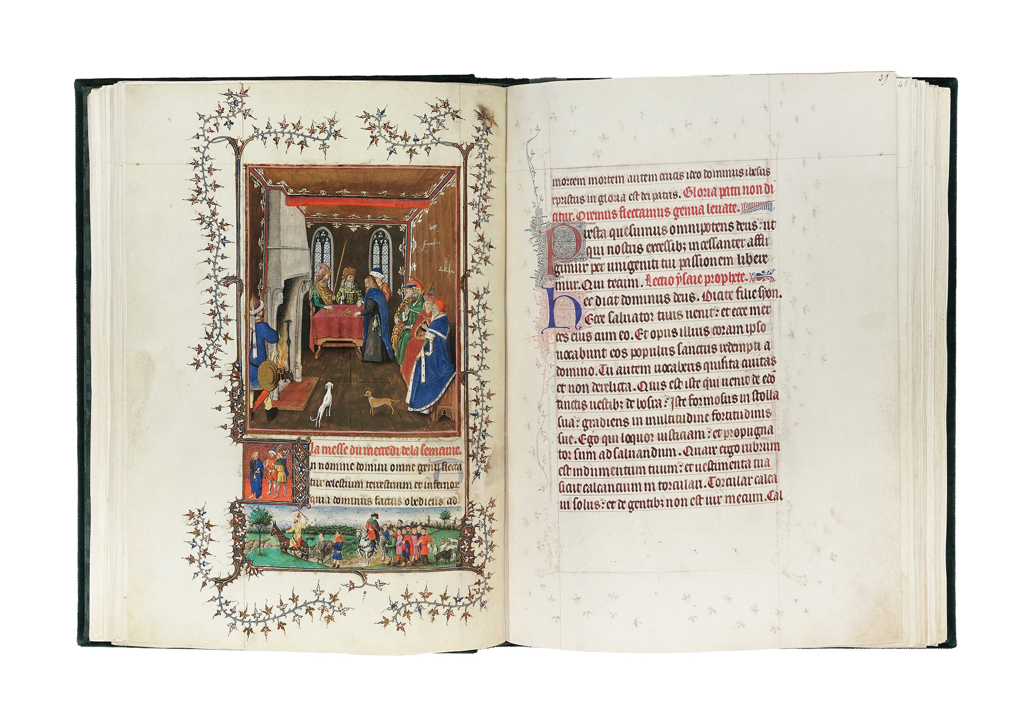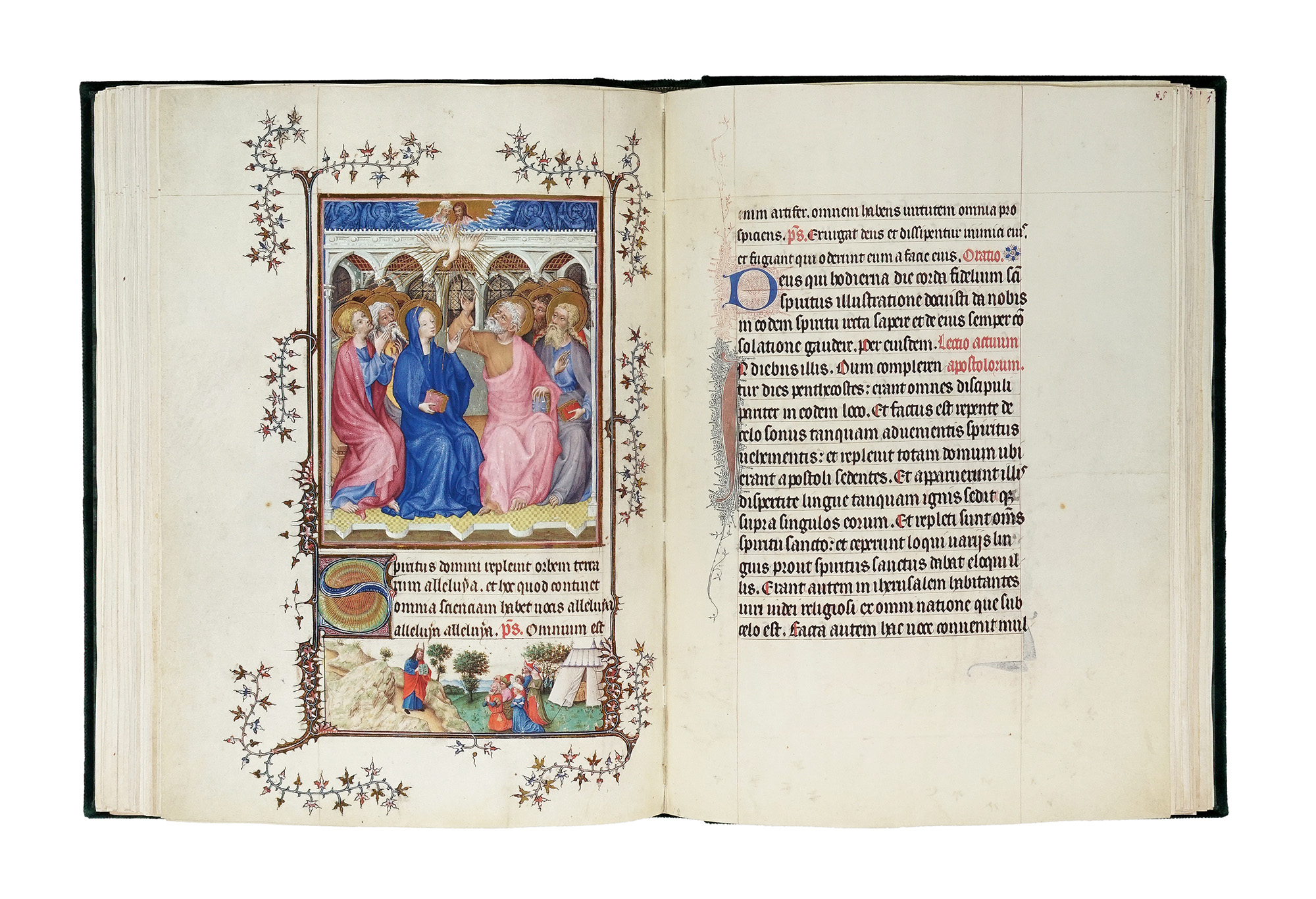 In-4° (mm 285 x 200). Riproduzione dettagliata a colori del codice originale, con numerose vignette a piena pagina. Legatura in velluto verde con decori floreali e stemma della Biblioteca di Gian Giacomo Trivulzio in oro al piatto anteriore; tagli dorati e sguardie in seta verde. Entro cofanetto di velluto bianco con stemma in metallo al piatto, con minime tracce d'uso. Con volume di Commentario. Uno dei 199 esemplari riservati all'Italia e numerati IT 1 - IT 199, su una tiratura complessiva di 980 copie. (2) Riproduzione in facsimile del libro d'ore di Torino-Milano. Originariamente, il libro d'ore era una parte fondamentale delle Très Belles Heures de Notre-Dame commissionate da Jean de Berry (1340-1416). Per via ereditaria, l'opera incompleta giunse in possesso del conte Johann von Holland, che ne commissionò il completamento ad un artista fiammingo, molto probabilmente Jan van Eyck (1390-1441). Dopo essere appartenuto a Vittorio Amedeo II Duca di Savoia (1666-1732), il codice passò nelle mani della famiglia Trivulzio, per poi essere trasferito alla Biblioteca di Arte Antica di Torino, dove è conservato ancora oggi.