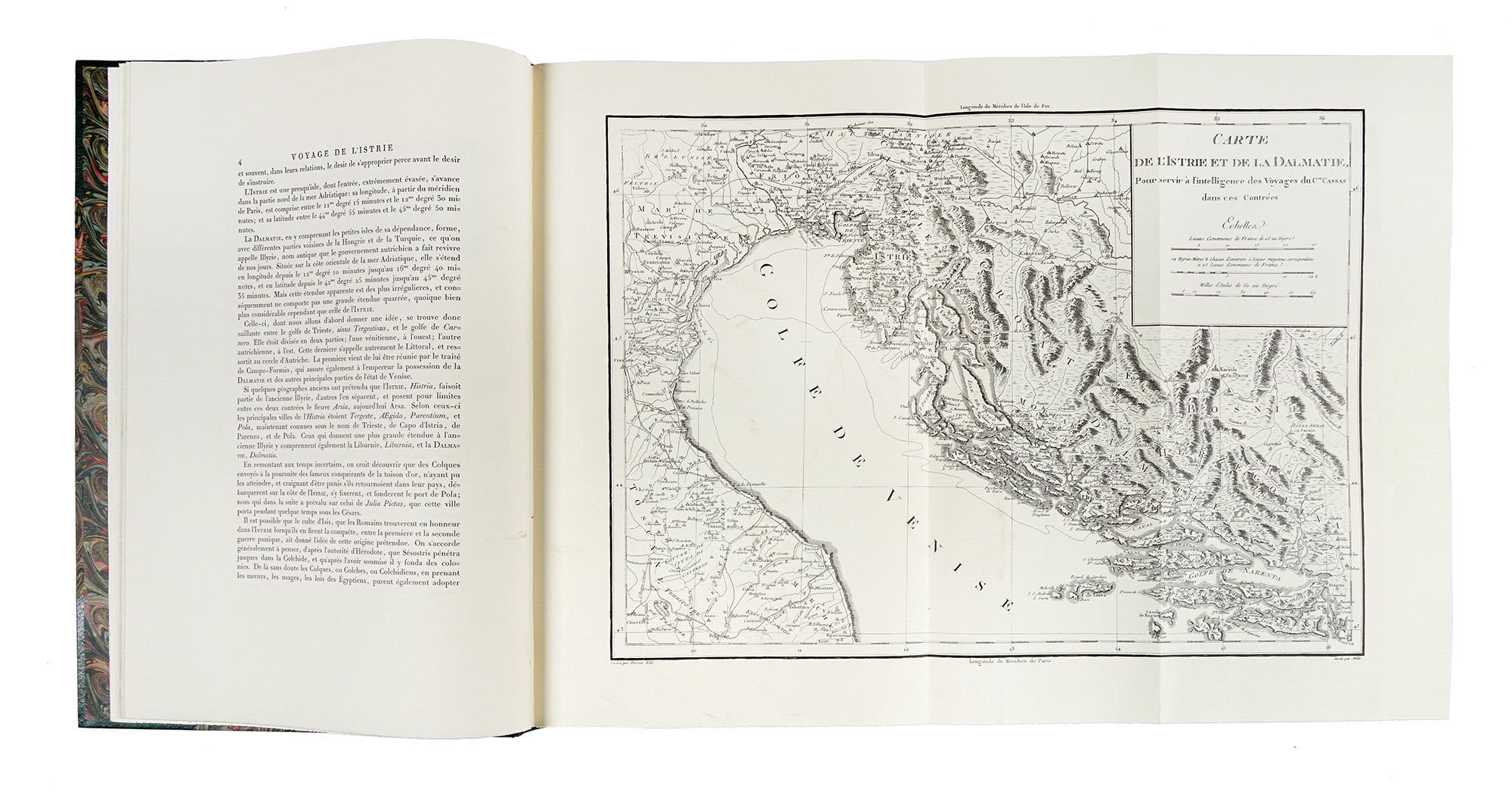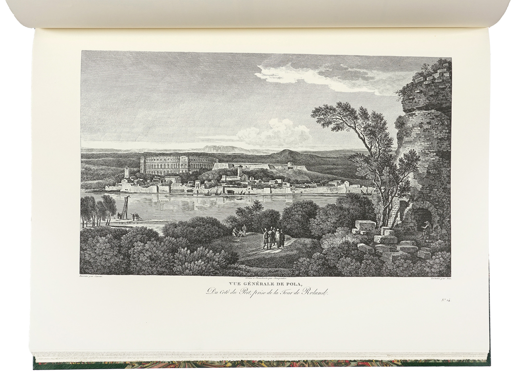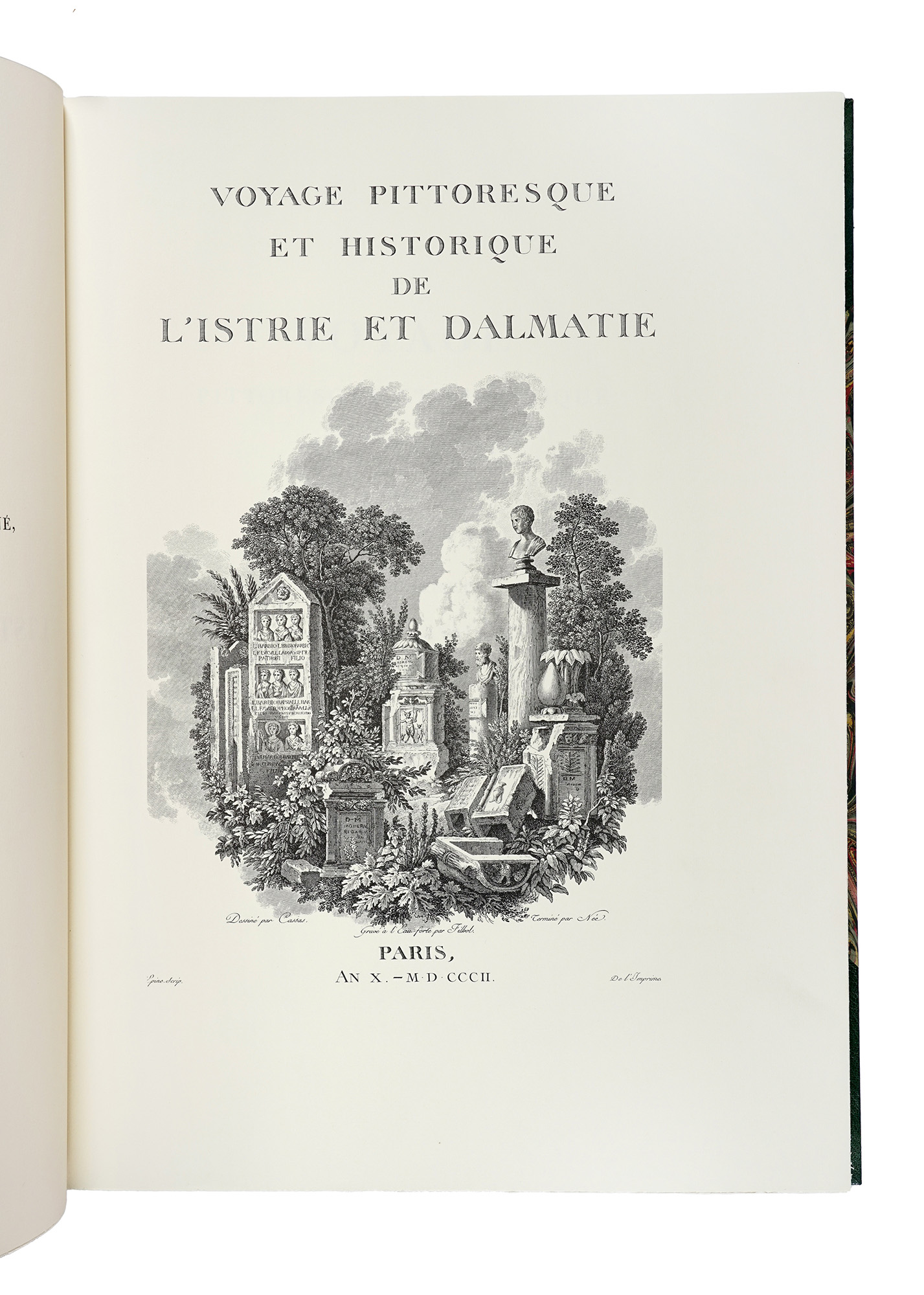 In-folio (mm 500x350). Bell'esemplare in barbe, profusamente illustrato, anche con vedute di Trieste, Pola e di altre località istriane e dalmate. (1) Questa pregevole ristampa anastatica del 1974, curata dalla storica Libreria Antiquaria Saba di Trieste, costituisce un omaggio filologico alla splendida opera originale di Lavallée e Cassas. L'edizione riproduce fedelmente il testo francese del primo viaggio illustrato dell'Istria e della Dalmazia, impreziosito da incisioni raffinate, mappe dettagliate e grandiose vedute delle coste adriatiche. Le vedute di Trieste, considerate in assoluto tra le più belle e famose della città, rappresentano non solo un interesse artistico ma anche un documento storico fondamentale per studiosi e collezionisti.