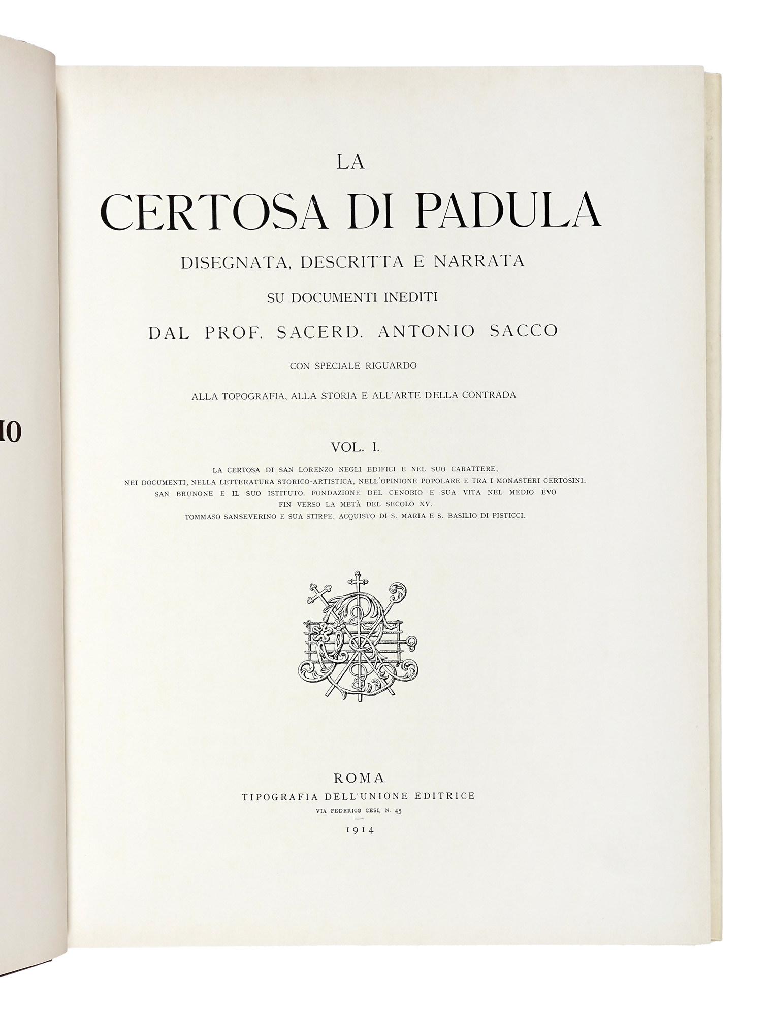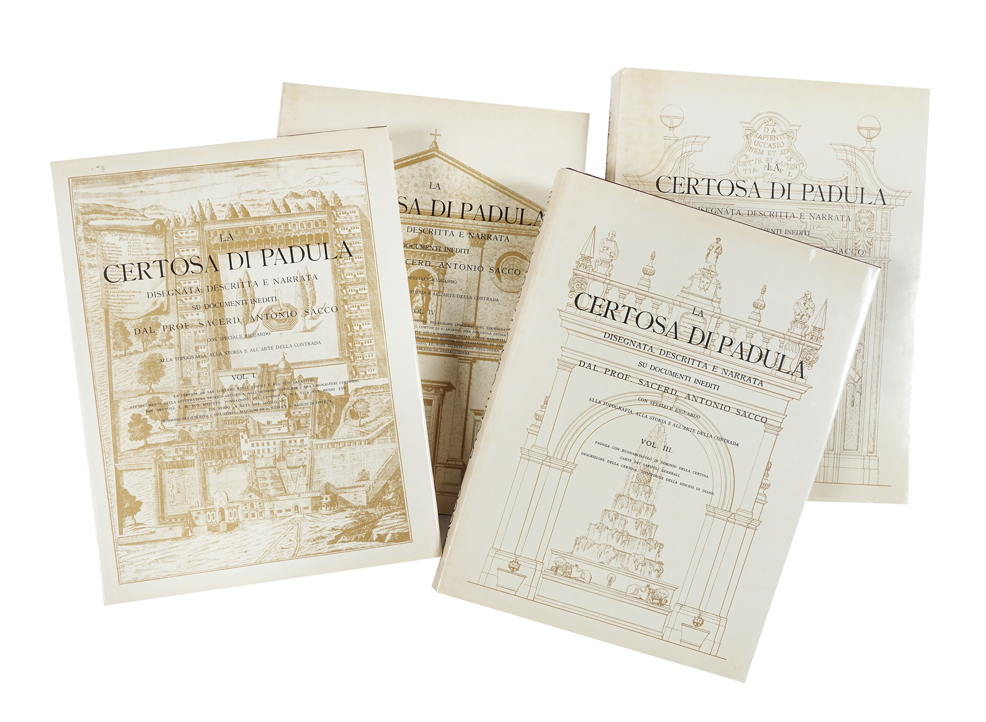 4 volumi in-folio (mm 400x300). Lievi arrossature marginali sparse, altrimenti ottimo esemplare, con numerose illustrazioni nel testo e fuori testo, anche a doppia o tripla pagina. Legatura editoriale in similpelle, con titoli in oro al dorso e sovraccoperte figurate. Quest'ultime presentano arrossature marginali. (4) Ristampa anastatica fuori commercio dell'edizione pubblicata a Roma tra il 1914 e il 1930. Monumentale opera sulla Certosa di Padula scritta dall'Arcivescovo Monsignor Antonio Sacco, con numerosi documenti e riferimenti storici.