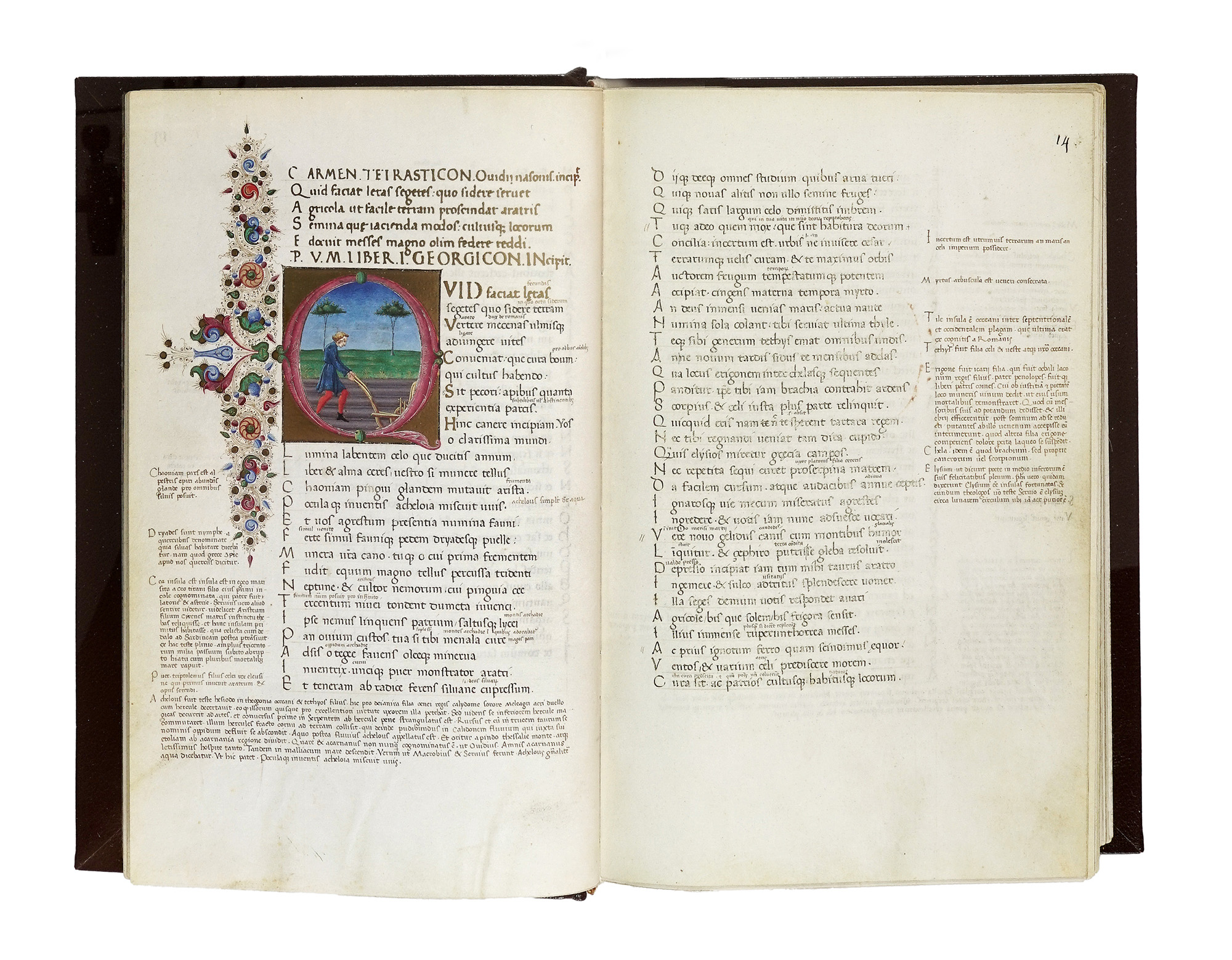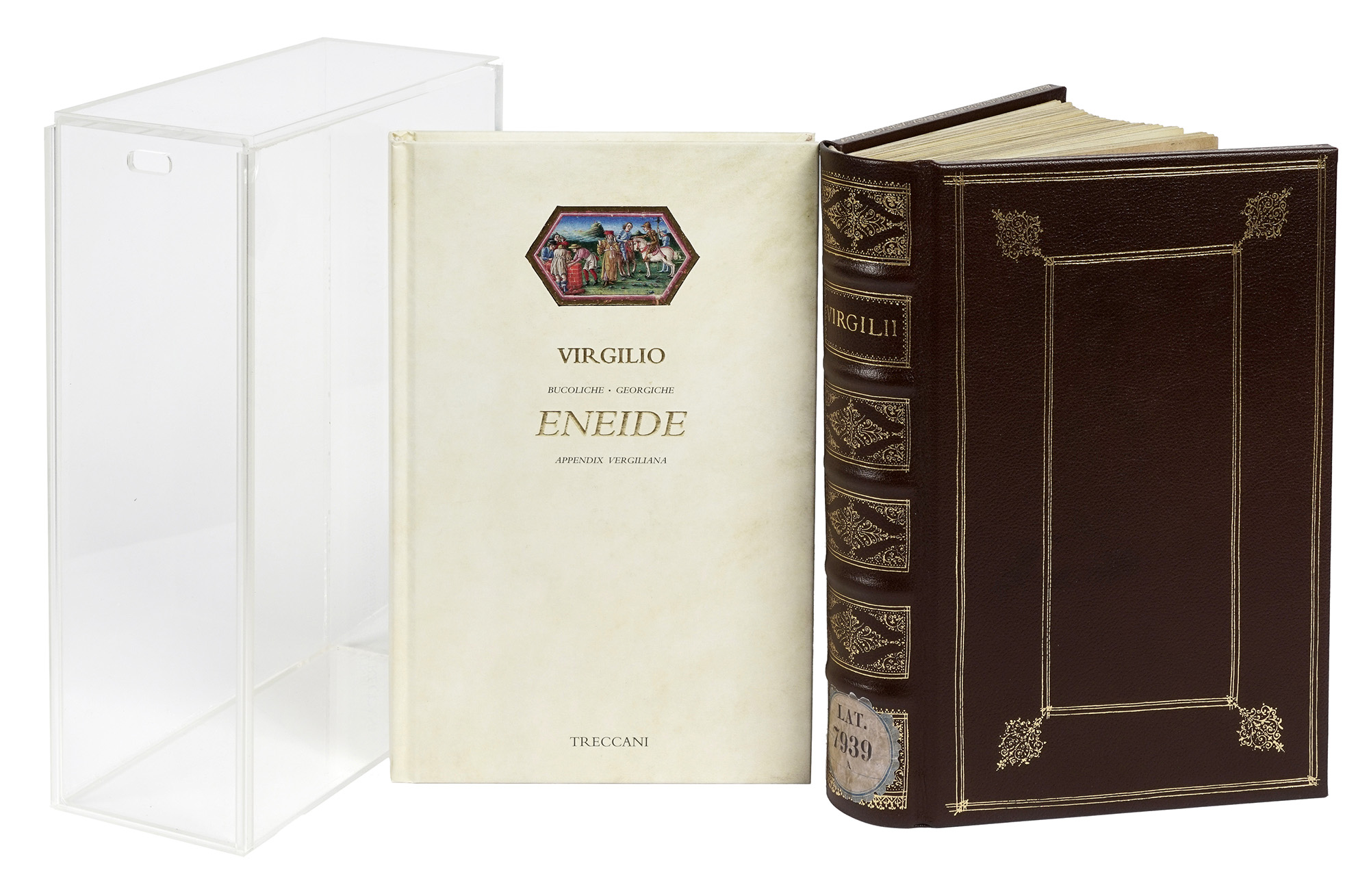 In-8° (mm 265x175). Riproduzione dettagliata a colori del codice originale. Legatura in pelle, protetta da velina, con cornici dorate ai piatti, titoli e fregi in oro al dorso a 5 nervi e dentelles. Con un volume di Commentario. Il tutto perfettamente conservato entro cofanetto originale in plexiglass. Uno dei 499 esemplari in numeri arabi, su una tiratura complessiva di 509 copie. (2) Magnifica edizione facsimilare del celebre codice virgiliano Ms. Lat. 7939A, realizzato a Ferrara tra il 1458–1459 dai maestri Guglielmo Giraldi e Giorgio d'Alemagna nello stile del gotico internazionale e custodito presso la Bibliothèque Nationale de France.