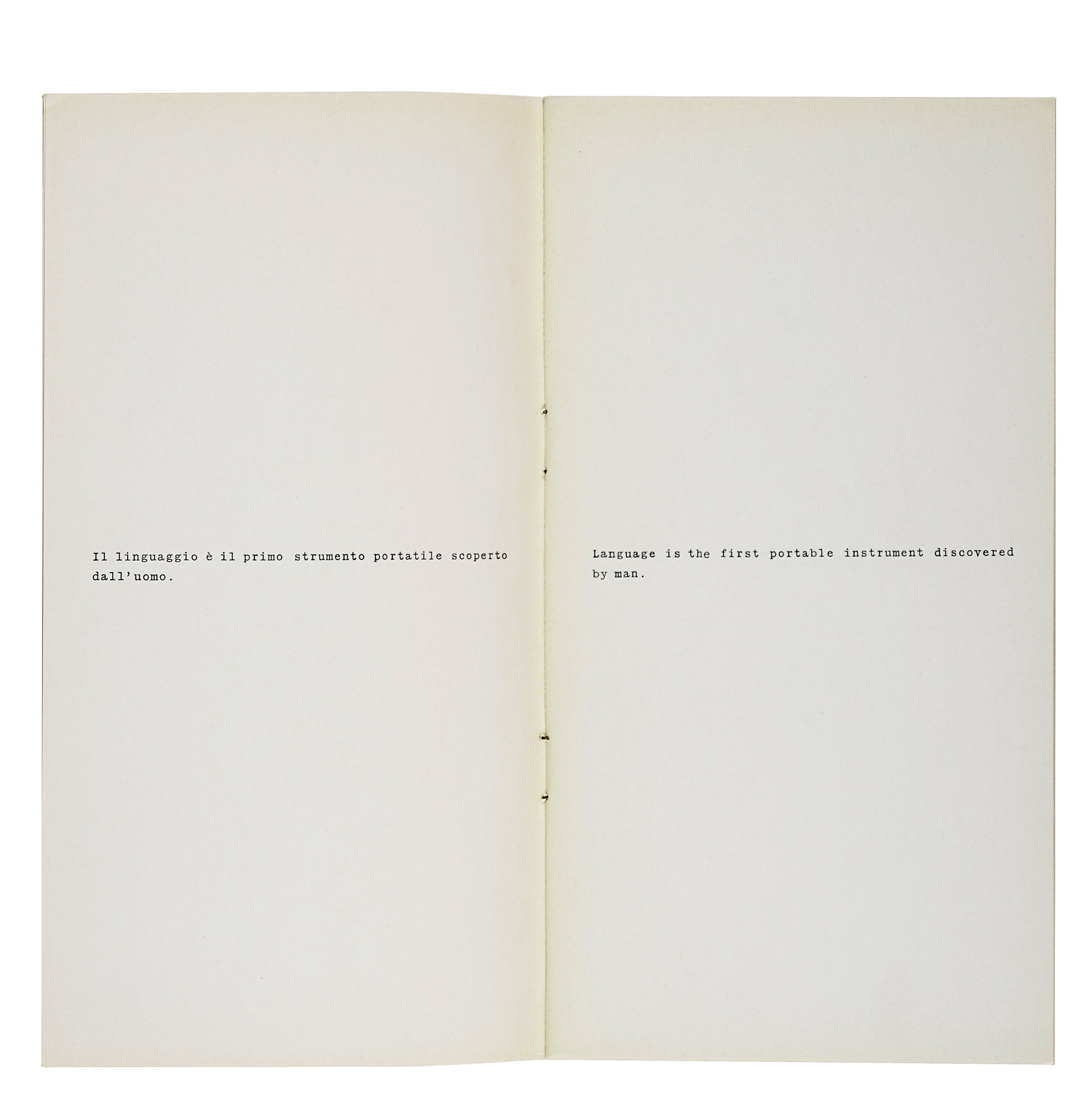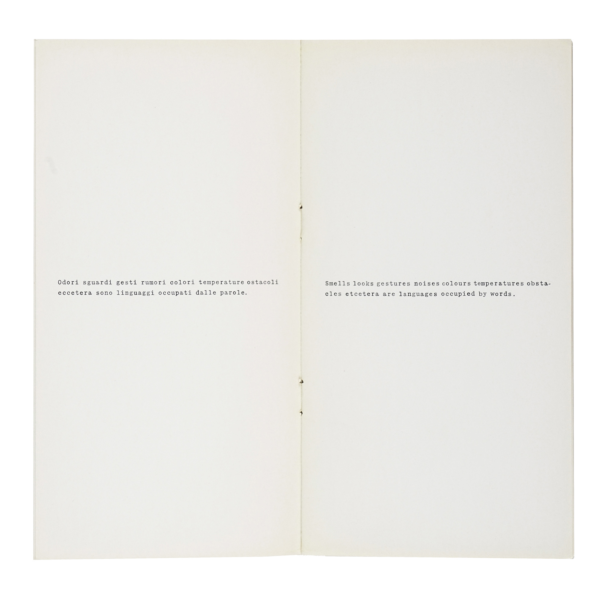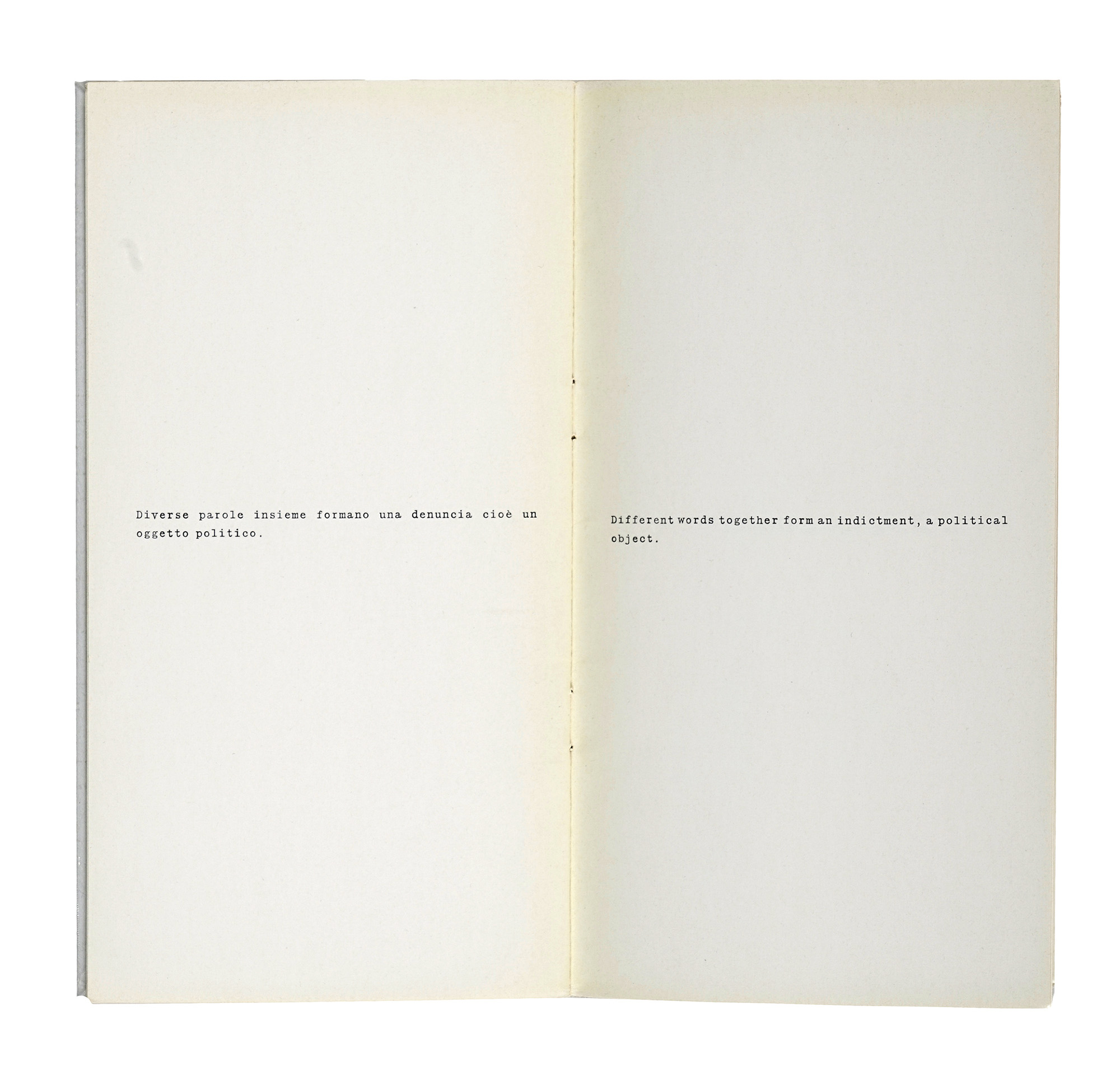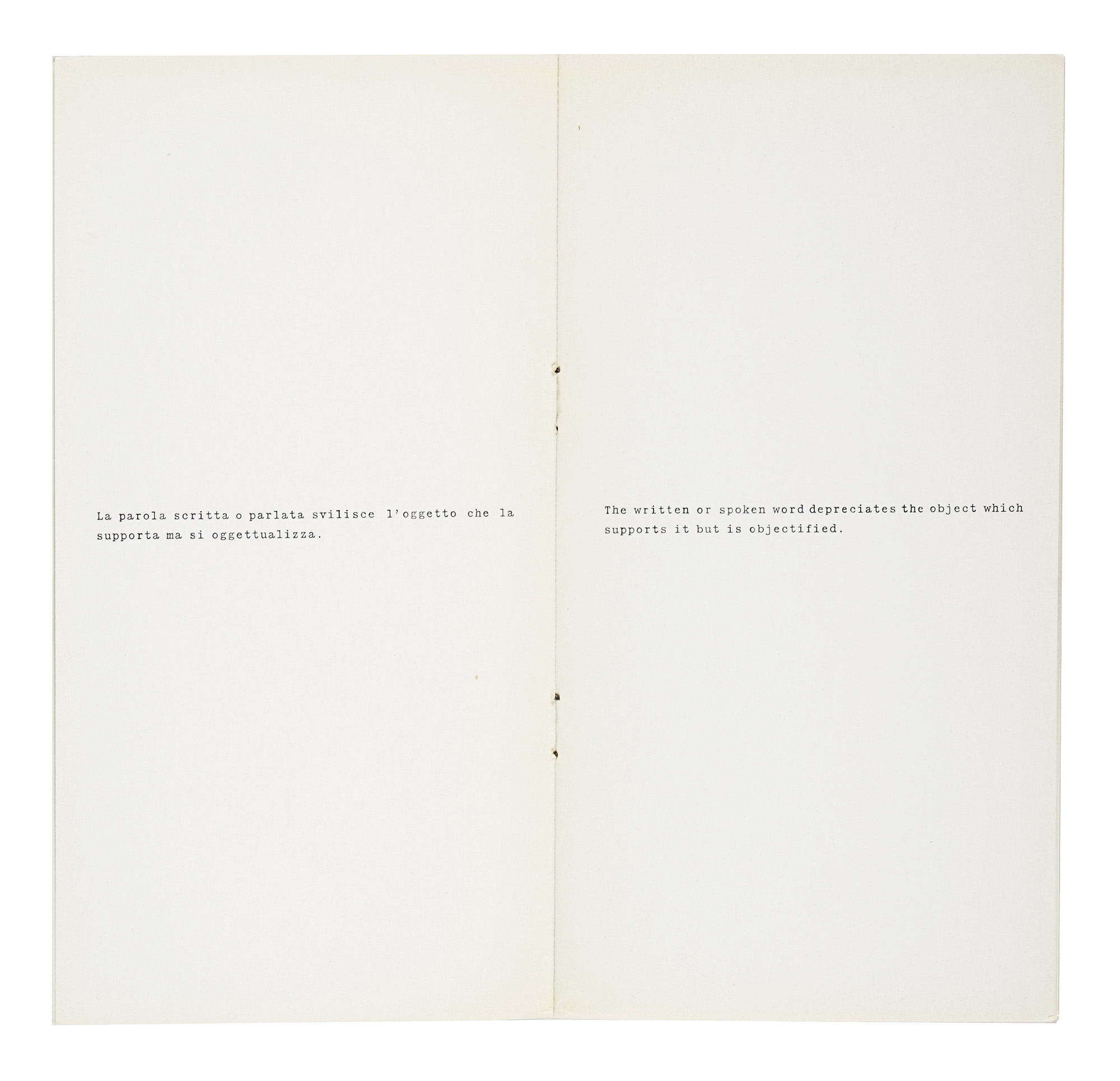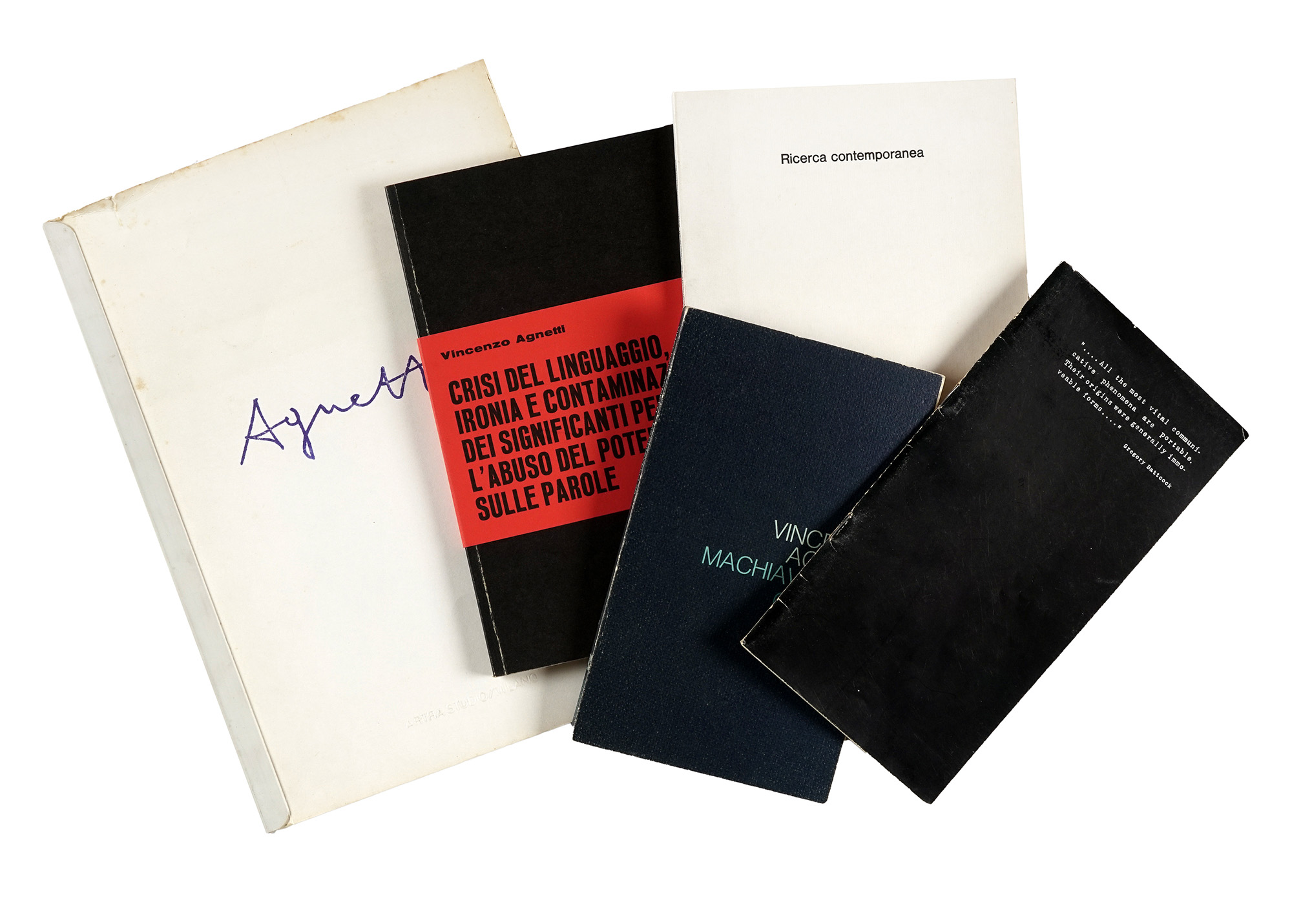 Compongono il lotto: 1) Agnetti Vincenzo, Tesi. Milano: Prearo, 1972. Con una dedica autografa dell'Artista datata Milano IX 1972; 2) Id., 12 opere di Antonio Calderara. Milano: Scheiwiller, 1970; 3) Id., Machiavelli 30. Milano: Ugo Guanda, 1978; 4) Id., 14 proposizioni sul linguaggio portatile... s.d.e. [i.e. 1972]; 5) Agnetti. Milano: Artra studio, s.d. [i.e. 1978 ca.]. (5) Vincenzo Agnetti è stato uno dei protagonisti più originali e rigorosi dell'arte concettuale italiana. La sua ricerca si è sviluppata al crocevia tra linguaggio, tecnologia e memoria, dando forma a un corpus di opere in cui la parola diventa immagine e il pensiero si fa materia. Dopo una formazione tra Accademia di Brera e conservatorio, Agnetti si avvicina inizialmente al Gruppo del Cenobio, per poi allontanarsene e intraprendere un percorso personale segnato da un forte interesse per la semiotica, la filosofia e la comunicazione. La sua produzione spazia da poesie visive e testi concettuali a opere su supporti inusuali come il feltro nero inciso, la bachelite o il vetro, su cui incide frasi e formule criptiche, quasi aforismi sospesi nel tempo, testimoniando un'attitudine sperimentale unica, che ha saputo unire estetica e logica, ironia e rigore formale. La pratica di Agnetti si fonda su un profondo interrogarsi sui meccanismi della percezione e della conoscenza, in un costante slittamento tra significato e significante. L'artista mette in discussione la nozione stessa di autore, di originalità e di opera, anticipando temi oggi centrali nel dibattito teorico e curatoriale.