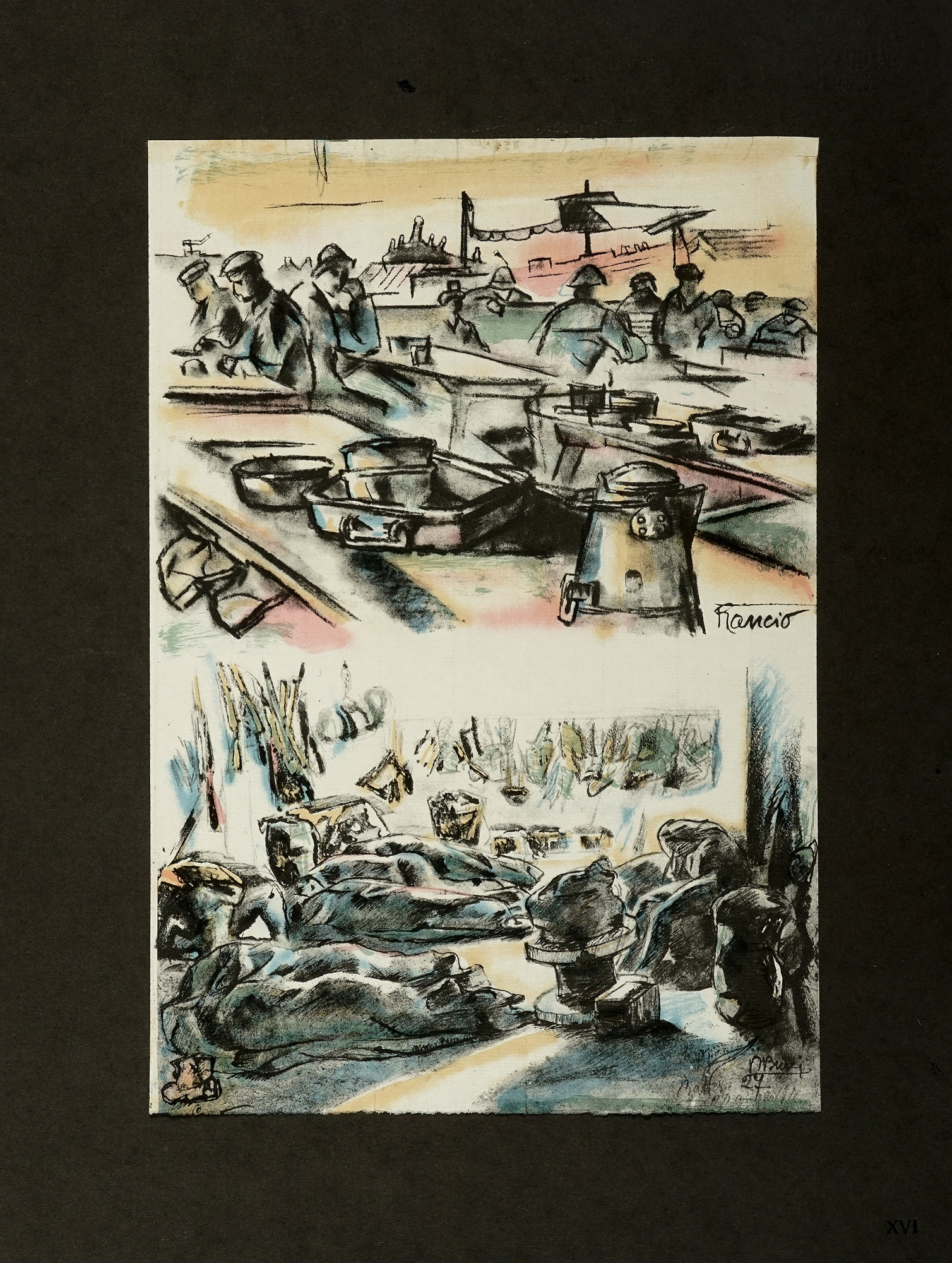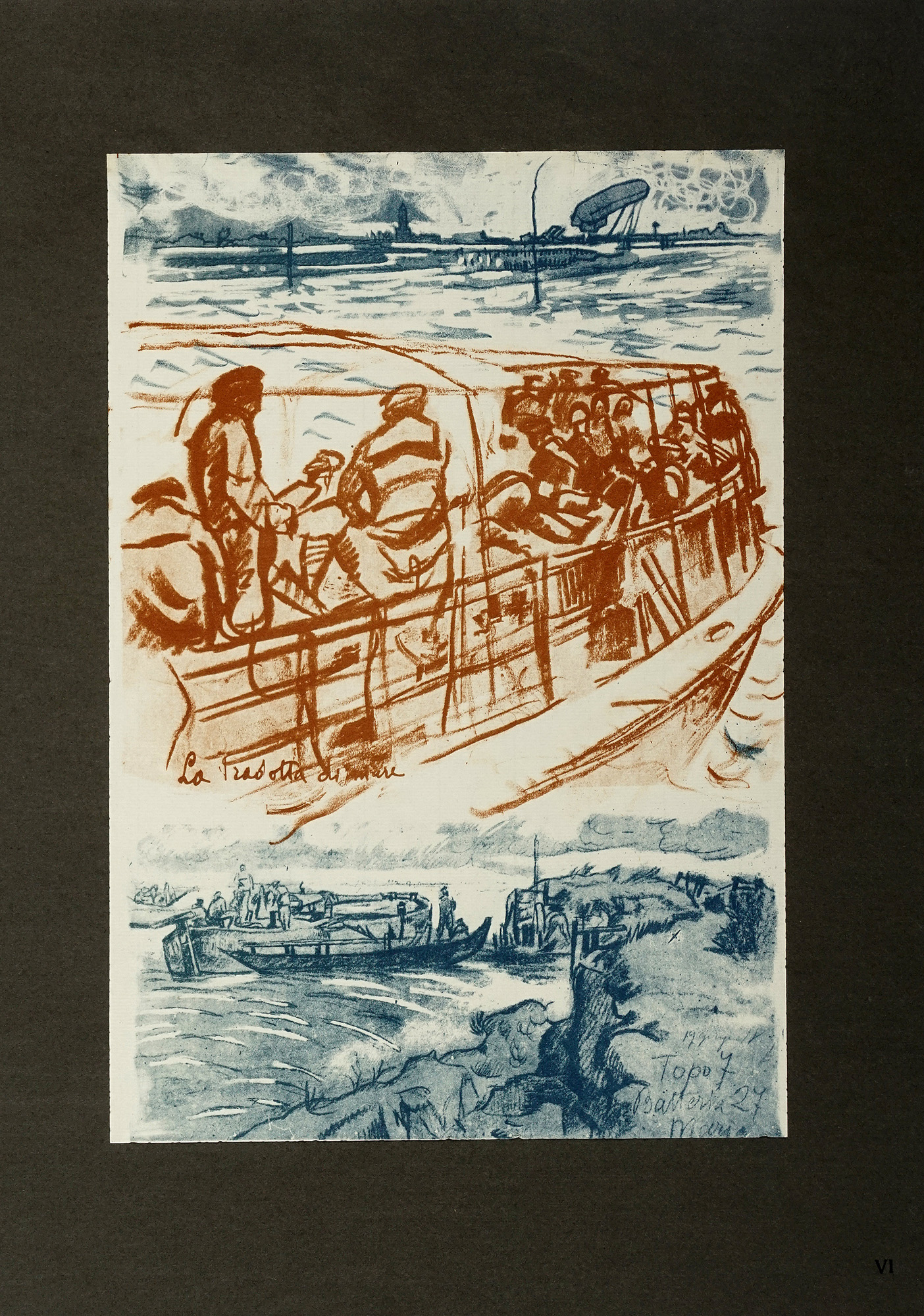 In-folio (mm 450x340). [6] carte di testo + 50 tavole a colori sciolte, stampate su carta forte e applicate, ciascuna, su cartoncino in barbe. Una macchia al frontespizio, altrimenti ottimo esemplare in barbe, entro cartella editoriale in piena tela con nome dell'Autore e legacci al piatto anteriore. Quest'ultima presenta macchie e ampi segni del tempo. Uno dei 200 esemplari in numeri arabi, su una tiratura complessiva di 250 copie. Marchio di possesso al frontespizio. (1) Rarissima e straordinaria opera di arte grafica italiana, realizzata durante la Prima Guerra Mondiale, che raccoglie le impressioni e gli schizzi dell'artista Anselmo Bucci, soldato della Marina, nelle retrovie o nei porti italiani. Le litografie illustrano scene di vita militare, paesaggi urbani bombardati, figure in divisa e attimi di pausa, con uno stile espressivo e a tratti simbolista.