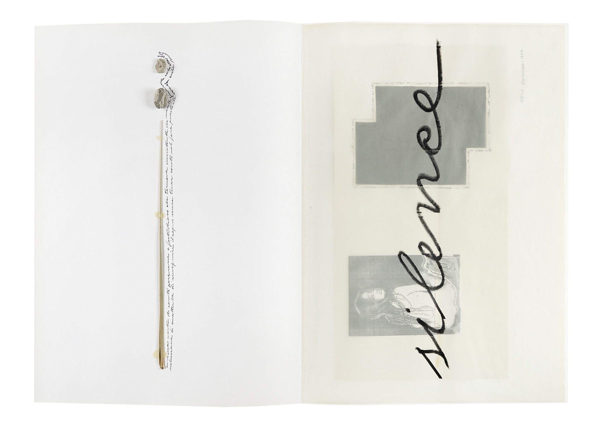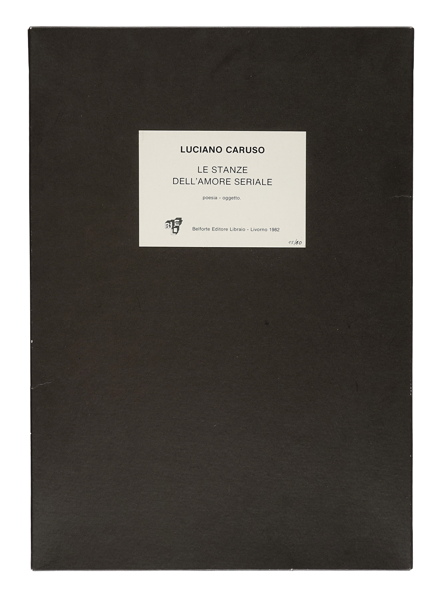 In-folio (mm 490x395). Esemplare a bifogli sciolti, con [6] carte di testo e due splendide opere in tecnica mista di Luciano Caruso su bifolio (collage, china e sasso) firmati, datati e numerati. Il tutto entro custodia editoriale con titoli su tassello al piatto anteriore. Uno strappo al taglio inferiore del piatto anteriore, per il resto ottima conservazione. Edizione di 60 esemplari firmati e numerati al colophon, con una poesia di Luciano Caruso del 1966 e intervento di Anna Oberto, prefazione di Marco Fagioli. (1)