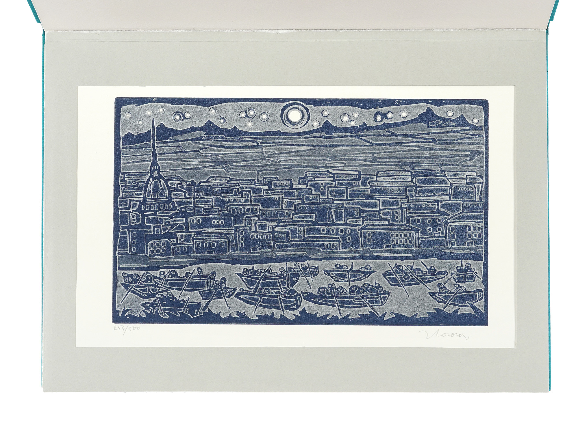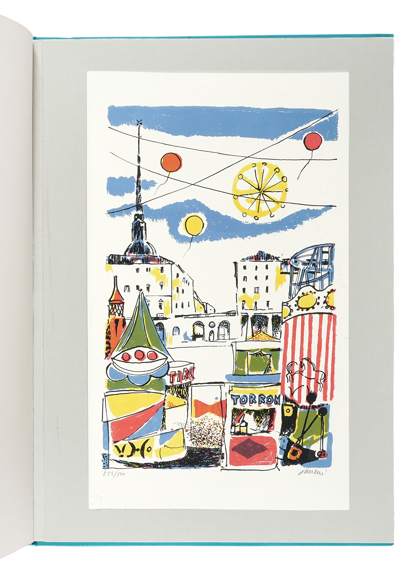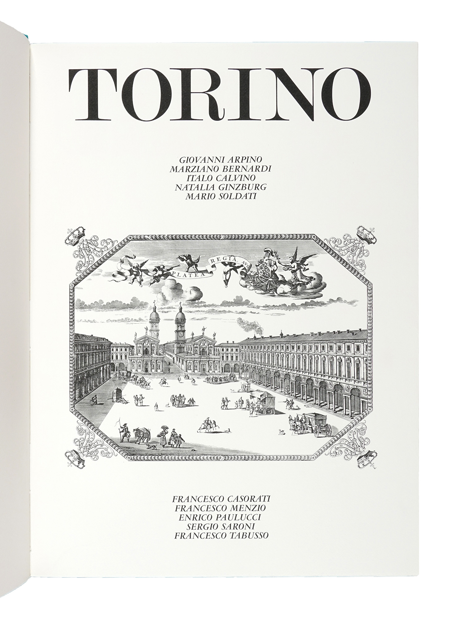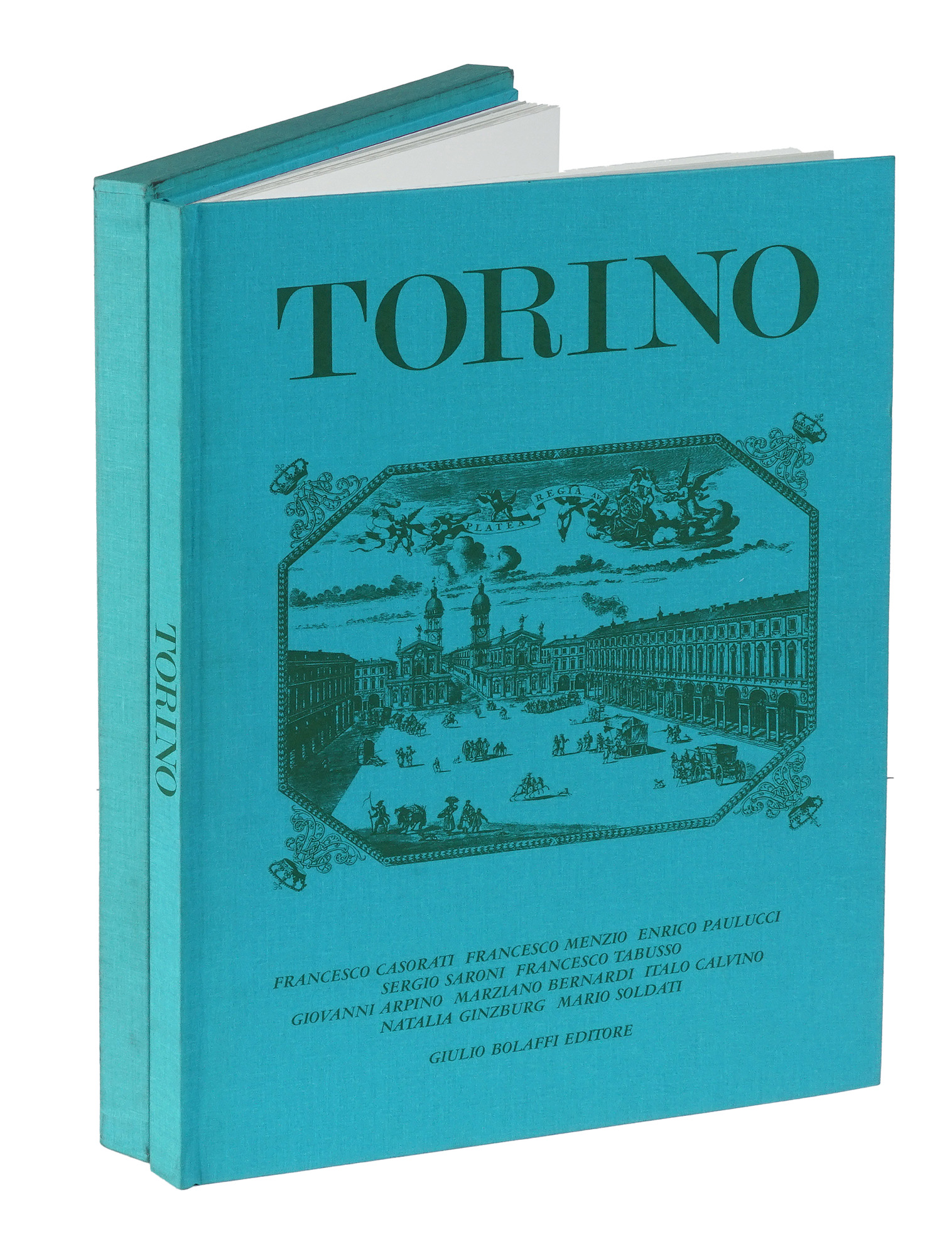 In-folio (mm 480x340). Ottimo esemplare in barbe, con un'acquaforte di Francesco Casorati, una litografia di Francesco Menzio, una litografia di Enrico Paulucci, un'acquaforte di Sergio Saroni, un'acquaforte di Francesco Tabusso, ciascuna, entro passe-partout, recante firma e numerazione a matita e il timbro a secco dell'Editore. Legatura in tela turchese con titolo e illustrazione al piatto anteriore raffigurante la veduta di Piazza San Carlo tratta dal Theatrum Sabaudiae. Cofanetto originale in piena tela, illustrato ai piatti. Macchie ai piatti, altrimenti perfetto stato di conservazione. Tiratura di 500 esemplari numerati. (1) Pubblicazione eseguita con l'intento di far dialogare i testi di alcuni scrittori italiani con le opere di alcuni importanti artisti del Novecento. I testi sono firmati da Giovanni Arpino, Marziano Bernardi, Italo Calvino, Natalia Ginzburg, Mario Soldati. Il soggetto dell'opera è Torino, città vicina agli artisti e agli scrittori che hanno contribuito al volume.