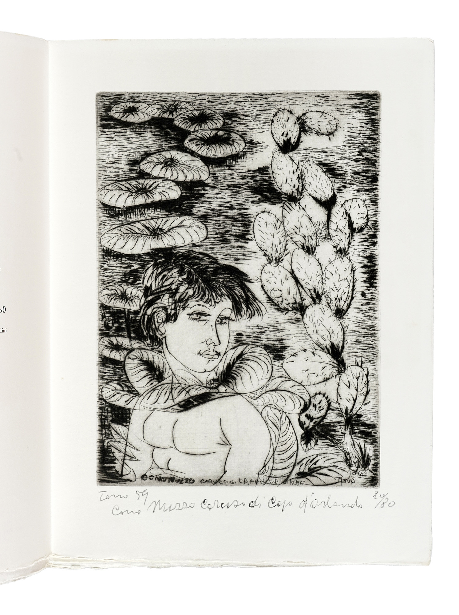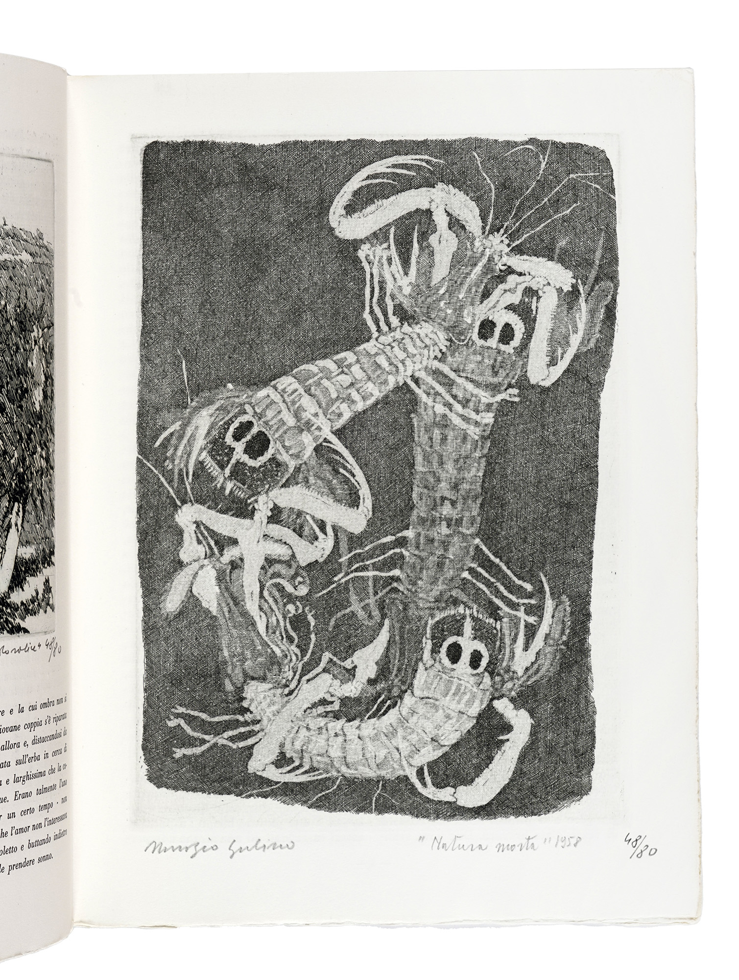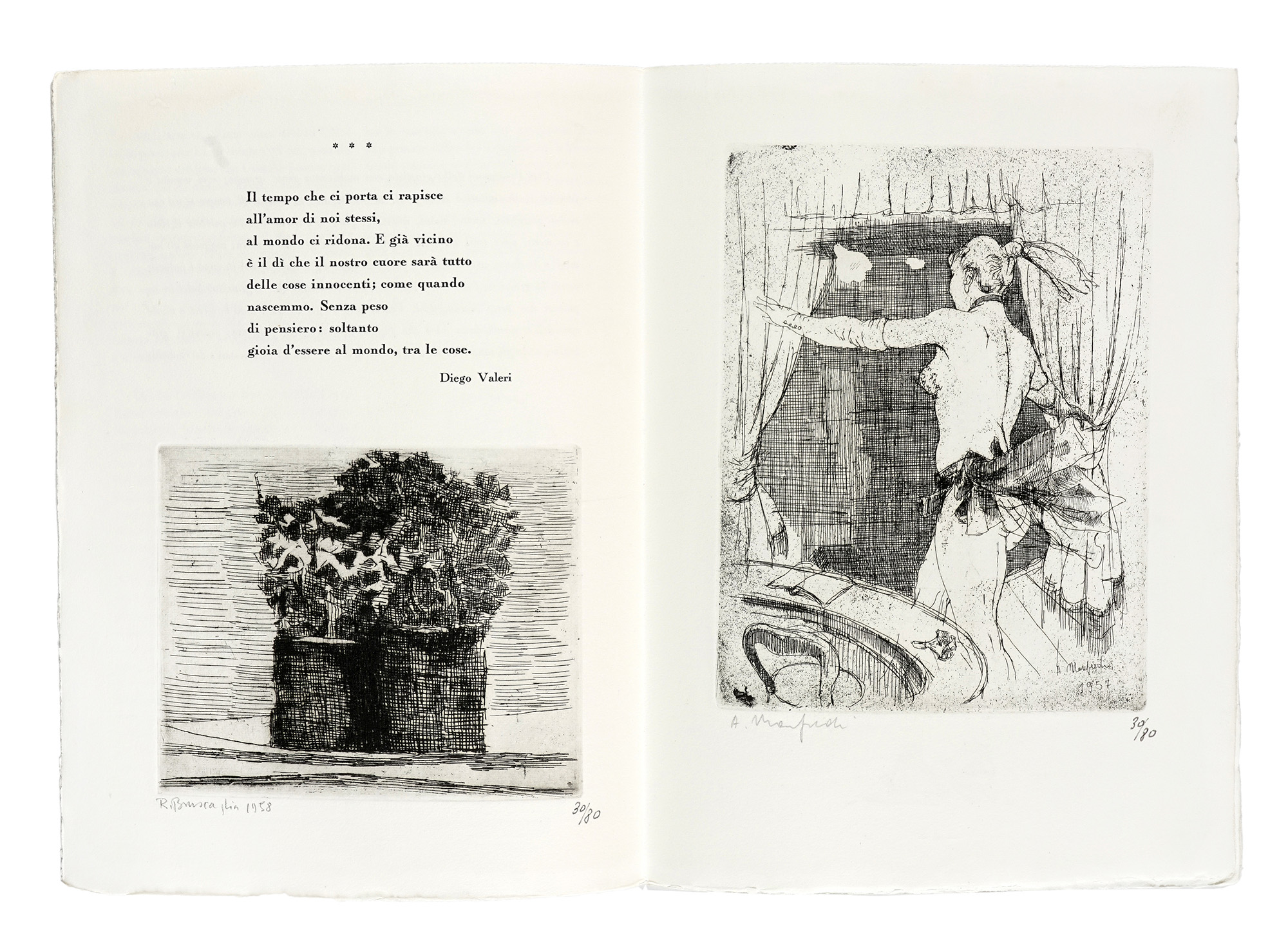 20 fascicoli in-8° (mm 250x175). Pagine 12 ciascuno. Dal n. 1 anno I del maggio 1957 a n. 4 Anno V del dicembre 1961. Ottimo esemplare in barbe, a bifogli sciolti, con le acqueforti originali di Castellani, Bartolini, Ciarrocchi, Diamantini, Mandredi, Scorza, Paulucci ed altri, alcune delle quali a piena pagina, protette da velina, tutte numerate e firmate a matita dagli Artisti. Tutti i fascicoli, ad eccezione del n. 2 dell'Anno I, appartengono alla rara tiratura in 50 (poi 80) esemplari, con le acqueforti originali. Il tutto perfettamente conservato entro cofanetto in cartonato, con tassello al dorso, che presenta lievi segni di usura. (20) Rarissima e gloriosa rivista, a tiratura limitatissima, con interessanti scritti di eminenti letterati e con incisioni originali di noti artisti italiani.