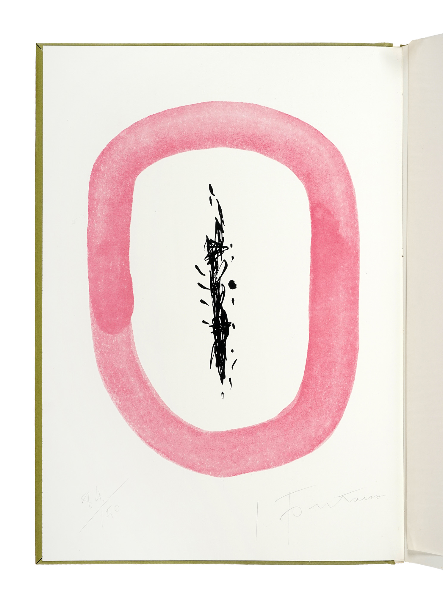 In-folio (mm 490x342). Carte [14] di testo + 6 tavole in nero firmate in lastra e 1 fotolitografia a colori in antiporta, numerata 85/150 e firmata a matita da Lucio Fontana, protetta da velina. Arrossatura alla velina e una lieve abrasione della carta ad una delle tavole, altrimenti ottima copia. Brossura editoriale con sovraccoperta in carta verde chiaro, con titoli in nero al piatto. Entro cofanetto in pieno cartonato, con minimi segni di usura. Esemplare senza numerazione di una tiratura complessiva di 170, uno dei 150 in brossura. (1) Esemplare estremamente raro a trovarsi completo e in ottime condizioni, in cui Fontana offre una reinterpretazione contemporanea delle fiabe di La Fontaine, tramite illustrazioni che spaziano tra ritratti, forme astratte e concetti spaziali, mantenendo l'essenzialità del suo linguaggio visivo.