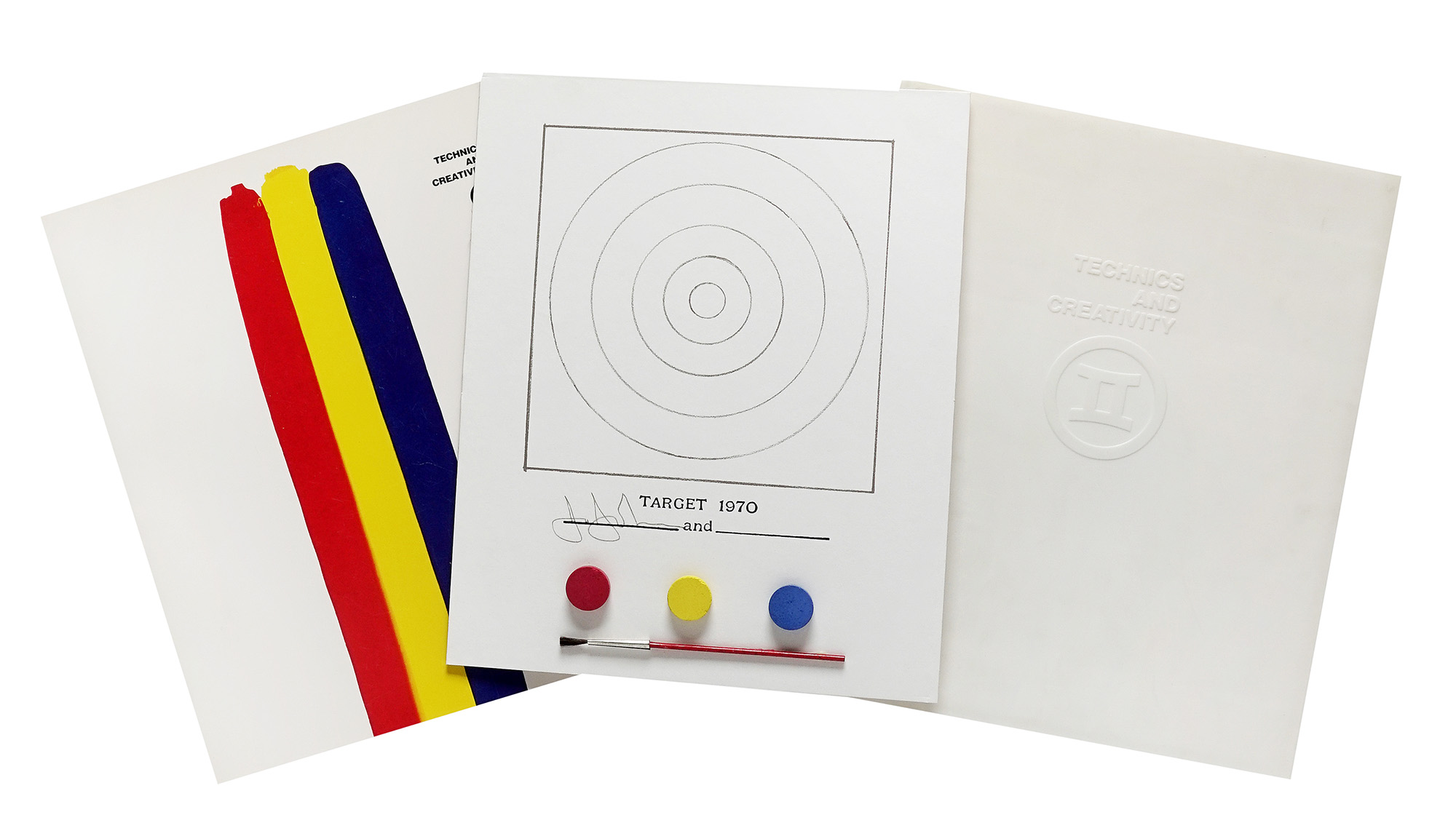 1 cofanetto editoriale in plastica (mm 270x225) contenente 1 multiplo di Jasper Johns, costituito da tre pasticche di tempera colorata e da un pennello applicati ad una litografia offset originale dell'Artista - protetto da gommapiuma editoriale - e Technics and Creativity (Los Angeles: Edizione Gemini, 1971) un catalogo ragionato di stampe e multipli, per il quale l'opera è stata commissionata. (1) Opera realizzata per una mostra del 1971 al MoMA di New York.