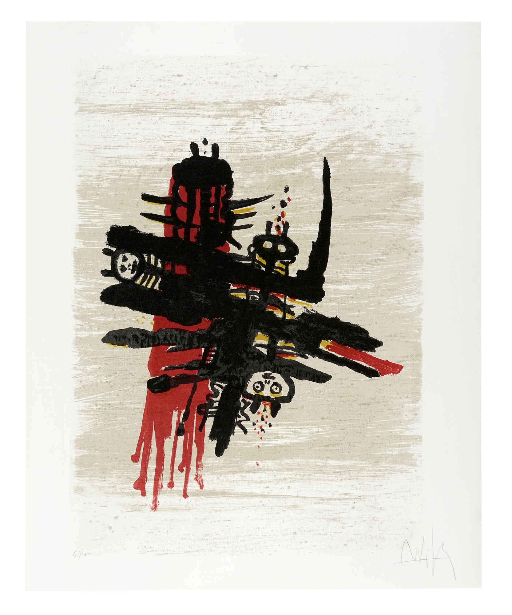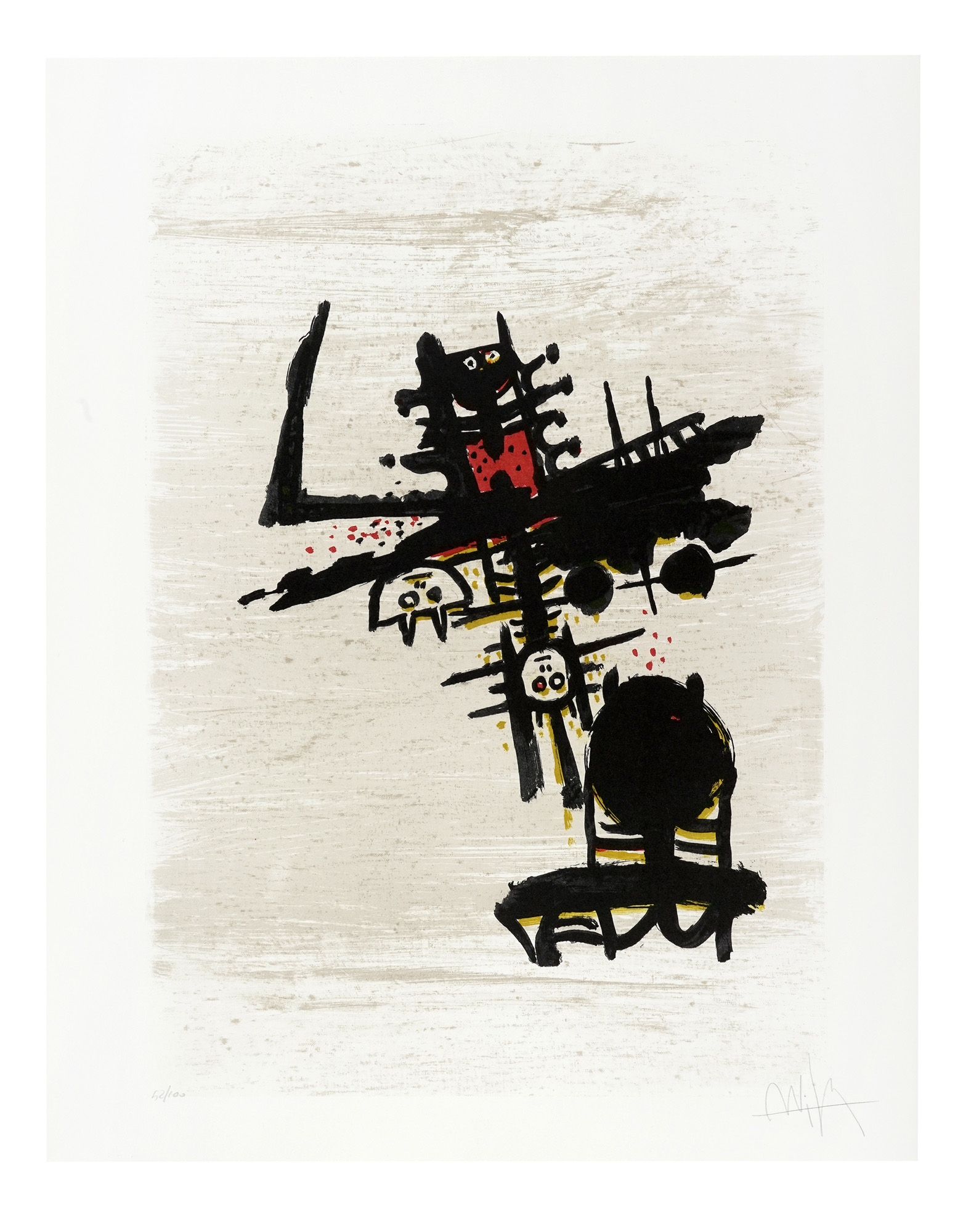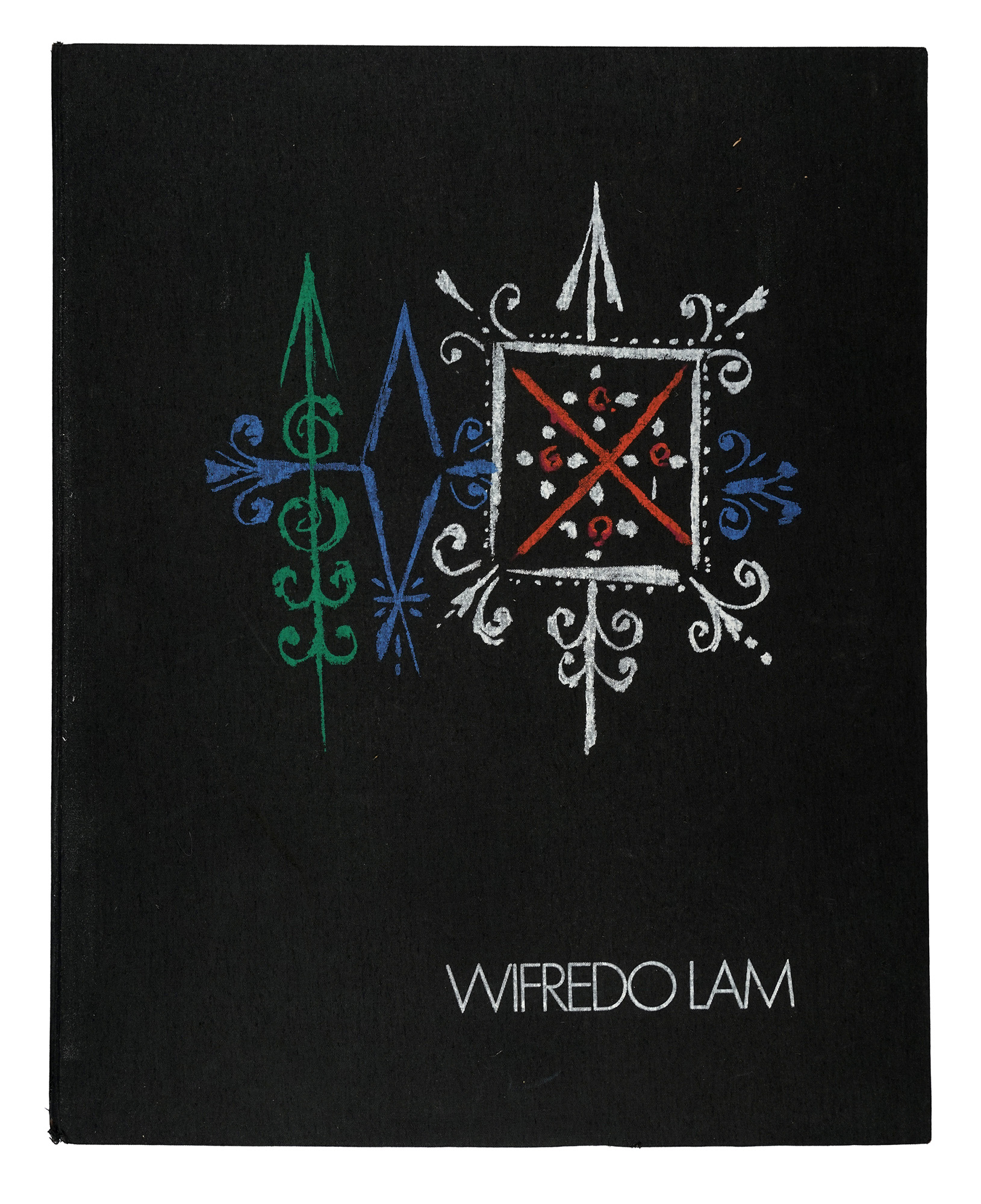In-folio massimo (mm 800x650). Con [1] carta di frontespizio, 1 ritratto dell'Artista applicato su cartoncino nero e protetto da velina, [3] carte di testo, 1 tavola in bianco e nero, [5] carte di testo su cartoncino nero, protette da velina e 6 bellissime litografie a colori di Wilfredo Lam, numerate a matita in basso a sinistra e firmate in basso a destra, protette anch'esse da pergamino. Il tutto, sciolto, entro cofanetto editoriale in piena tela, con firma dell'Artista e illustrazione a colori al piatto anteriore. Difetti alla cerniera anteriore e alle cuffie; tracce di polvere ai piatti. Uno dei 100 esemplari in numeri arabi, su una tiratura complessiva di 125 copie, numerate e firmate al colophon dall'Editore. (1) Opera straordinaria, rara a trovarsi completa di tutte e 6 le bellissime litografie di Wilfredo Lam.