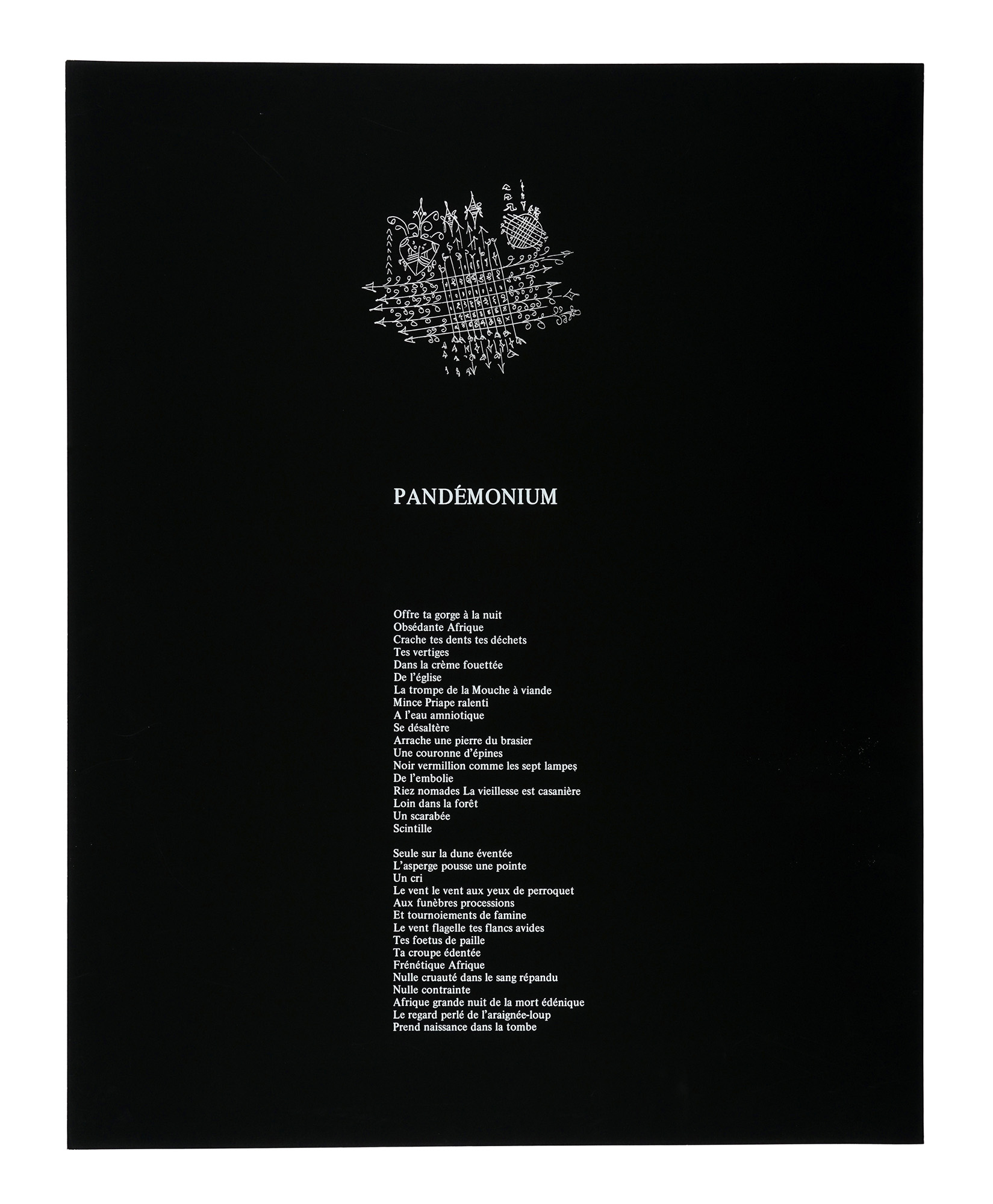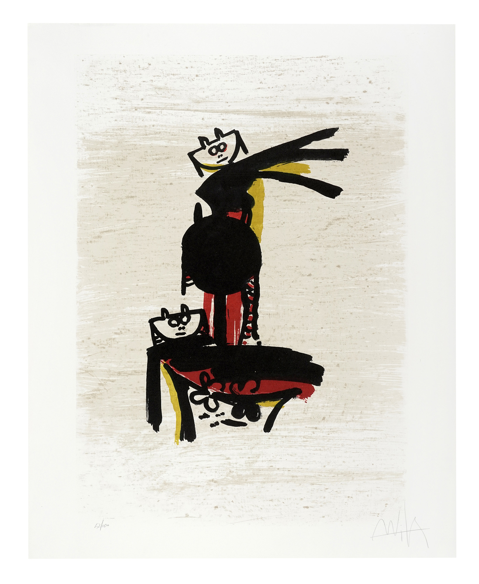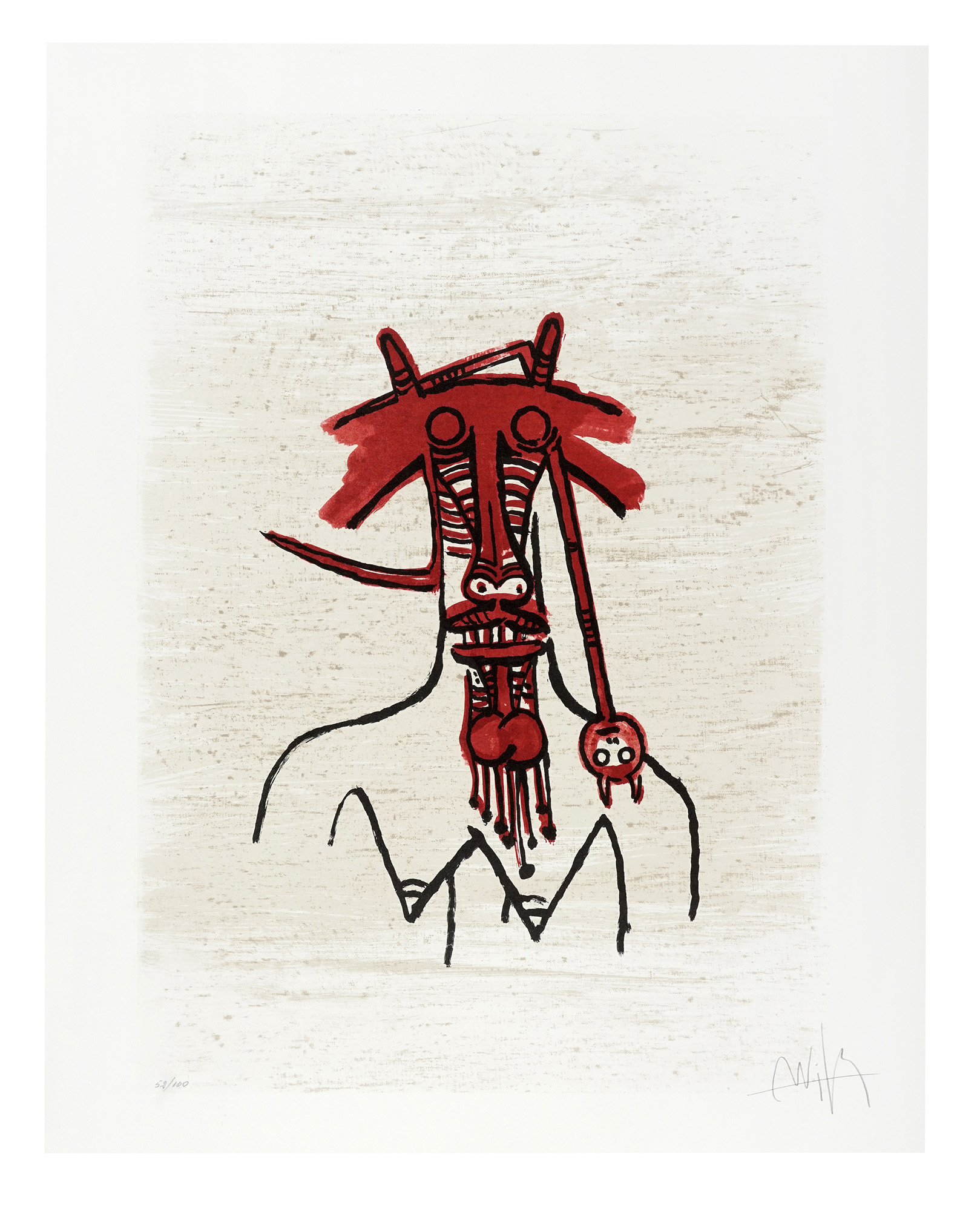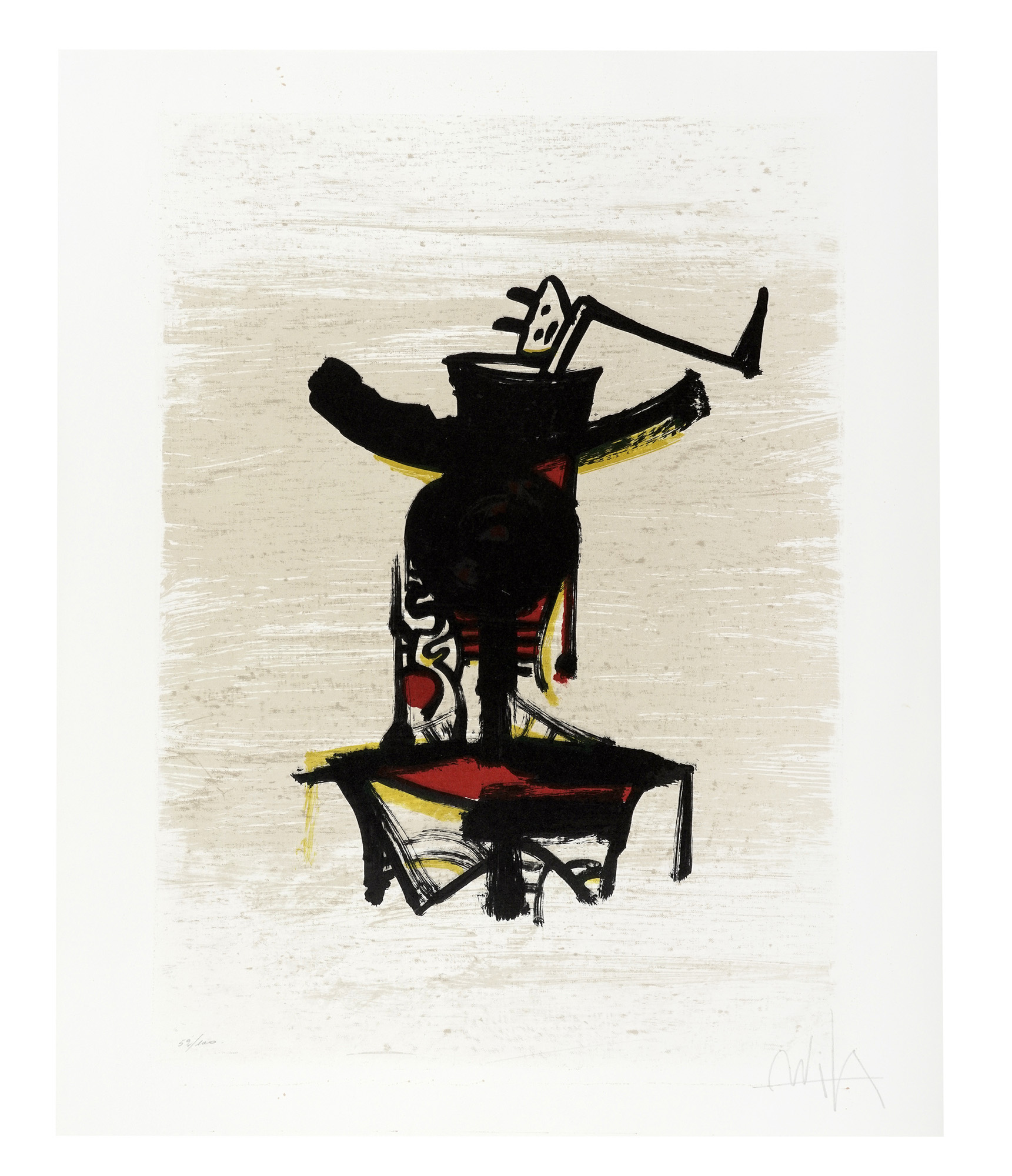 In-folio massimo (mm 800x650). Con [1] carta di frontespizio, 1 ritratto dell'Artista applicato su cartoncino nero e protetto da velina, [3] carte di testo, 1 tavola in bianco e nero, [5] carte di testo su cartoncino nero, protette da velina e 6 bellissime litografie a colori di Wilfredo Lam, numerate a matita in basso a sinistra e firmate in basso a destra, protette anch'esse da pergamino. Il tutto, sciolto, entro cofanetto editoriale in piena tela, con firma dell'Artista e illustrazione a colori al piatto anteriore. Difetti alla cerniera anteriore e alle cuffie; tracce di polvere ai piatti. Uno dei 100 esemplari in numeri arabi, su una tiratura complessiva di 125 copie, numerate e firmate al colophon dall'Editore. (1) Opera straordinaria, rara a trovarsi completa di tutte e 6 le bellissime litografie di Wilfredo Lam.