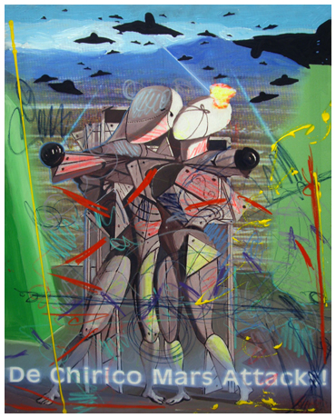 ENRICO MANERA Asmara (Eritrea) 1948 De Chirico Mars Attacks! 2000 Olio e t.m. su tela emulsionata 100 x 80. Titolo in b.; sul verso firma e data.