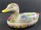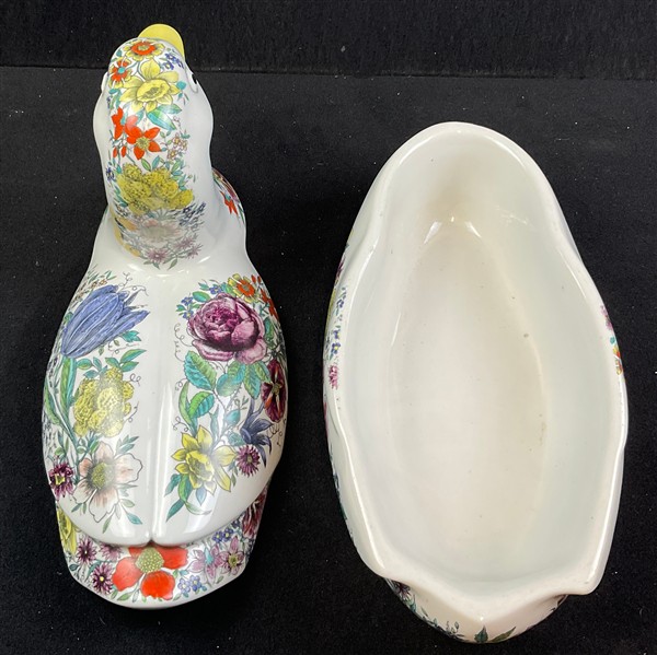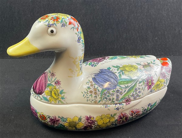 Zuppiera "Anatra Fiorata" in ceramica decorata a fiori policromi. Milano, fine anni '50/inizio anni '60. Marcata e titolata sotto la base. (cm 36x27x18)